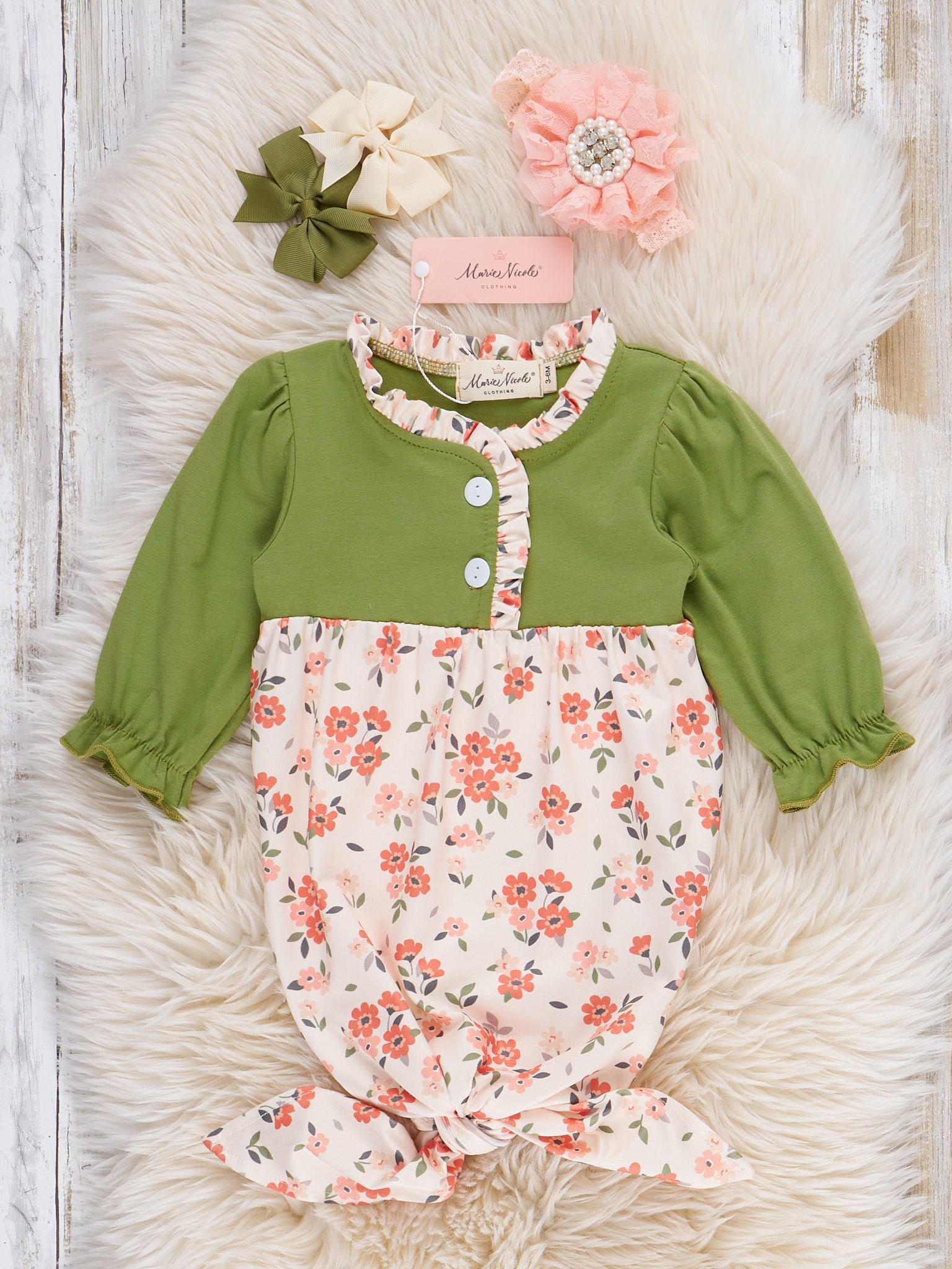 The Forest Petals Floral Knotted Gown by Marie Nicole Clothing features a cozy gathered bottom, whimsical floral print, and dainty ruffle trim on the collar. Designed with soft, stretchy fabric, this sleeper gown blends forest-inspired charm with gentle comfort for restful nights and sweet dreams.
