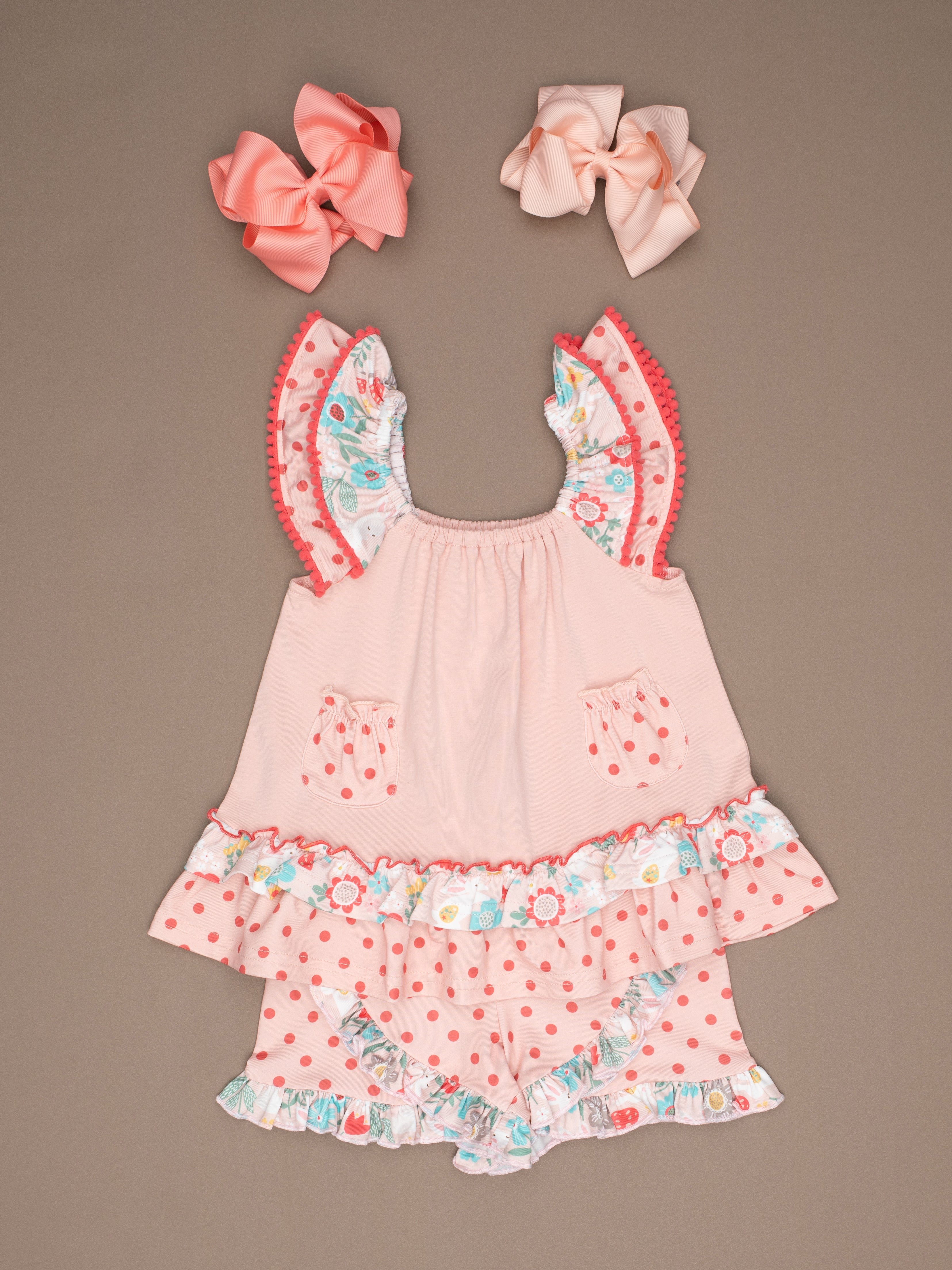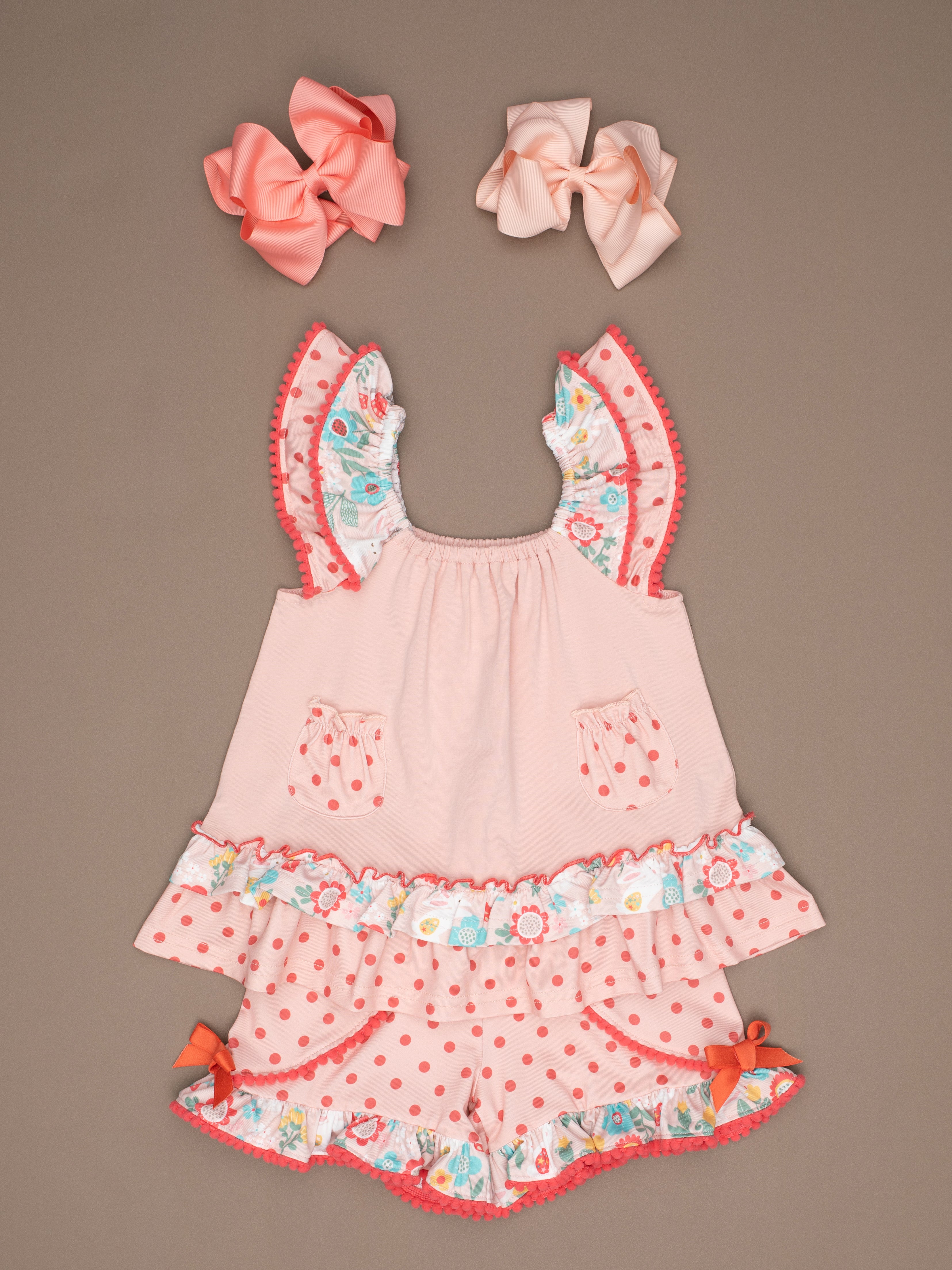 Watch all your little bunnies hop into spring with this elegant MNC exclusive collection! This high-quality collection has the softest material & is made to grow with your little one! This tunic features ruffle trim in our Lilly Belle Cottontail print, polka dot ruffle trim, pockets, pom pom trim, & can be worn on or off the shoulder.