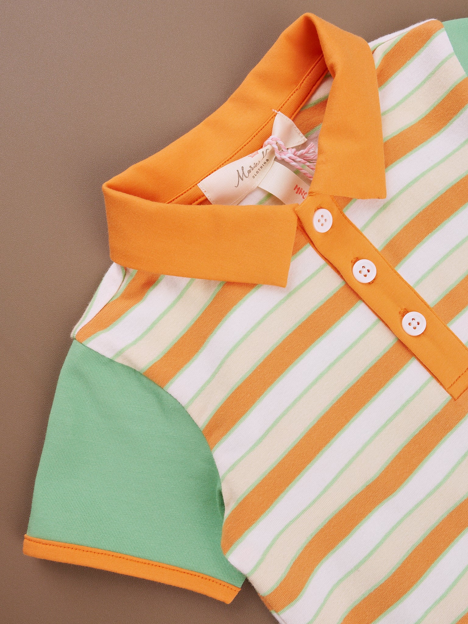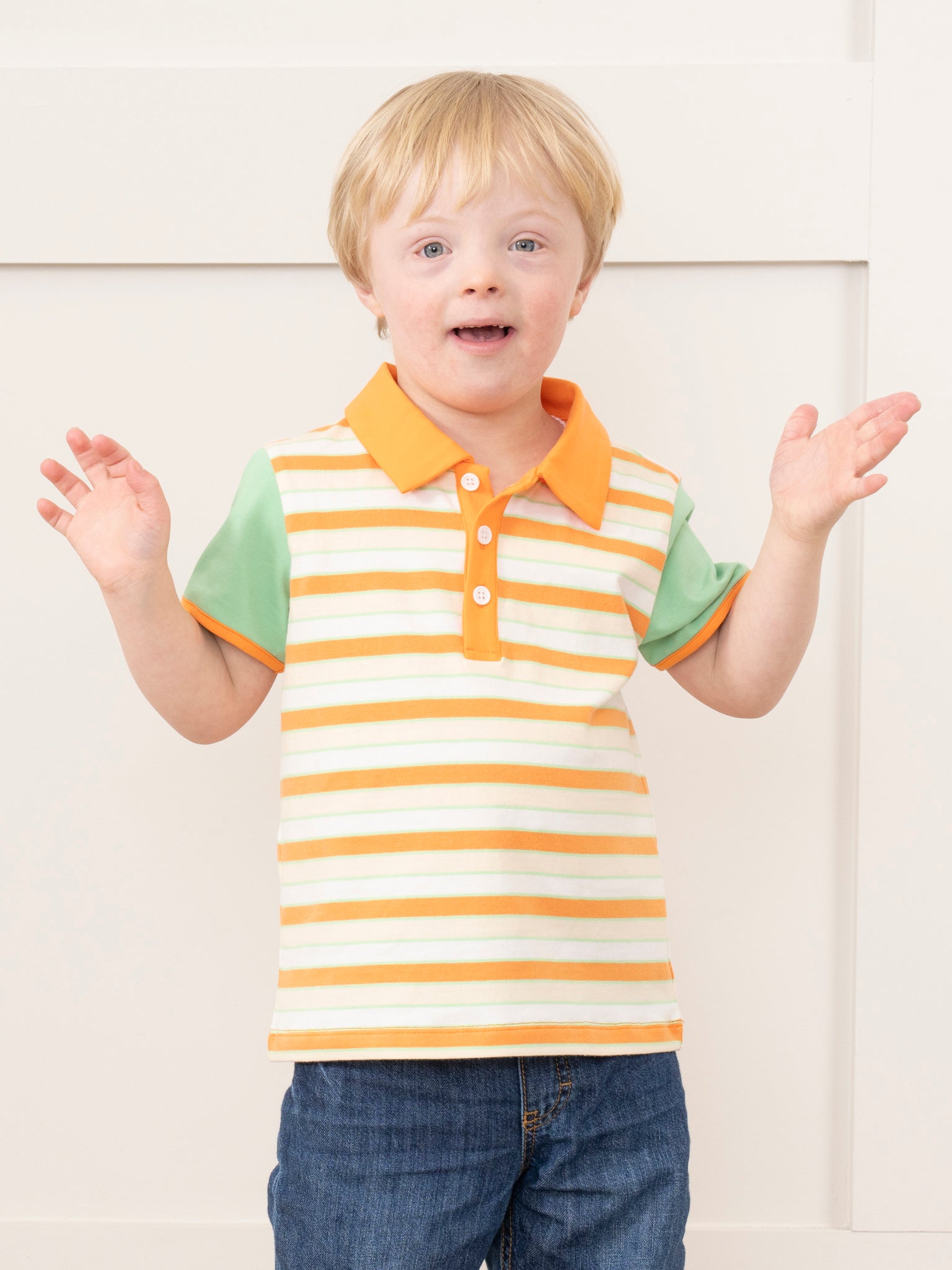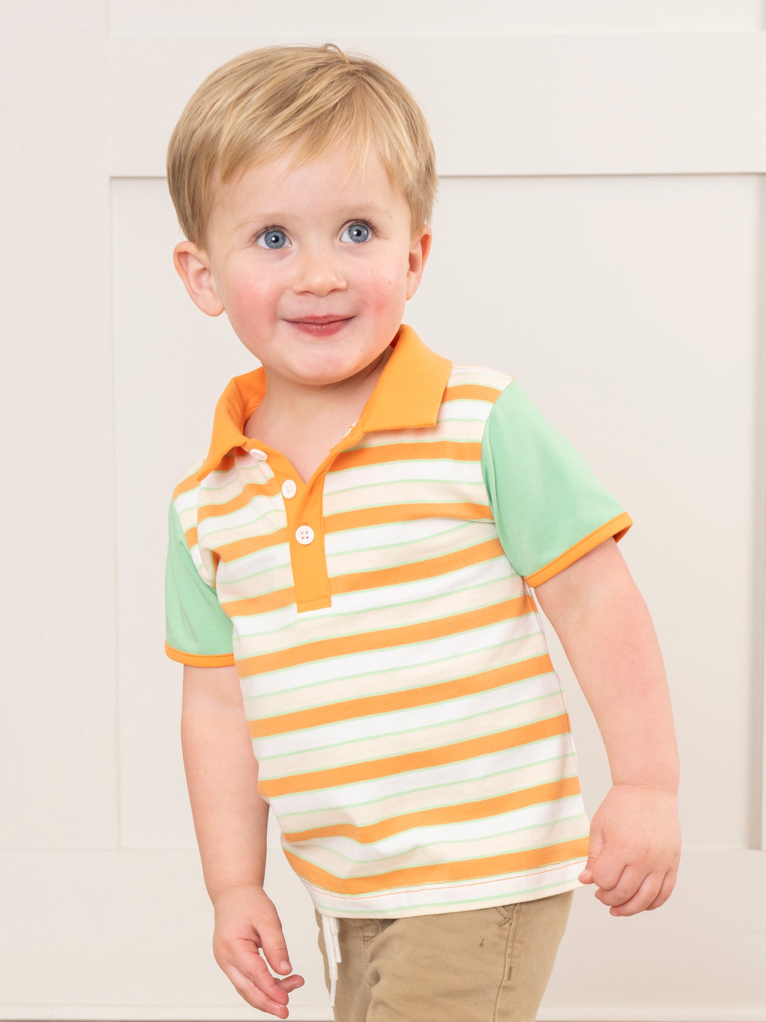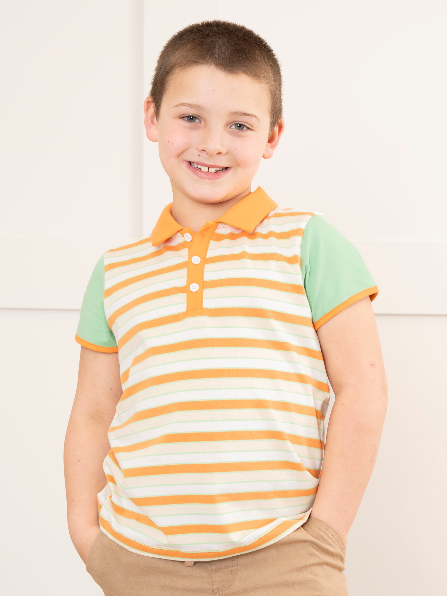 This boys' top features our Lottie Dots stripe print. The soft orange hue is perfect on the polo collar. The green raglan short sleeves add a pop of color.