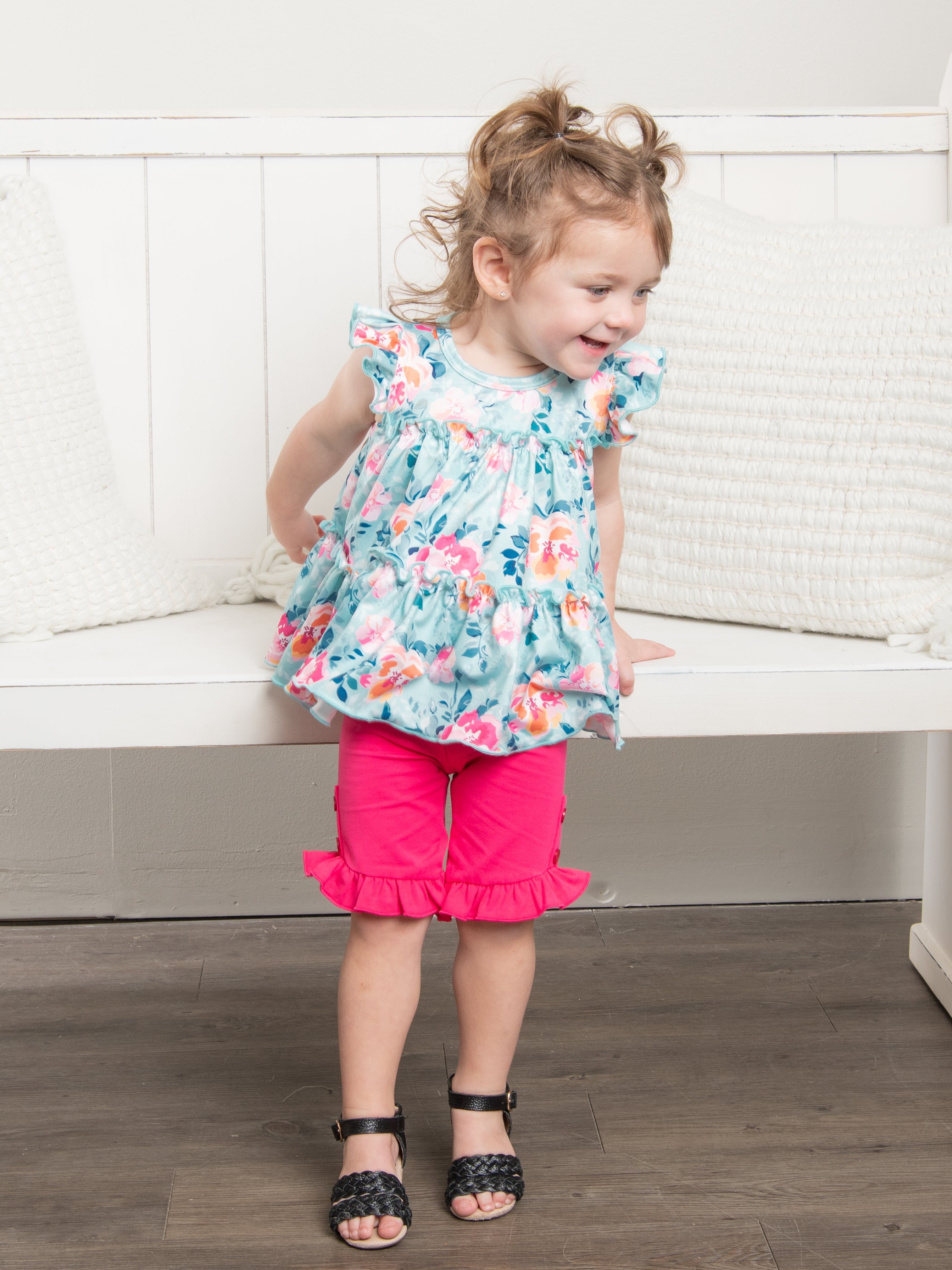 The softest cotton shorts for your sweet girls! These ruffle shorts feature decorative buttons & an elastic waistband for easy changing!