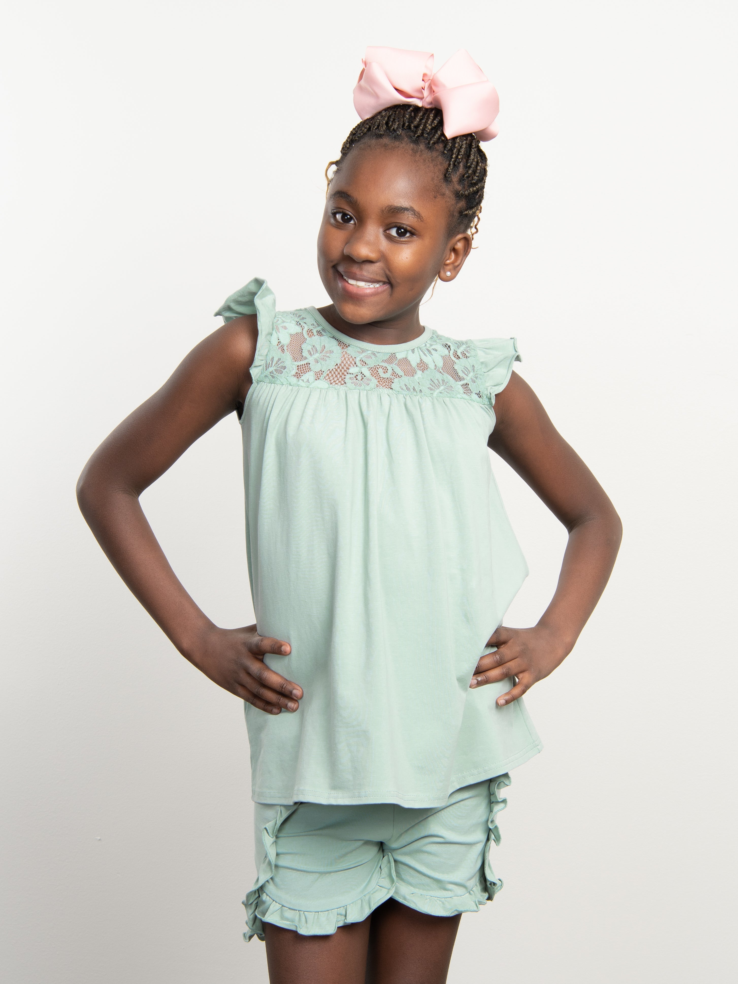 The softest cotton tunics for your sweet girls! This mint tunic feature flutter sleeves, lace details, & a keyhole at the nape of the neck for easy changing.