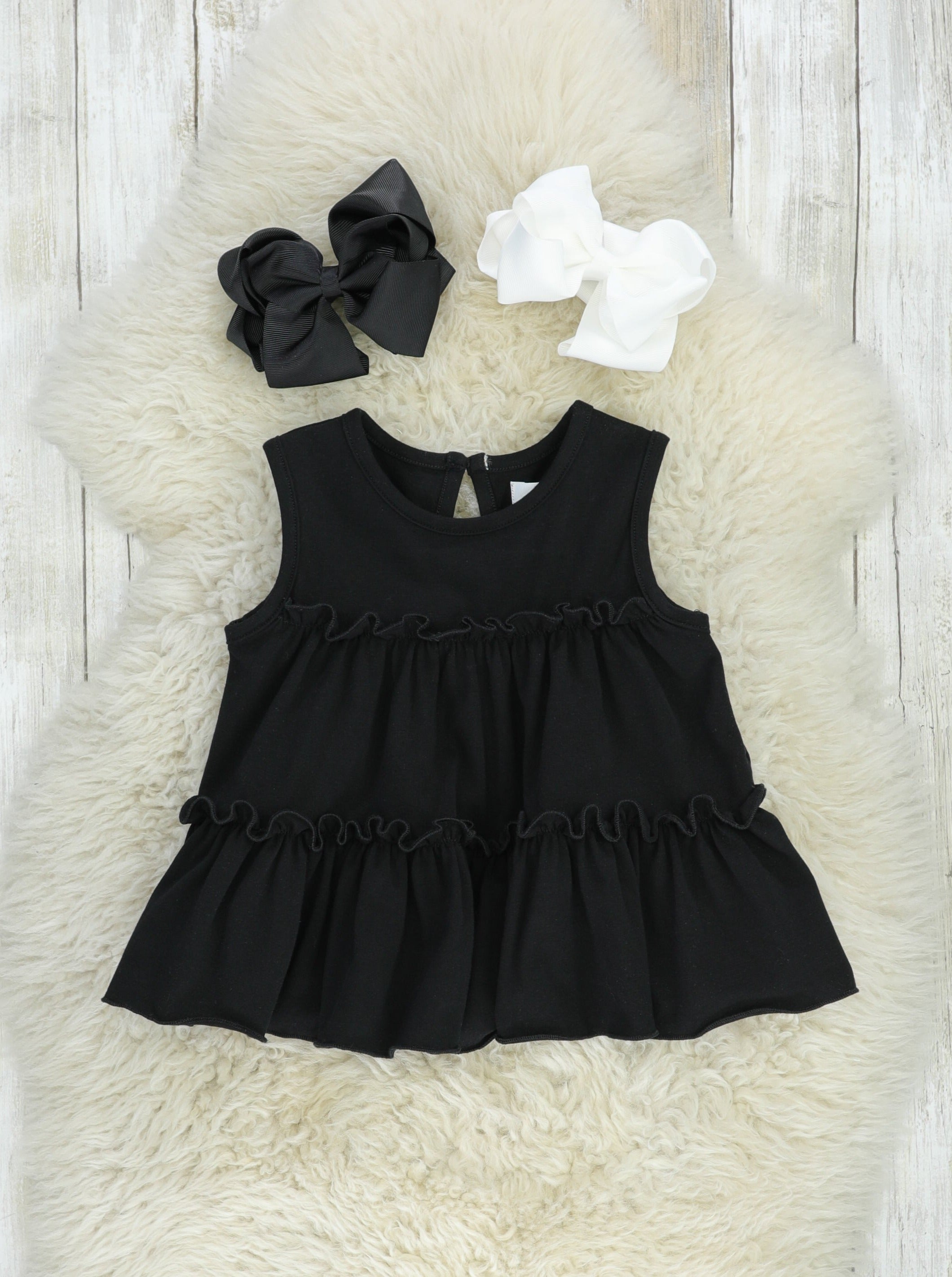 The softest cotton tanks for your sweet girls! This black tunic features tiered ruffles & keyhole at the nape of the neck for easy changing.