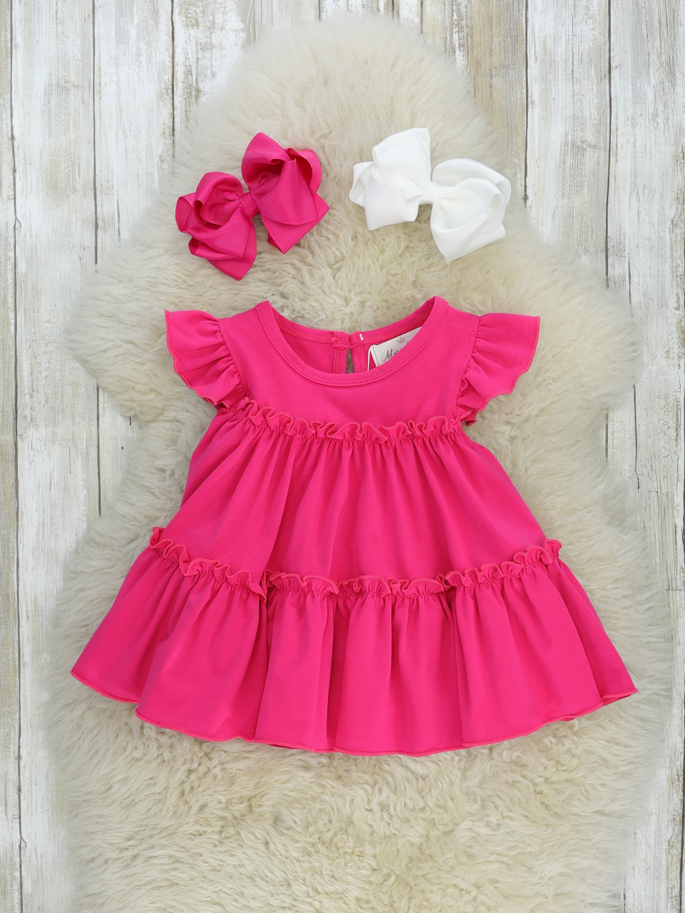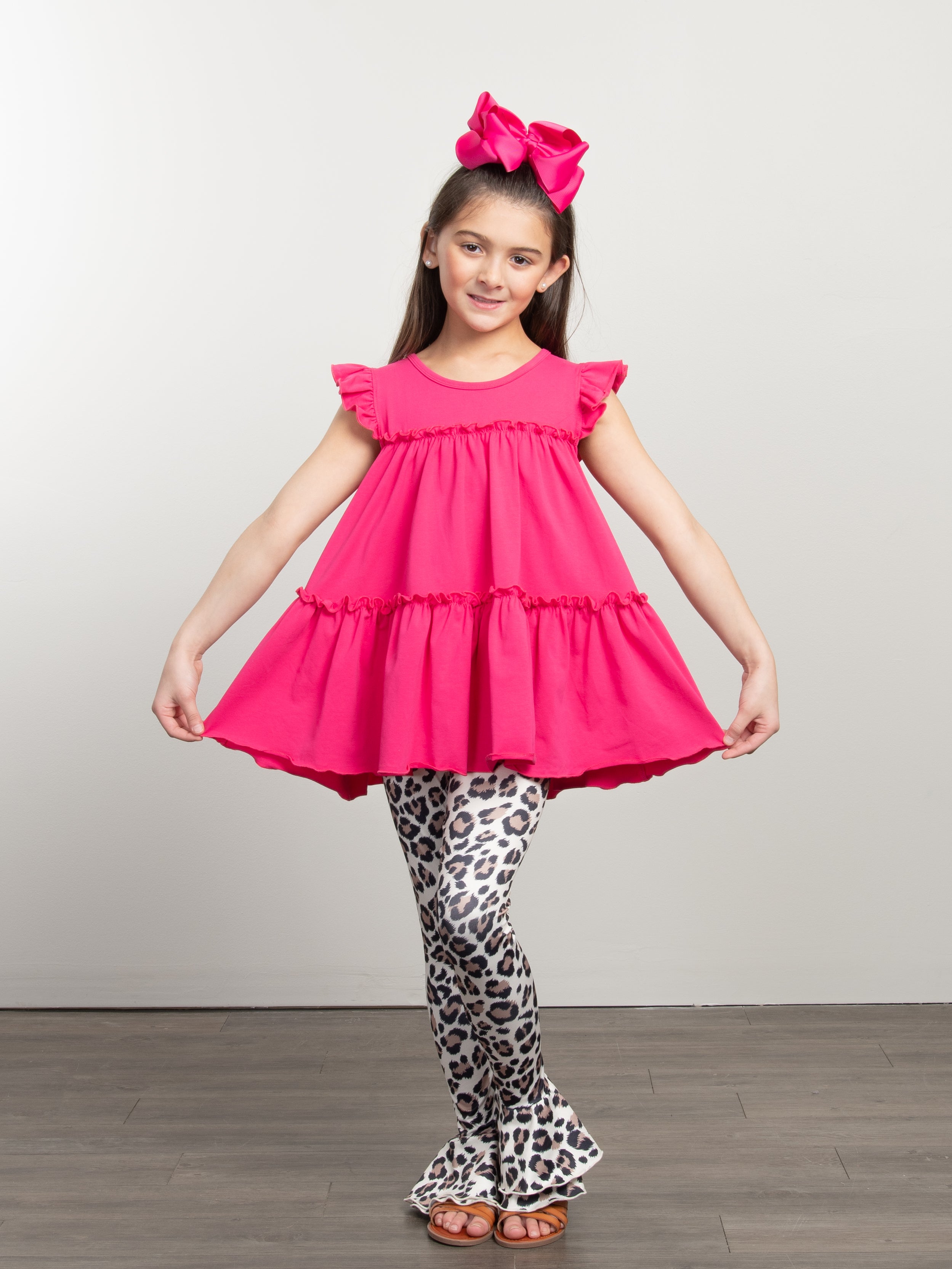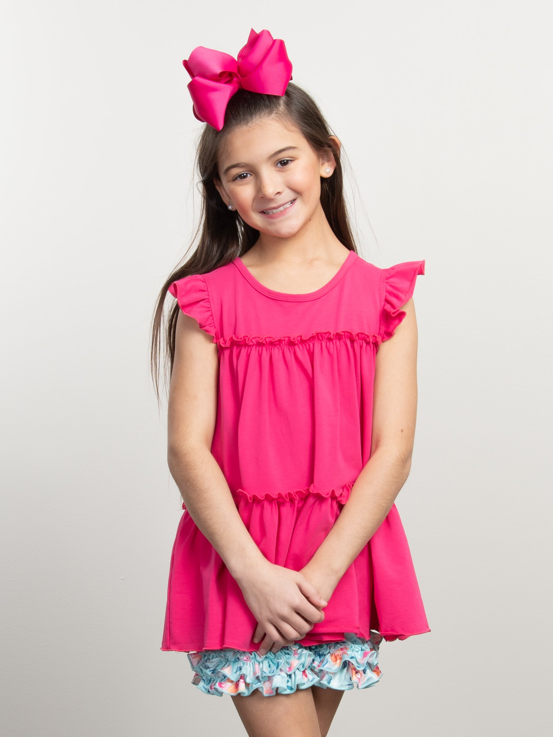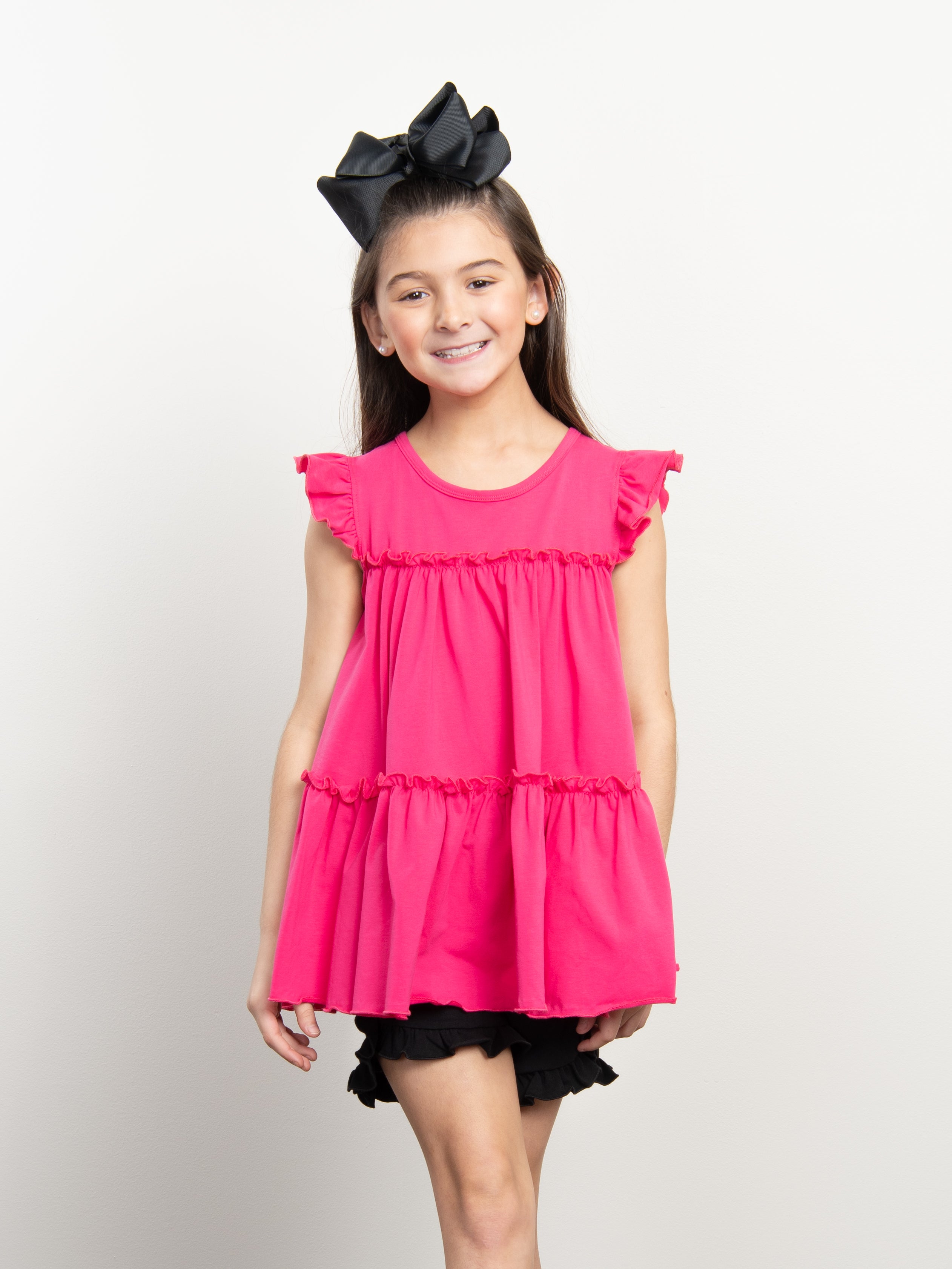 These adorable basic tunics are perfect for comfort & style! This hot pink tunic features tiered ruffles, flutter sleeves, & a keyhole at the back of the neck.