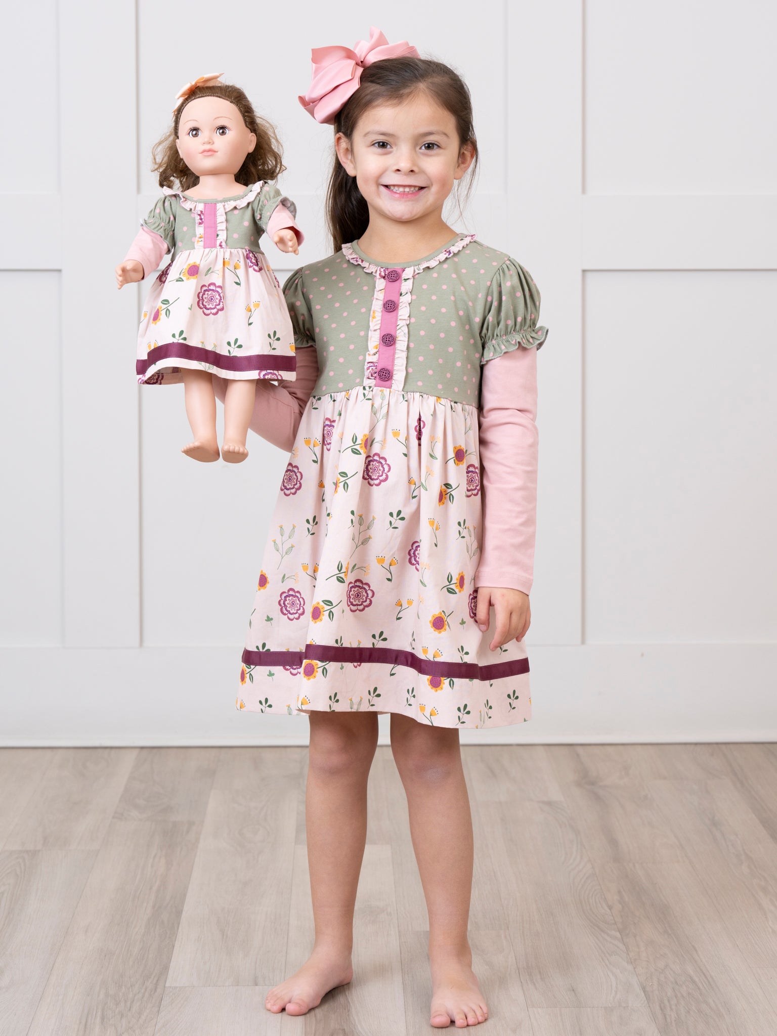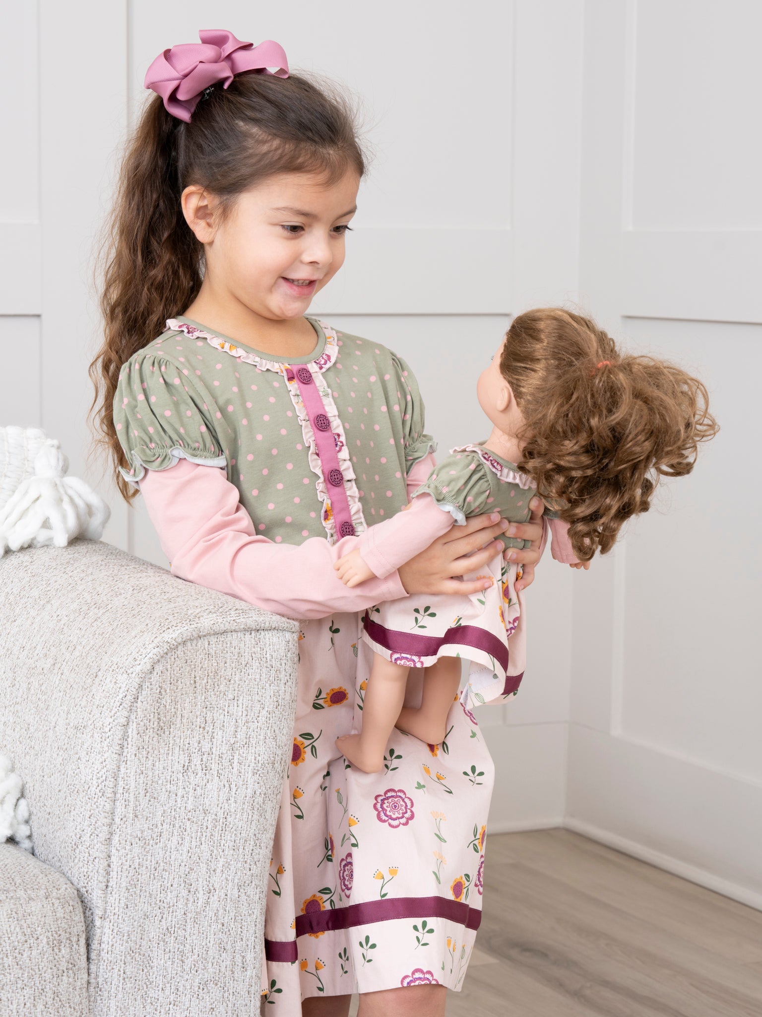 These doll outfits feature our Bloomberry Fields print, ruffle trim, & velcro backs for easy changing.