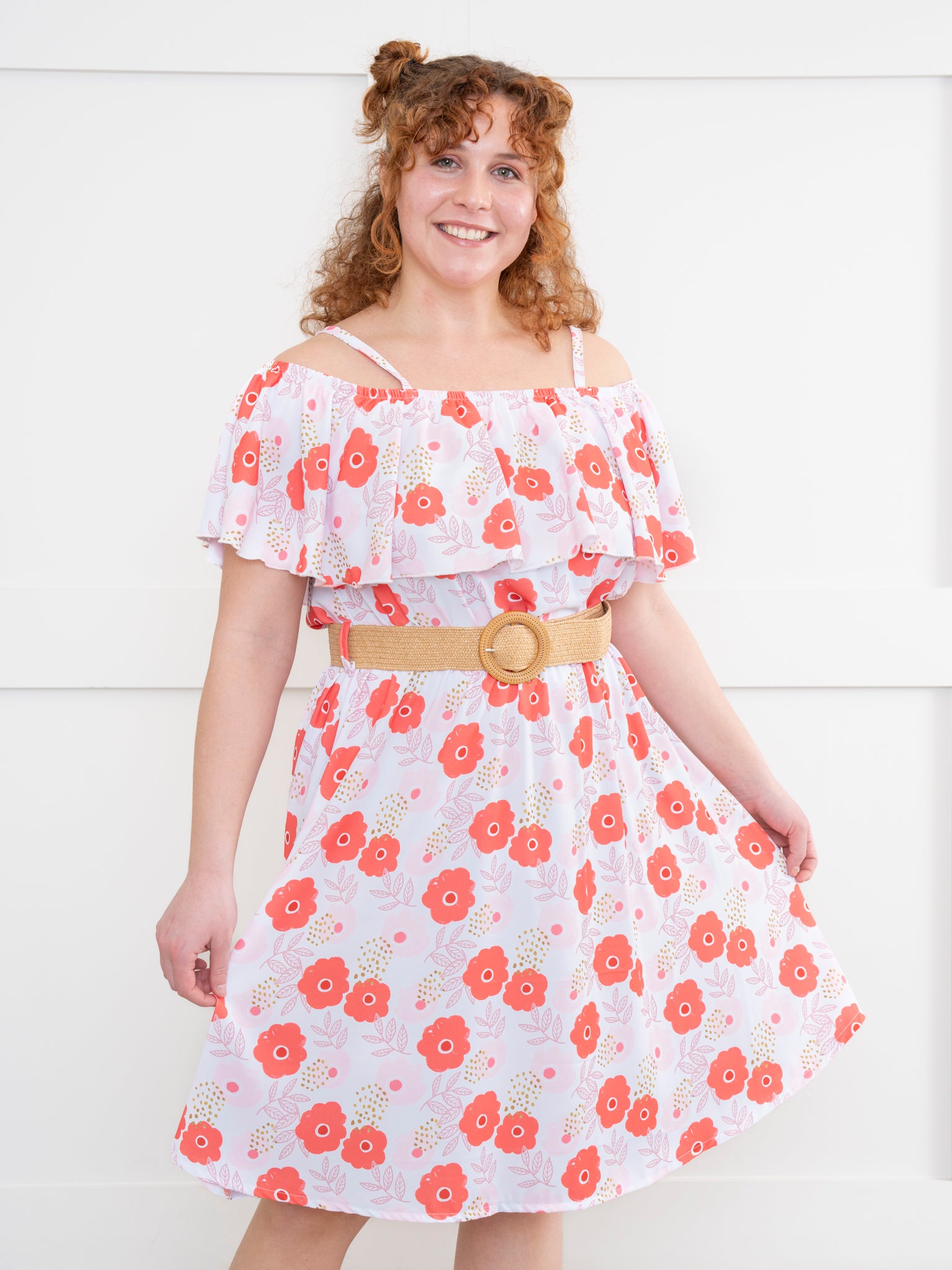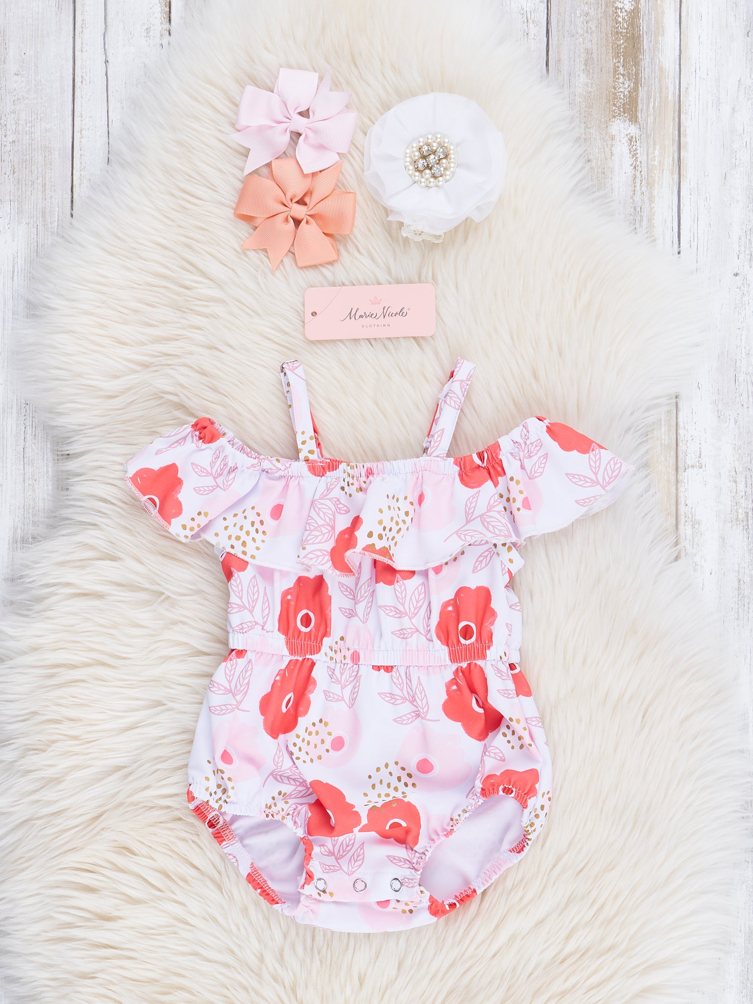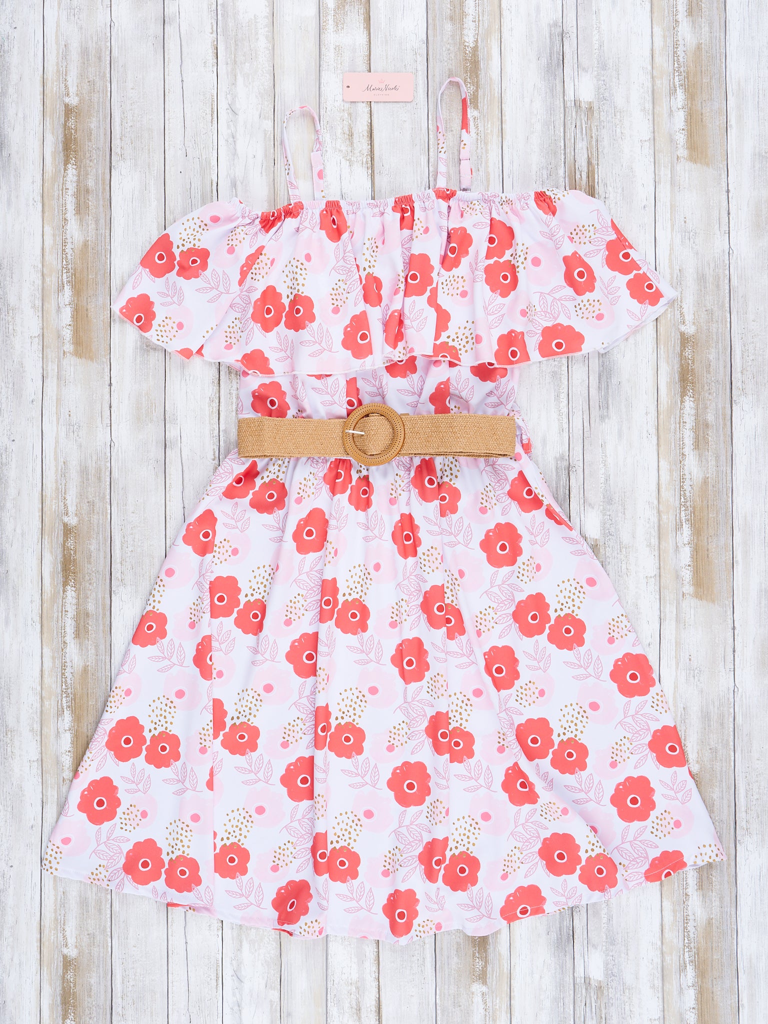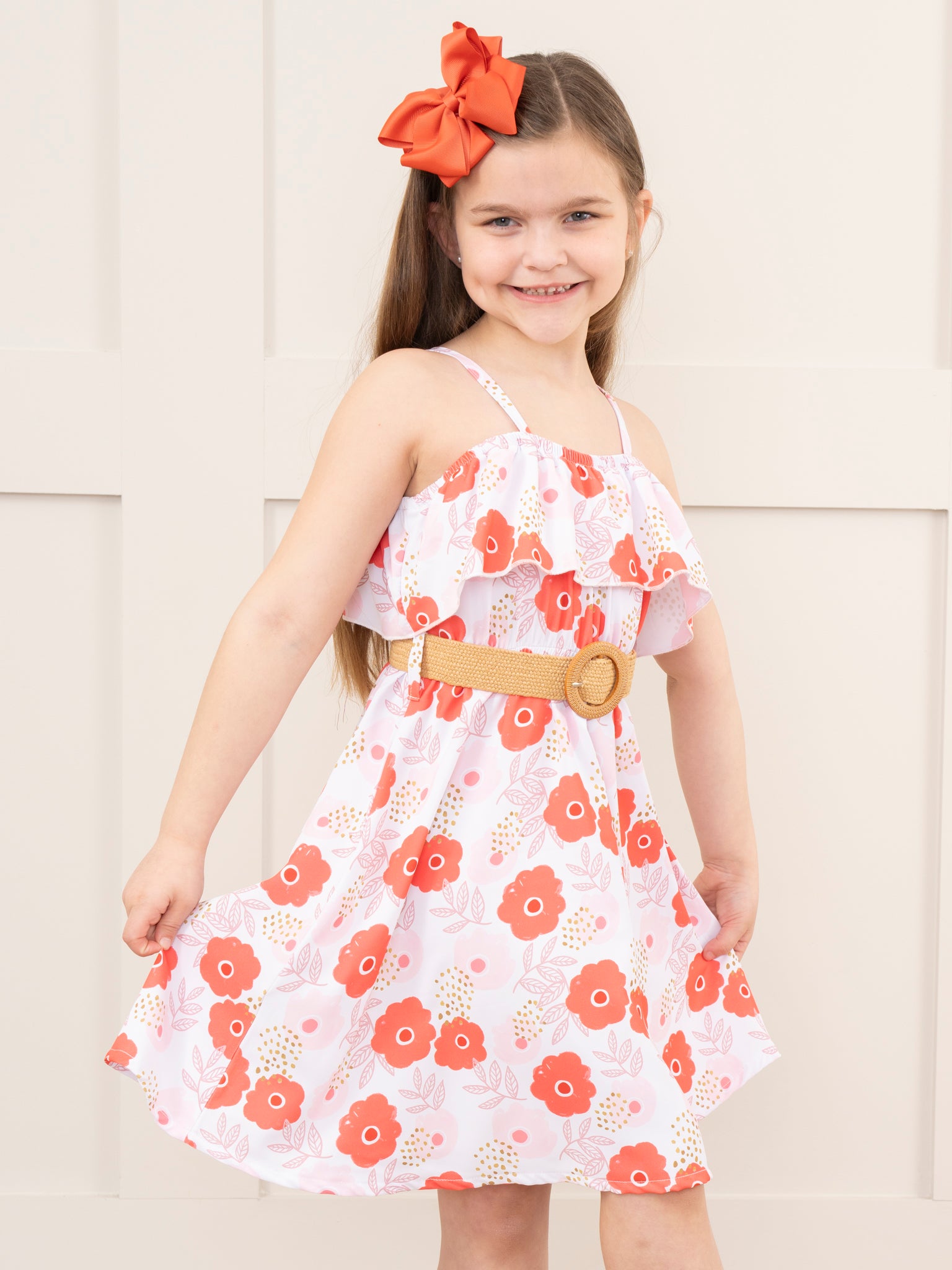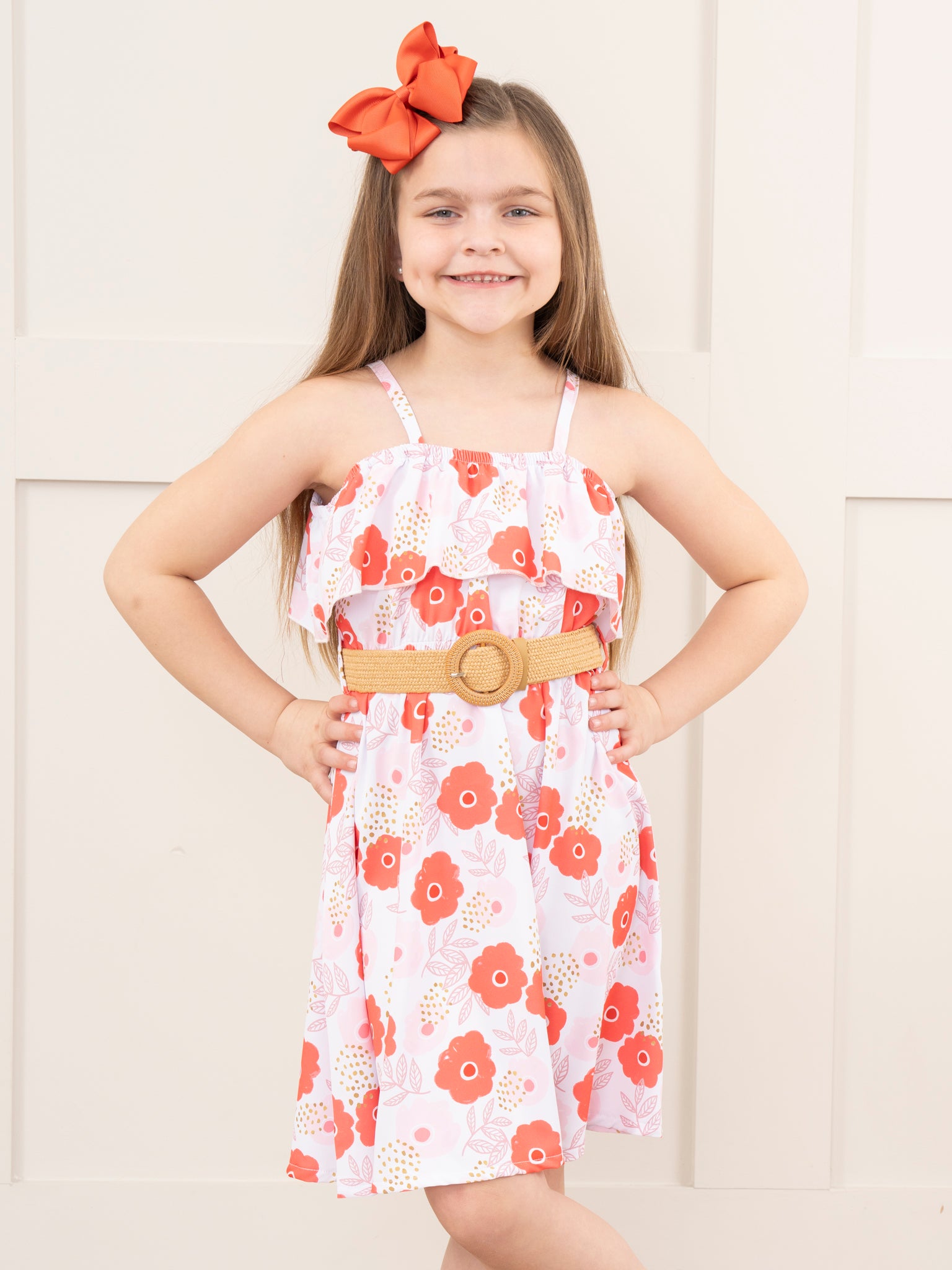 This cute & fun dress is perfect for spring with its pink & orange floral pattern. It features a woven belt that cinches the waist for a flattering fit for both mom & mini. Twirl & make memories this spring in this matching set!