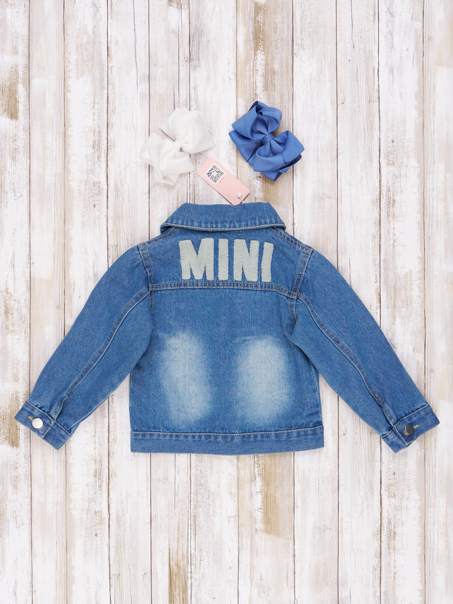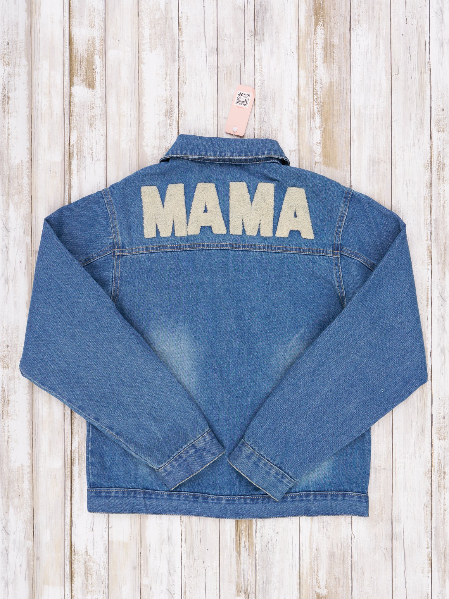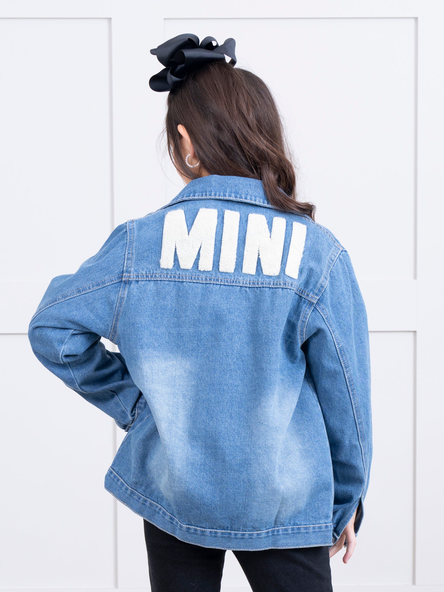 Mama and Mini will be the most stylish this season in this comfy denim jacket with cream fuzzy applique wording on the back.
