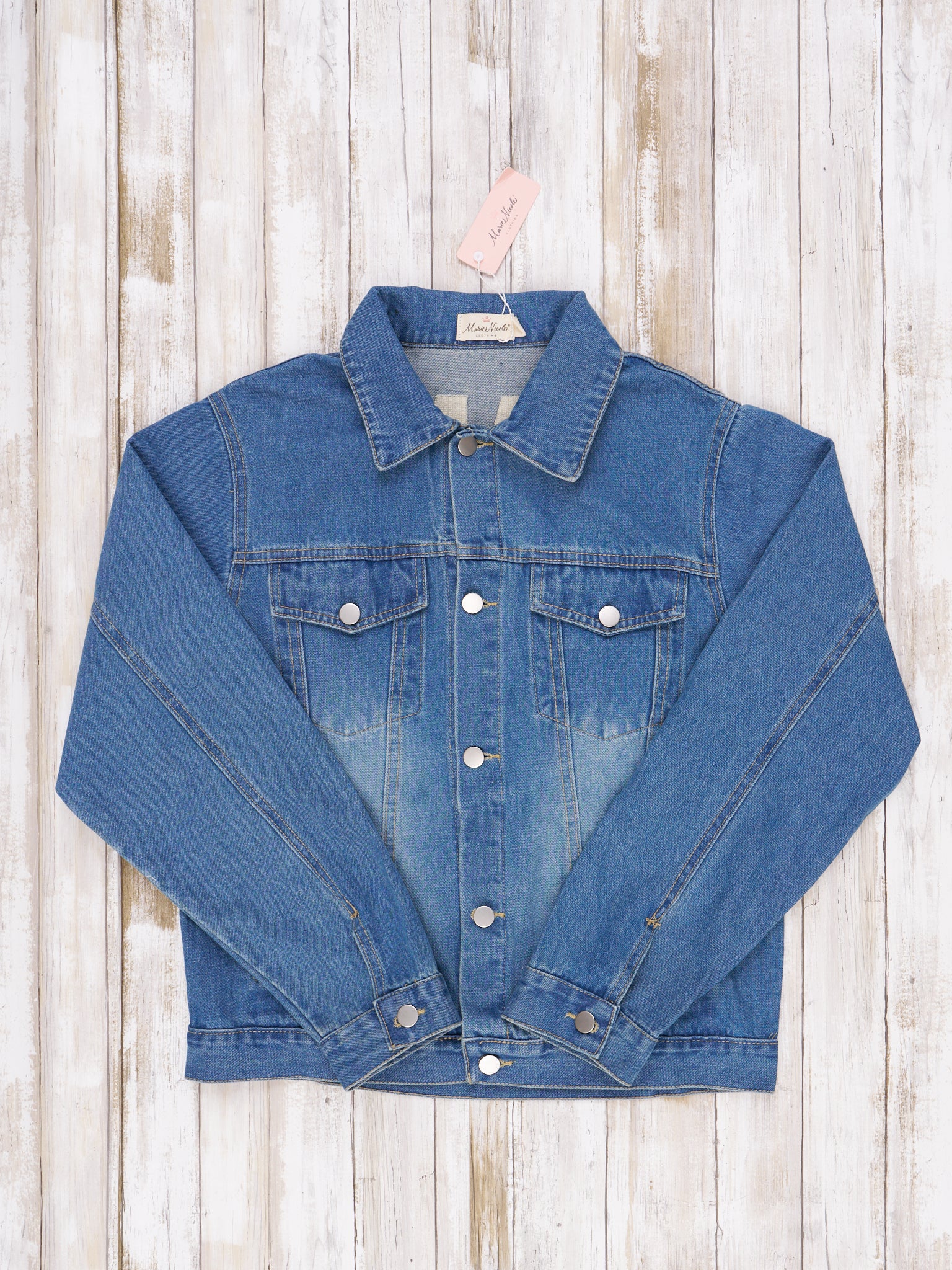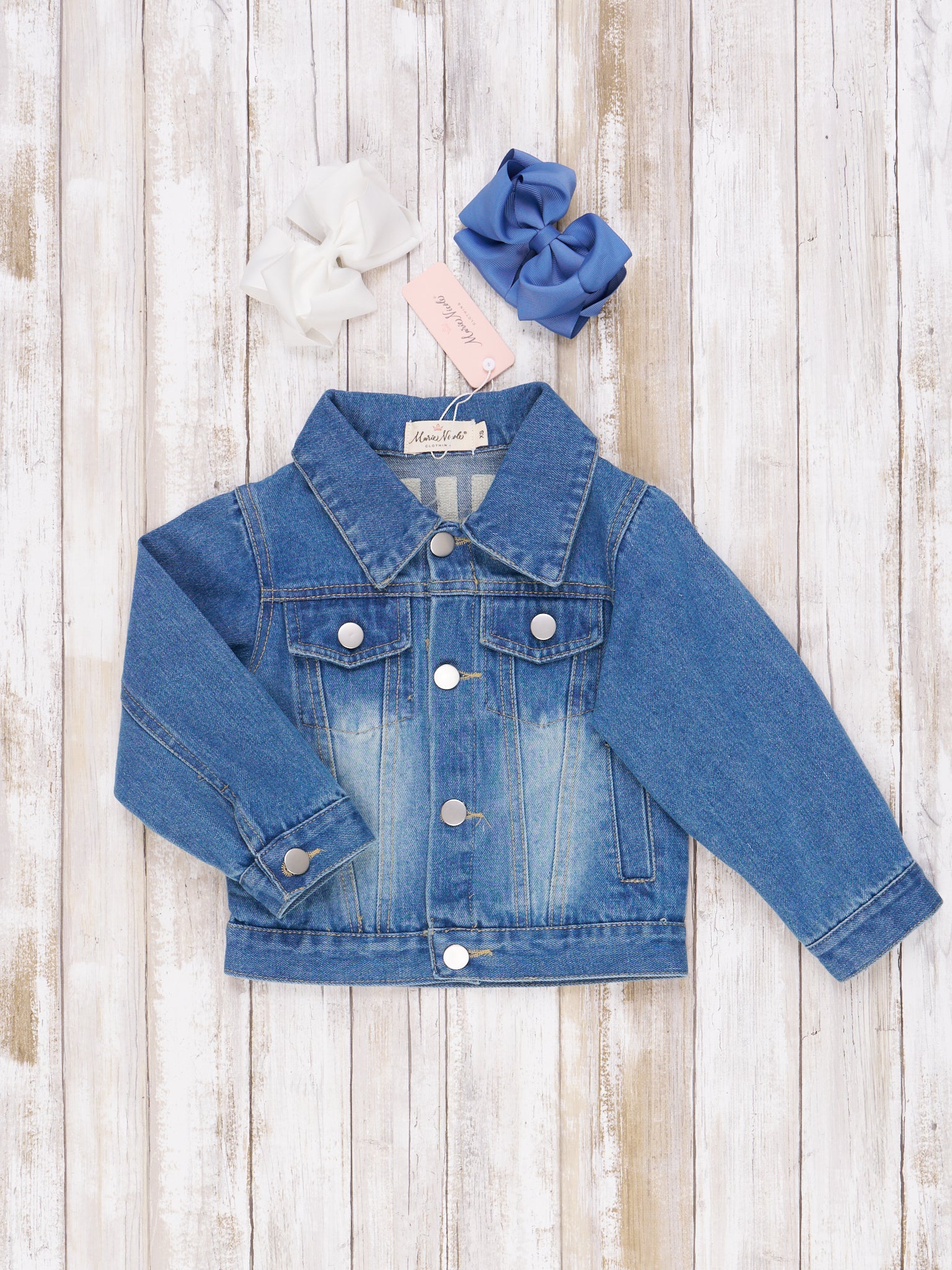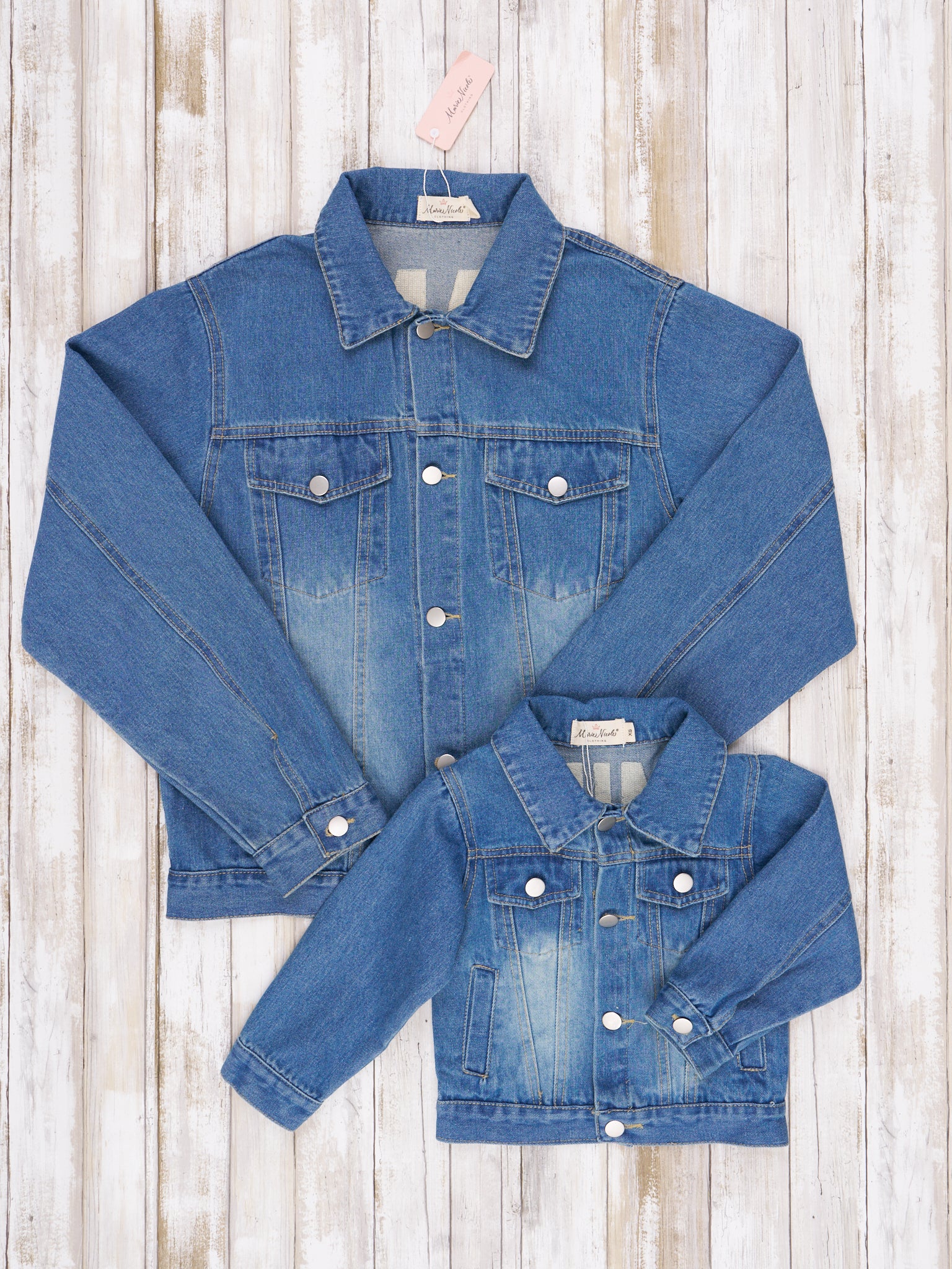 Mama and Mini will be the most stylish this season in this comfy denim jacket with cream fuzzy applique wording on the back.