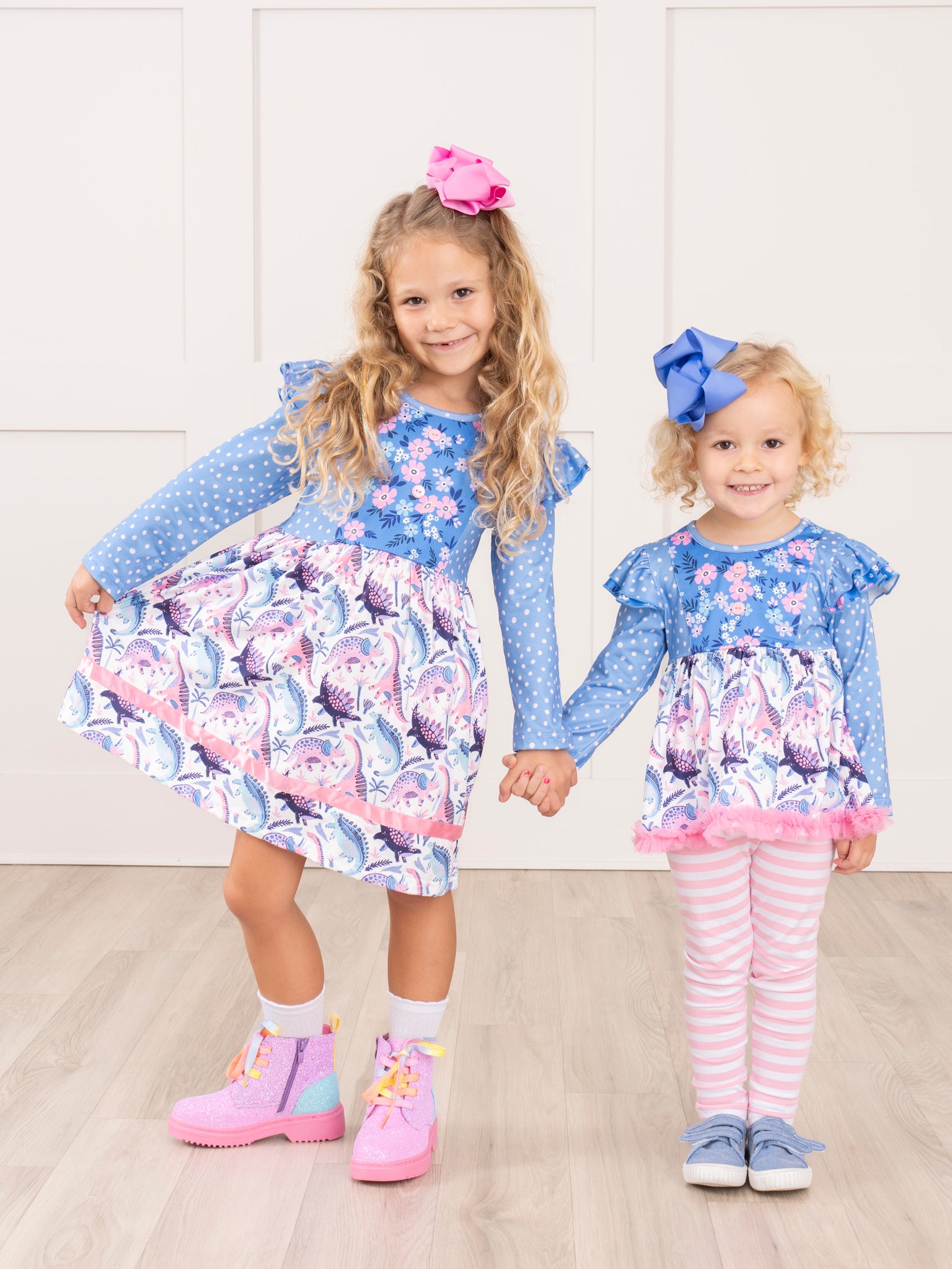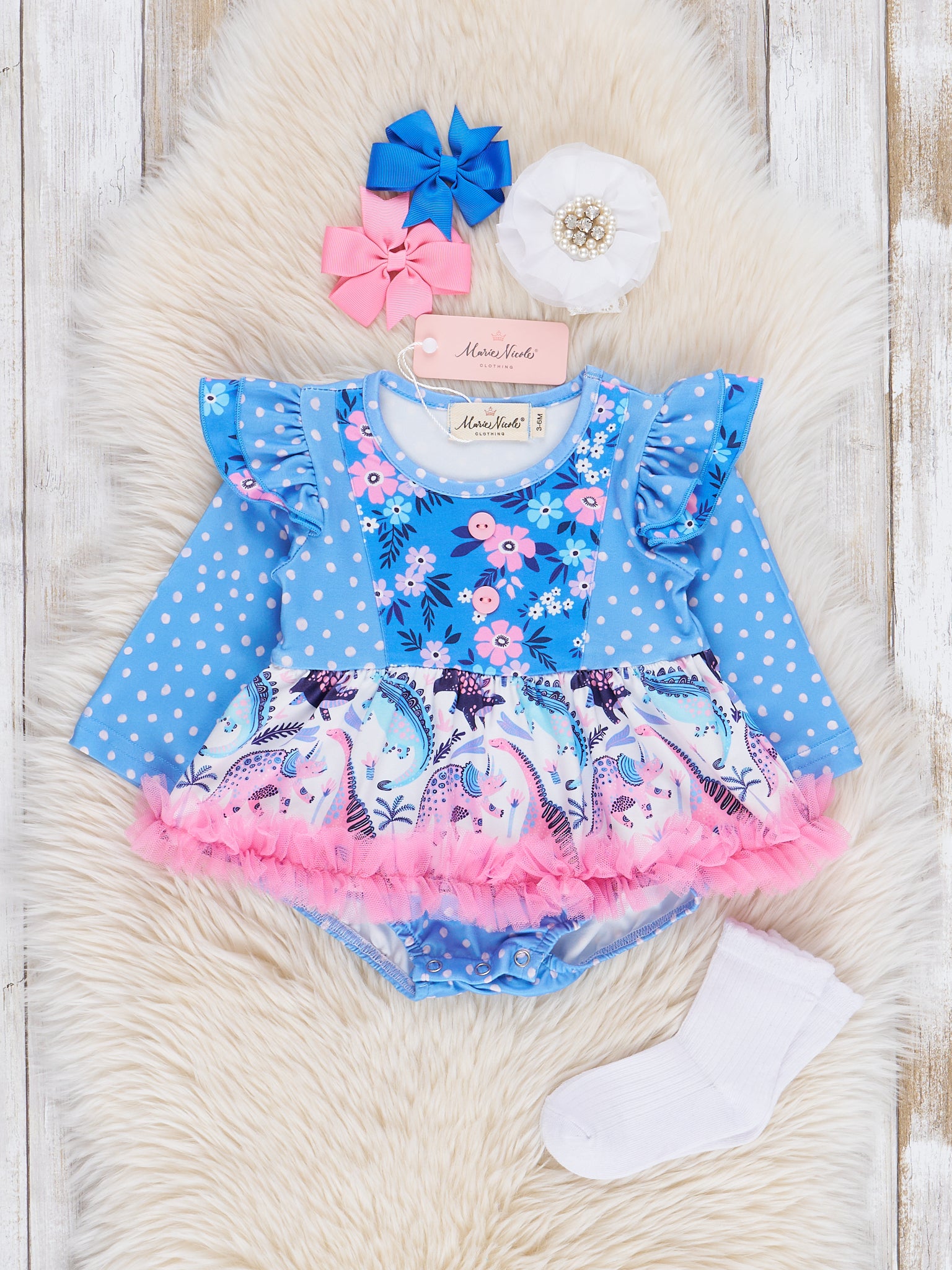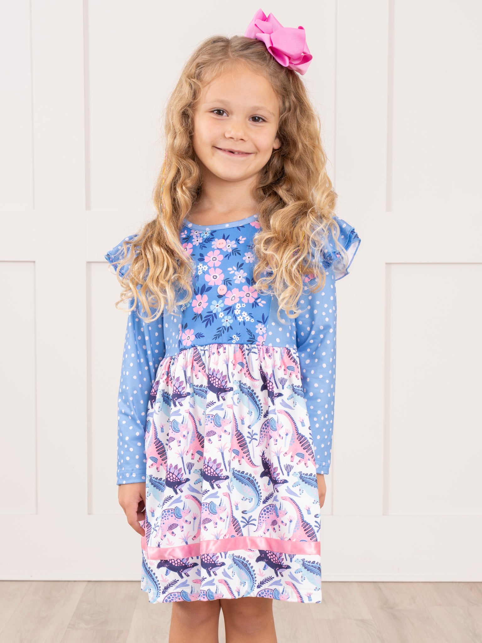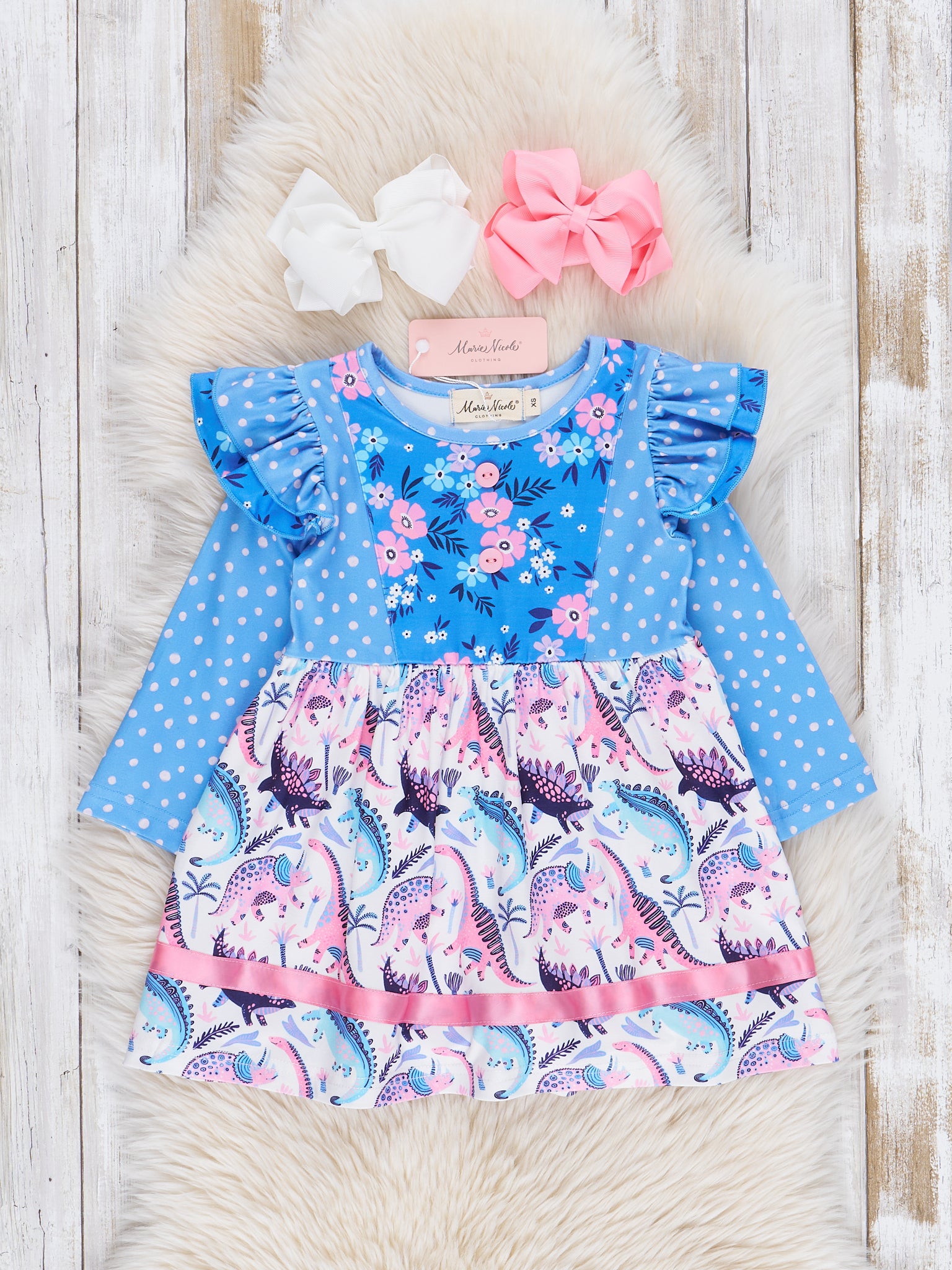Blue & Pink Dinosaur Blooms Ruffle Dress