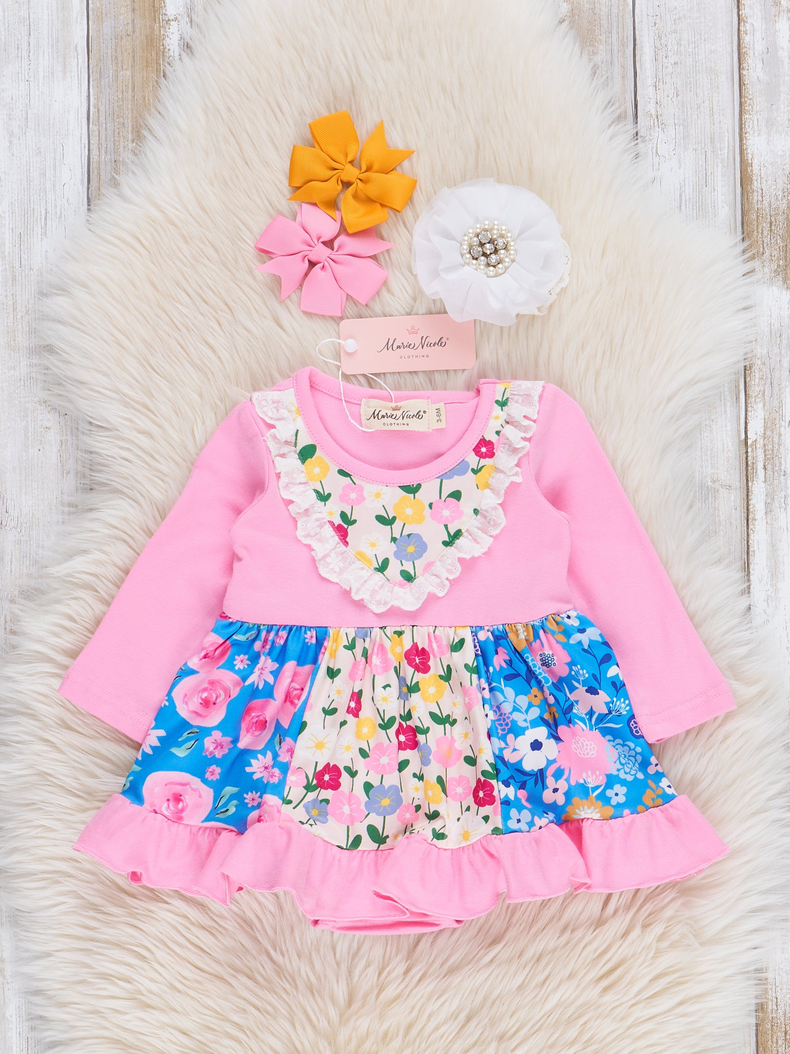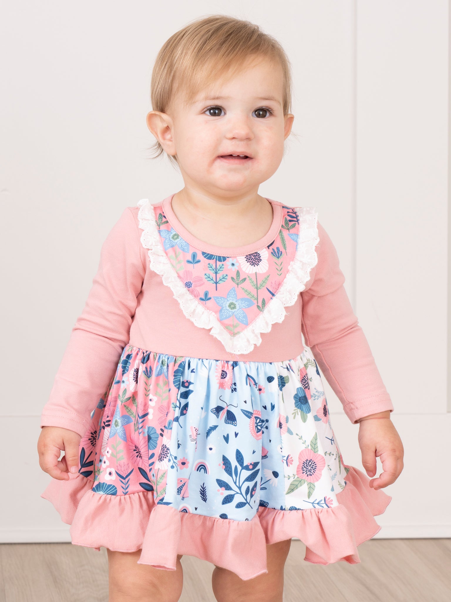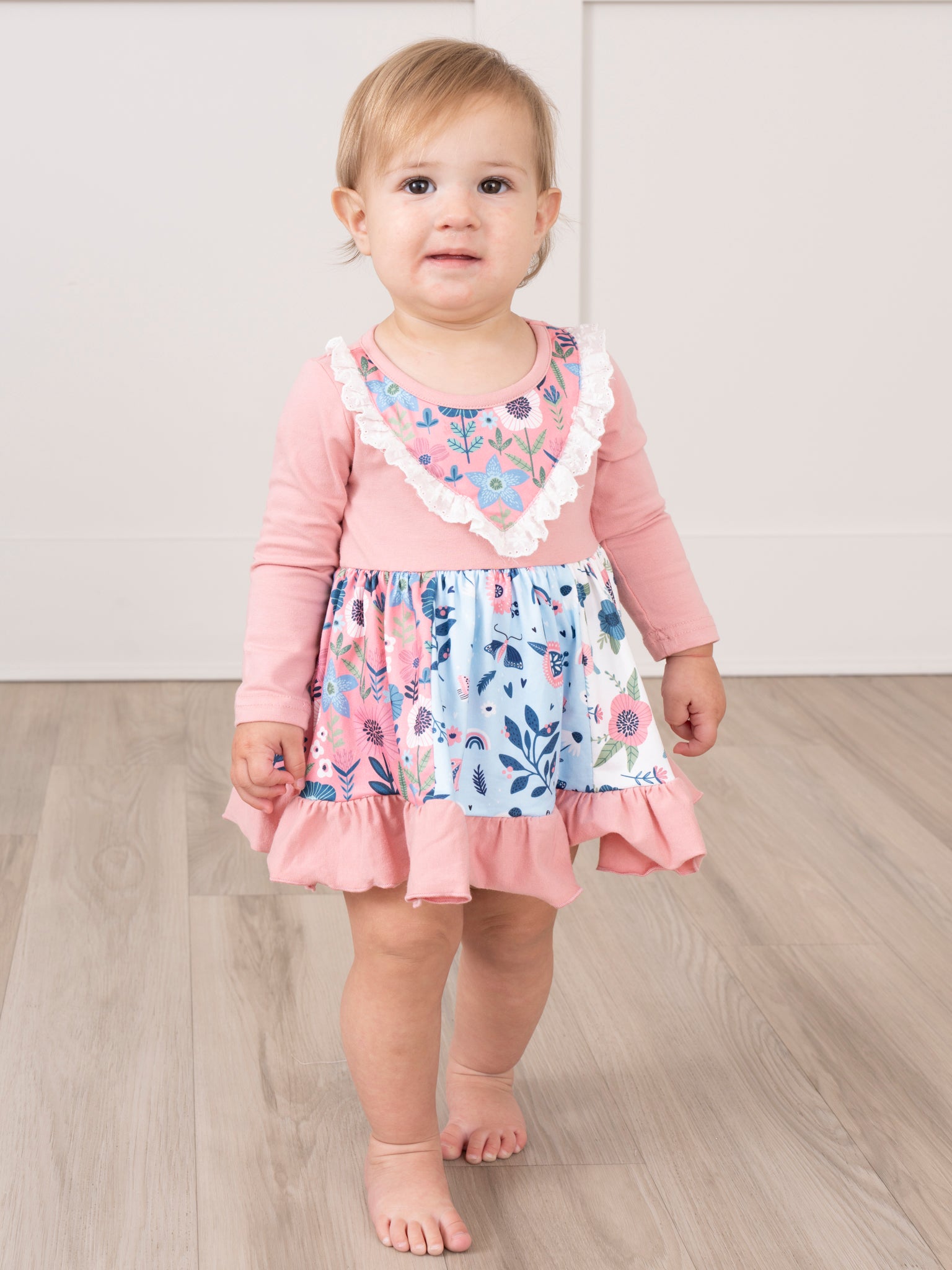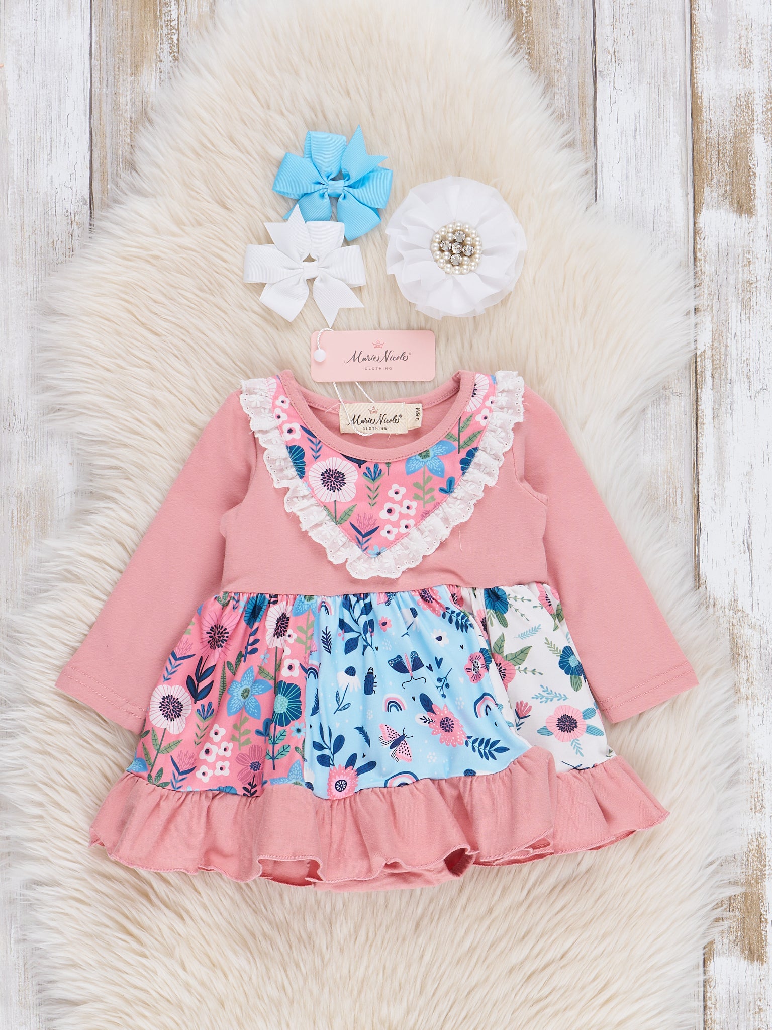 Blue & Pink Dinosaur Blooms Ruffle Dress