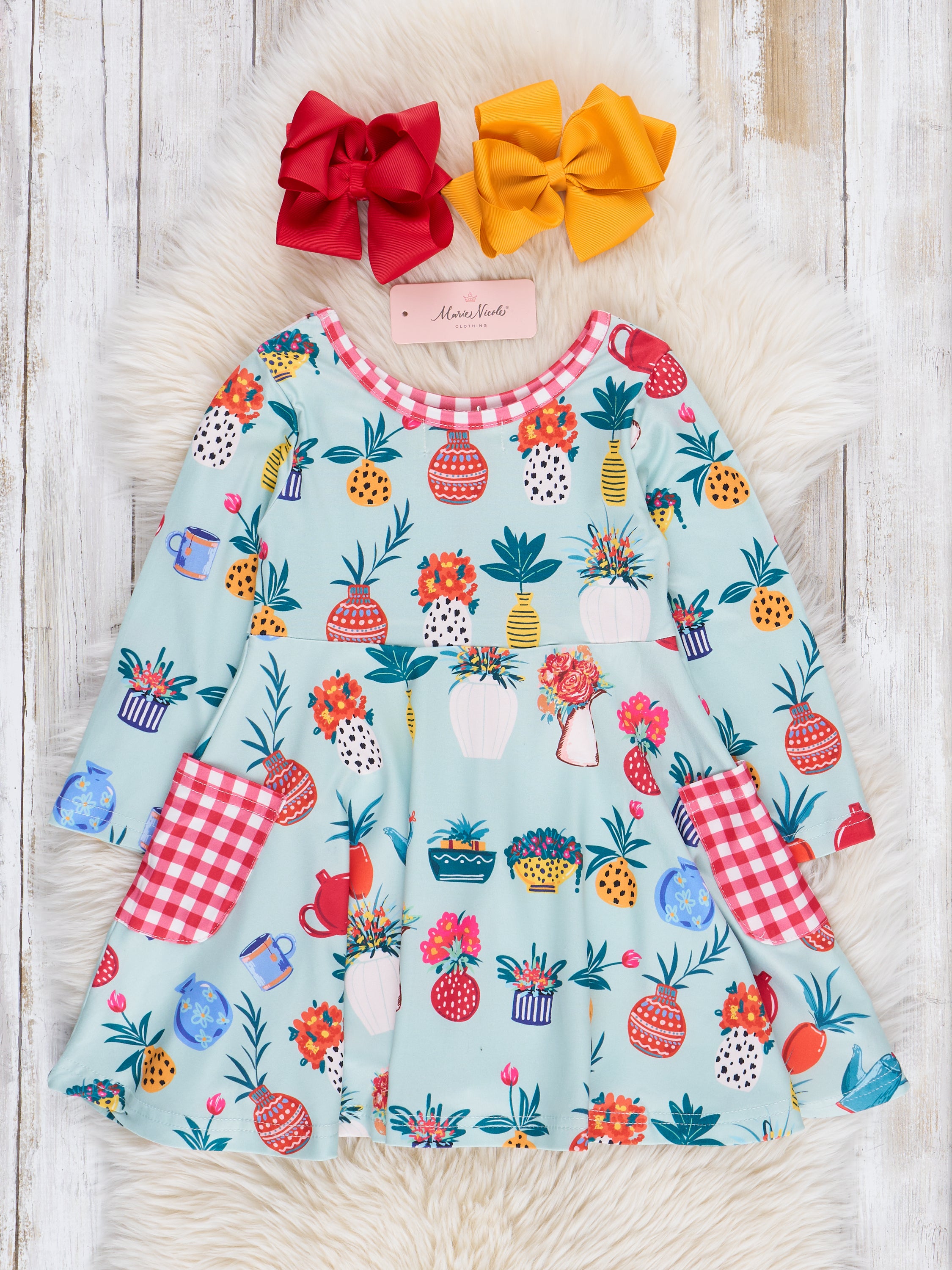 Get your little gardener ready to play in our Teal Gardening Gingham Pocket Dress! With a trendy teal bodice and playful red gingham pockets, this dress features a charming gardening motif and adorable ruffle accents. The sister set is fit for playtime in the sun!