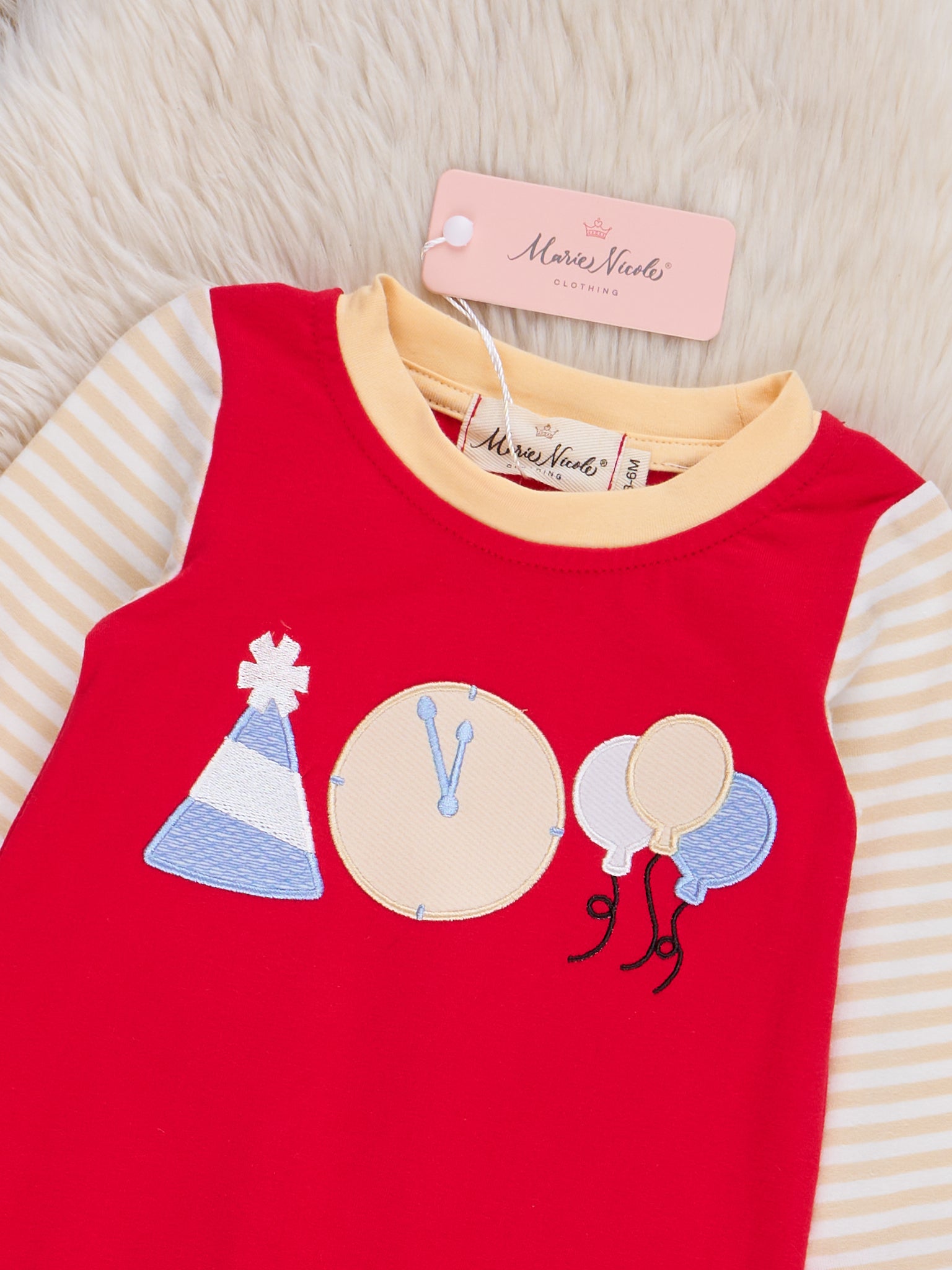 Get ready to party with this playful Red & Yellow Party Time sibling set! Perfect for celebrating the New Year, this boys romper by Marie Nicole Clothing features a vibrant red bodice with an embroidered party theme and fun yellow striped sleeves. Make a statement and have some fun with this stylish and unique romper! Features a party hat, clock, and balloons.