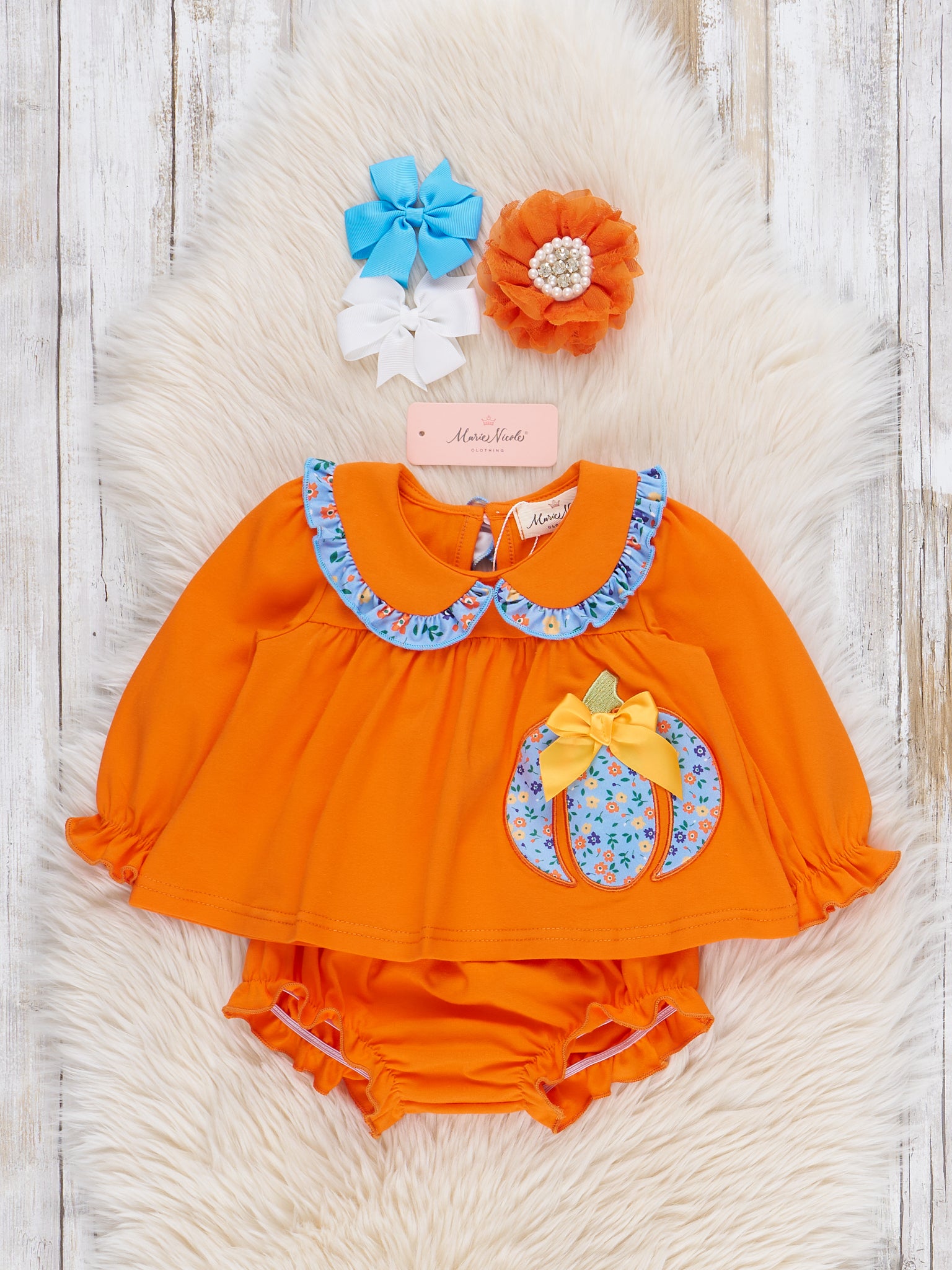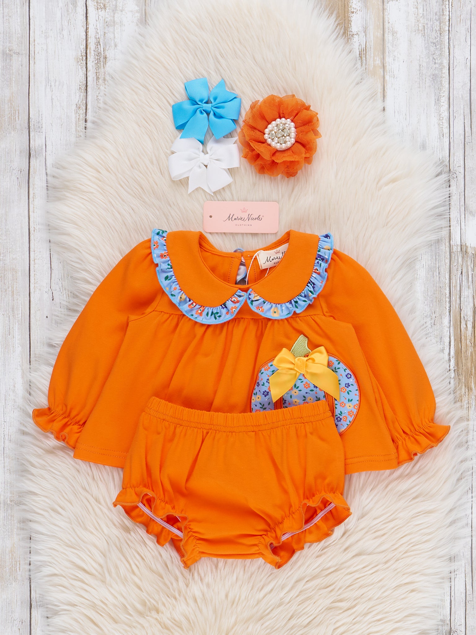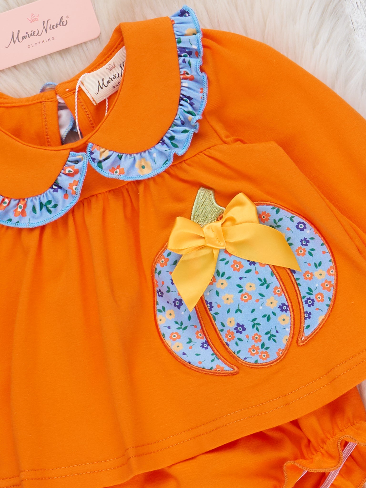 The Blooming Pumpkin Babe Embroidered Bloomers Outfit is a sweet and stylish choice for fall festivities. Featuring beautifully embroidered pumpkin accented with floral touches, this outfit from Marie Nicole Clothing blends seasonal charm with delicate detail. Complete with coordinating ruffle bloomers and made from soft, breathable fabric, it’s perfect for pumpkin patches, autumn outings, and picture-perfect moments.