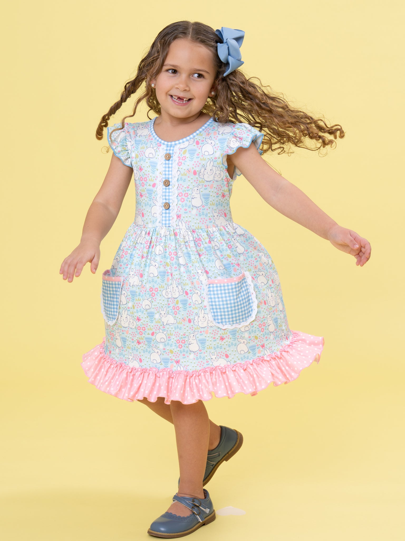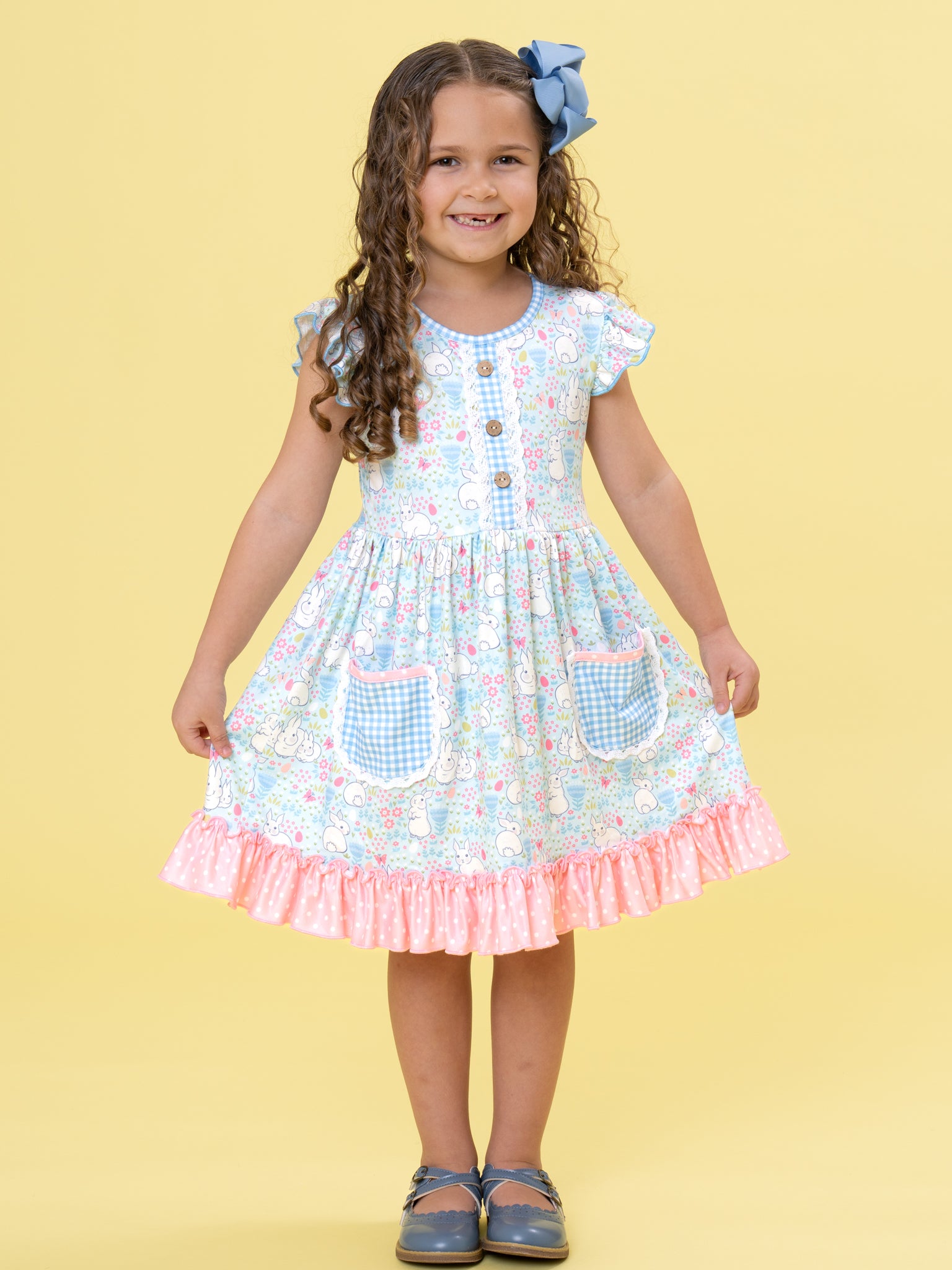 Bunny Meadow Pocket Ruffle Dress by Marie Nicole Clothing features a blooming meadow print, flutter sleeves, and two sweet gingham pockets perfect for little treasures. Wood-button accents and a playful ruffle hem complete the vintage-inspired look, making this dress ideal for playdates, spring outings, or twirl-filled afternoons.