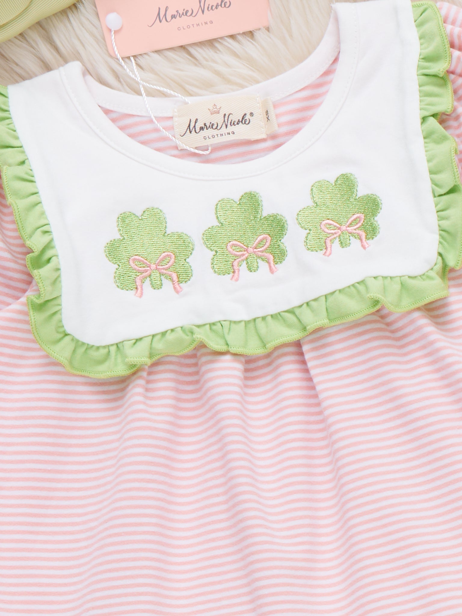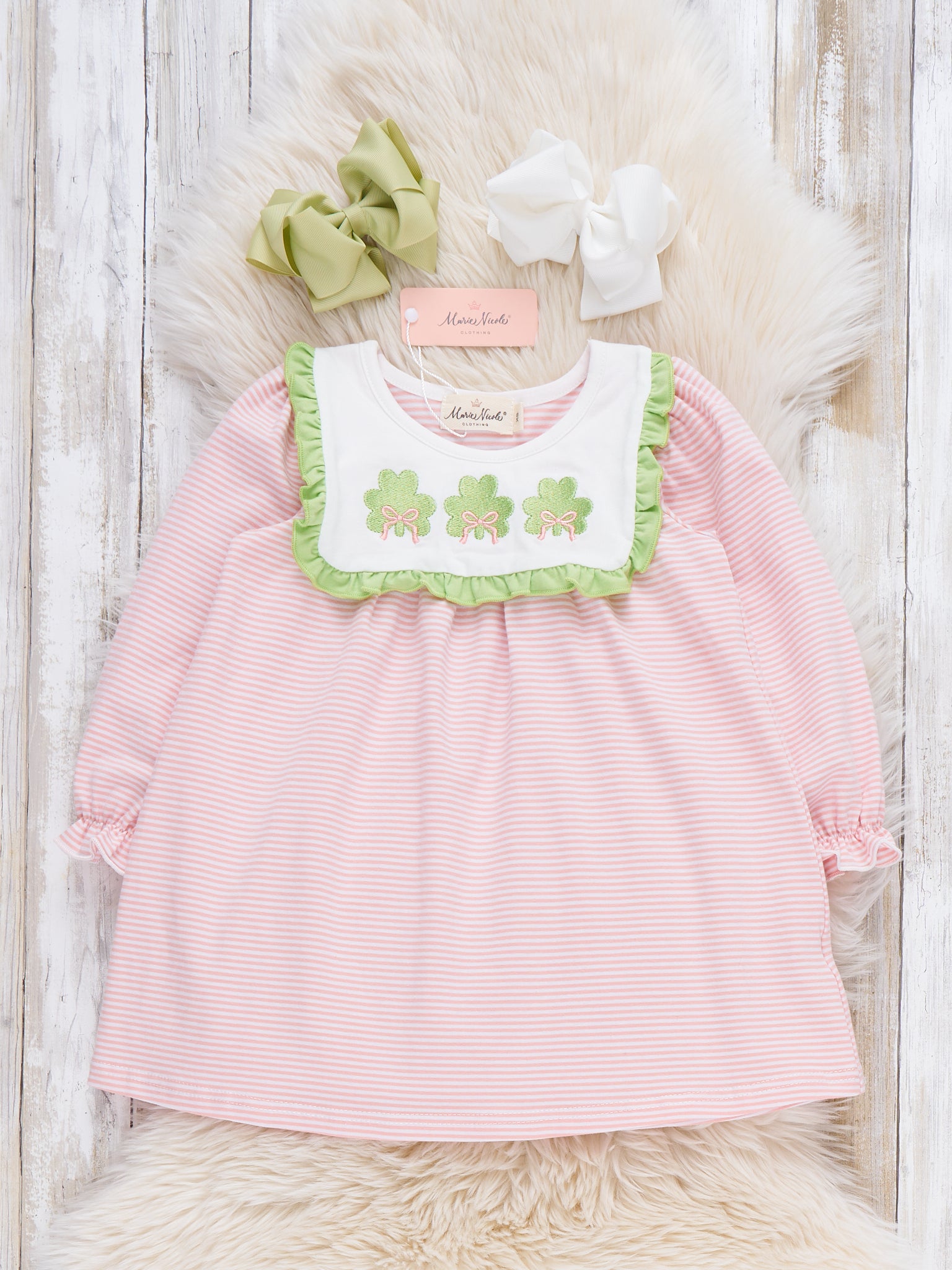 The Lucky Lane Embroidered Ruffle Dress by Marie Nicole Clothing brings together sweet embroidered shamrocks and soft ruffle details for a classic, charming look. Perfect for both special occasions and everyday twirling, this dress features playful, festive St. Patrick's Day motifs and timeless style.