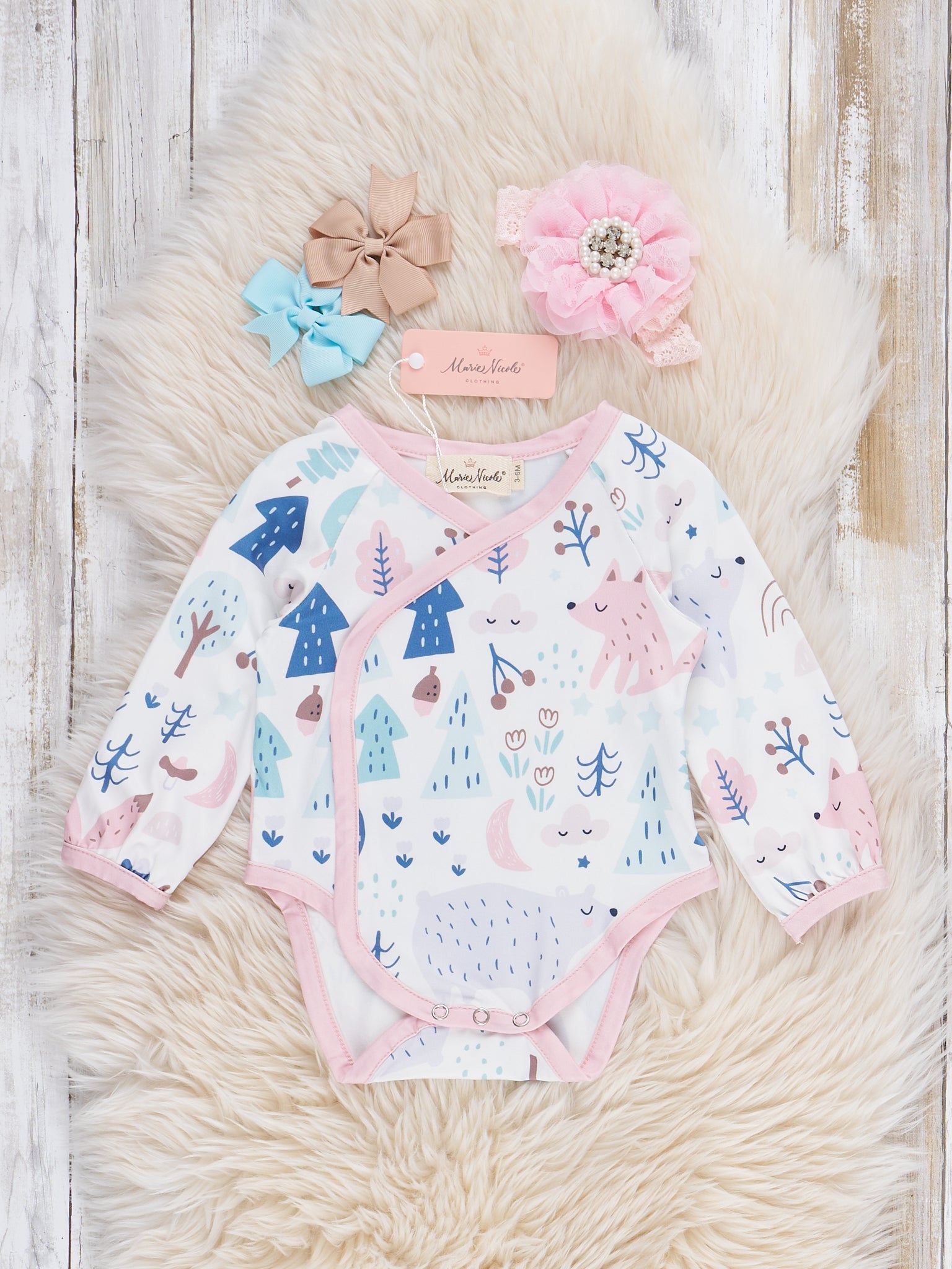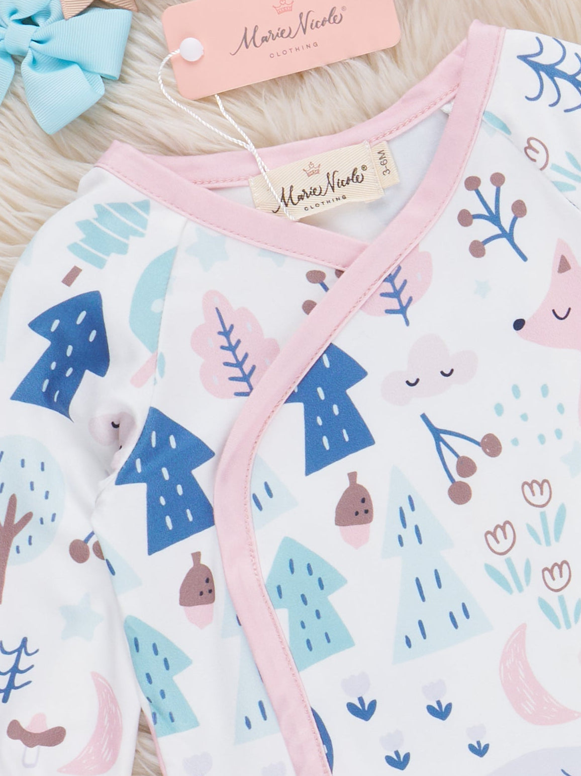 The Woodland Whimsy Bubble Pajamas by Marie Nicole Clothing features a whimsical woodland print in a cozy, wrap-style design, adorned with playful accents. Made from soft, gentle fabric, this romper offers charming comfort and easy dressing for daily adventures.