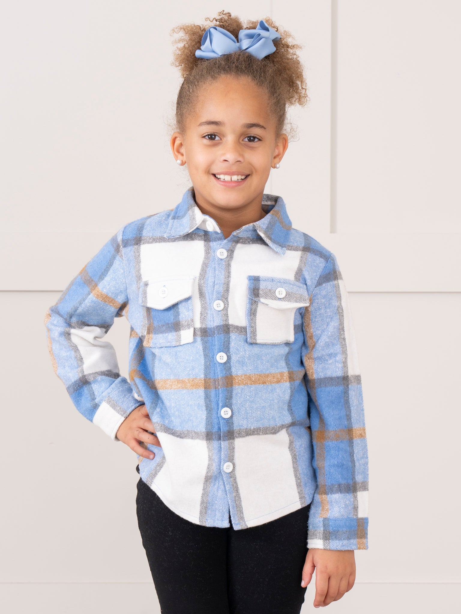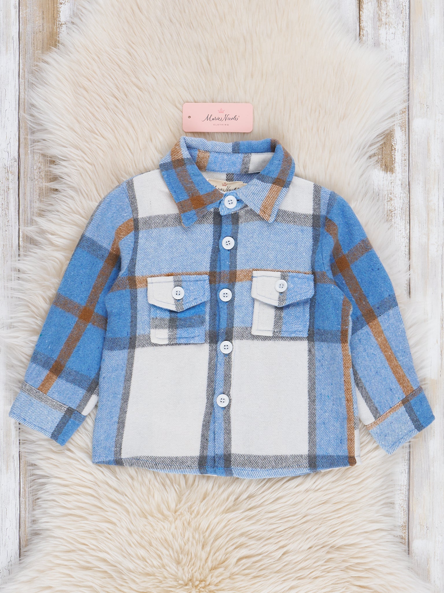Cozy up in our Blue Pocket Flannel Button-Up Shirt! Perfect for boys, this shirt features a button-up style and pocket detail for a stylish touch. Stay warm and stylish in this must-have flannel shirt. By Marie Nicole Clothing.