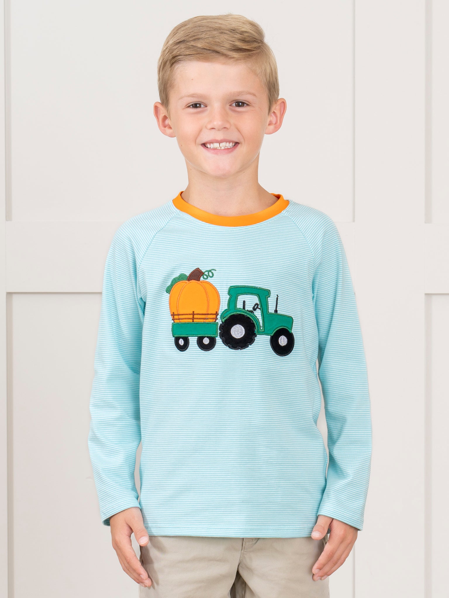 Get your little one ready for fall with our Restocked! Light Blue Stripes Pumpkin Tractor Shirt. This playful top features a trendy teal horizontal stripe pattern and an embroidered tractor carrying a festive pumpkin. With an orange collar and options for a sibling set, your little one will be the talk of the pumpkin patch!