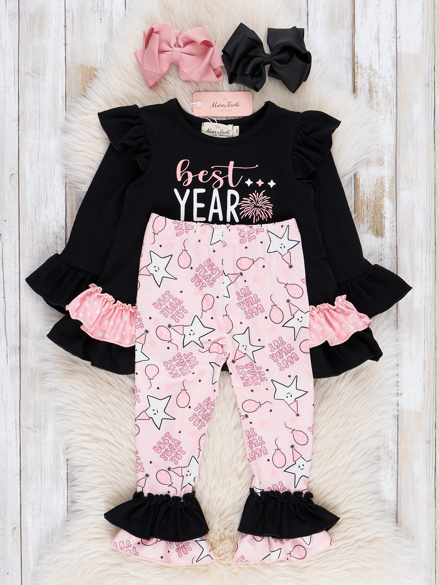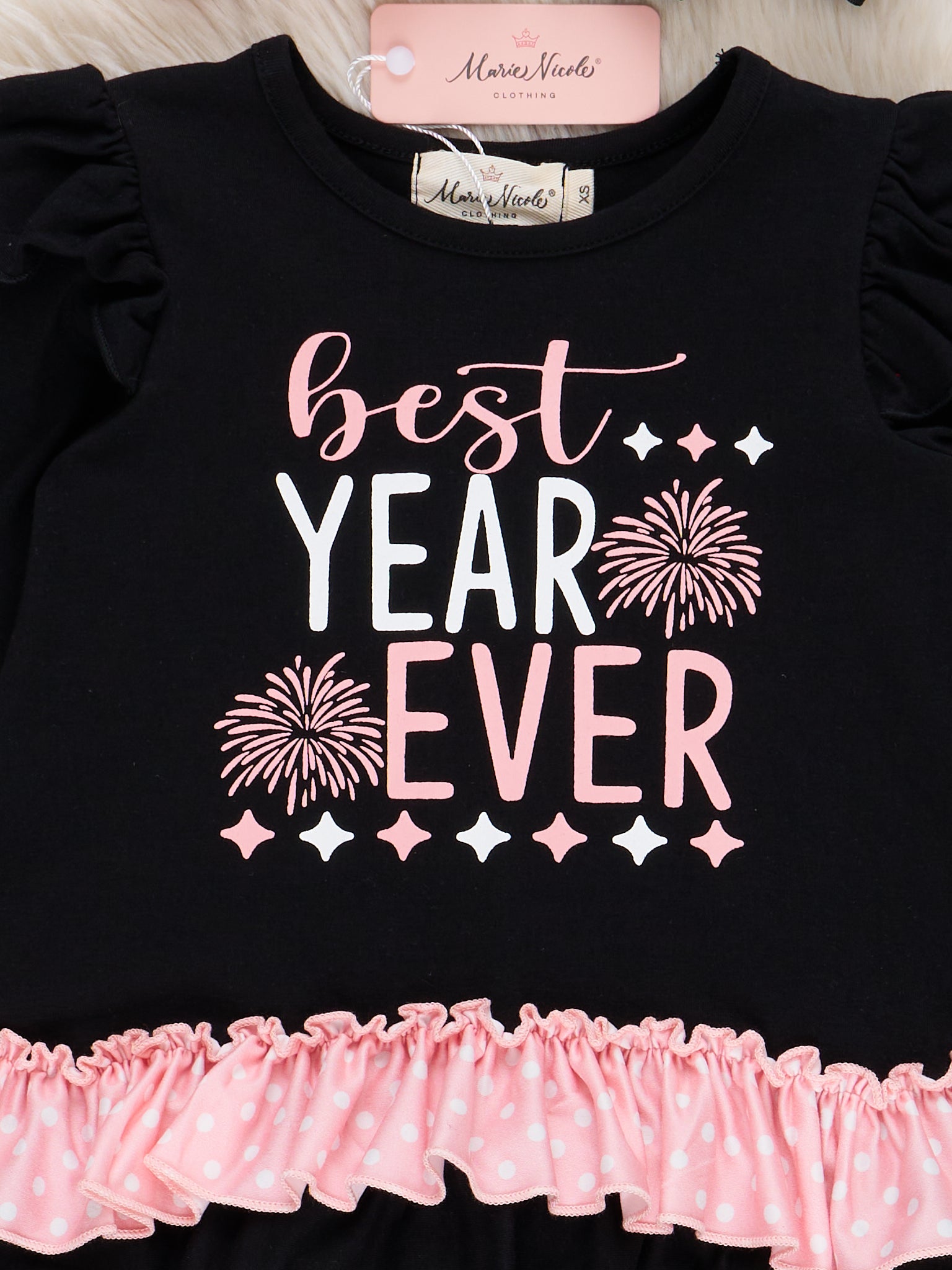 Get ready to make a statement this New Year with our Black "Best Year Ever" Ruffle Outfit by Marie Nicole Clothing! With its trendy bell sleeve top boasting a tiered ruffle hem paired with ruffle bell New Year printed leggings, this outfit is perfect for both parties and play dates. Plus, it has a matching sister set option for even more style. Let's make this the best year ever!
