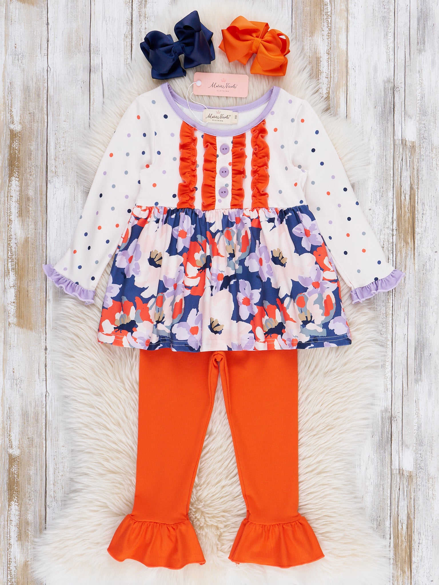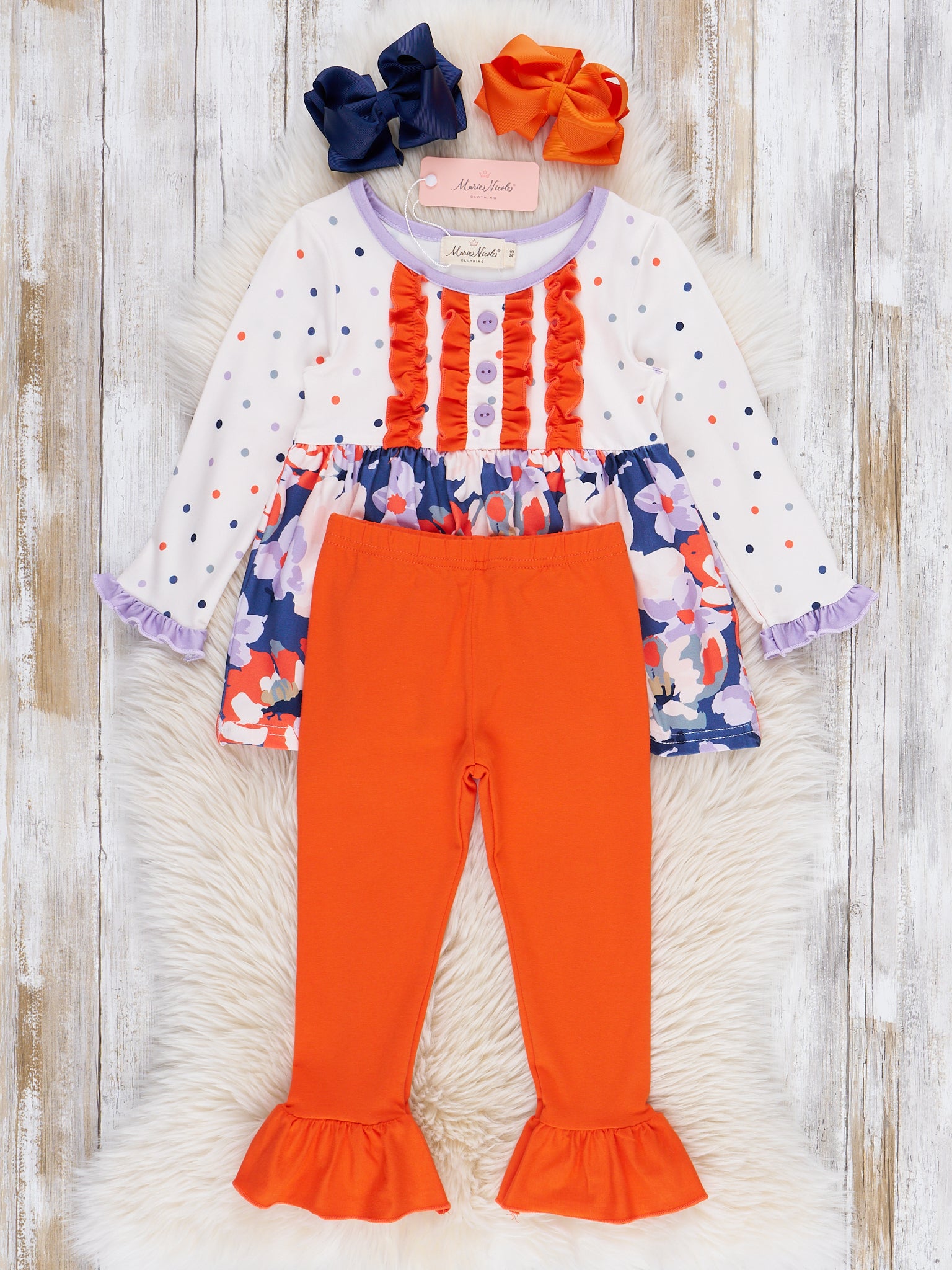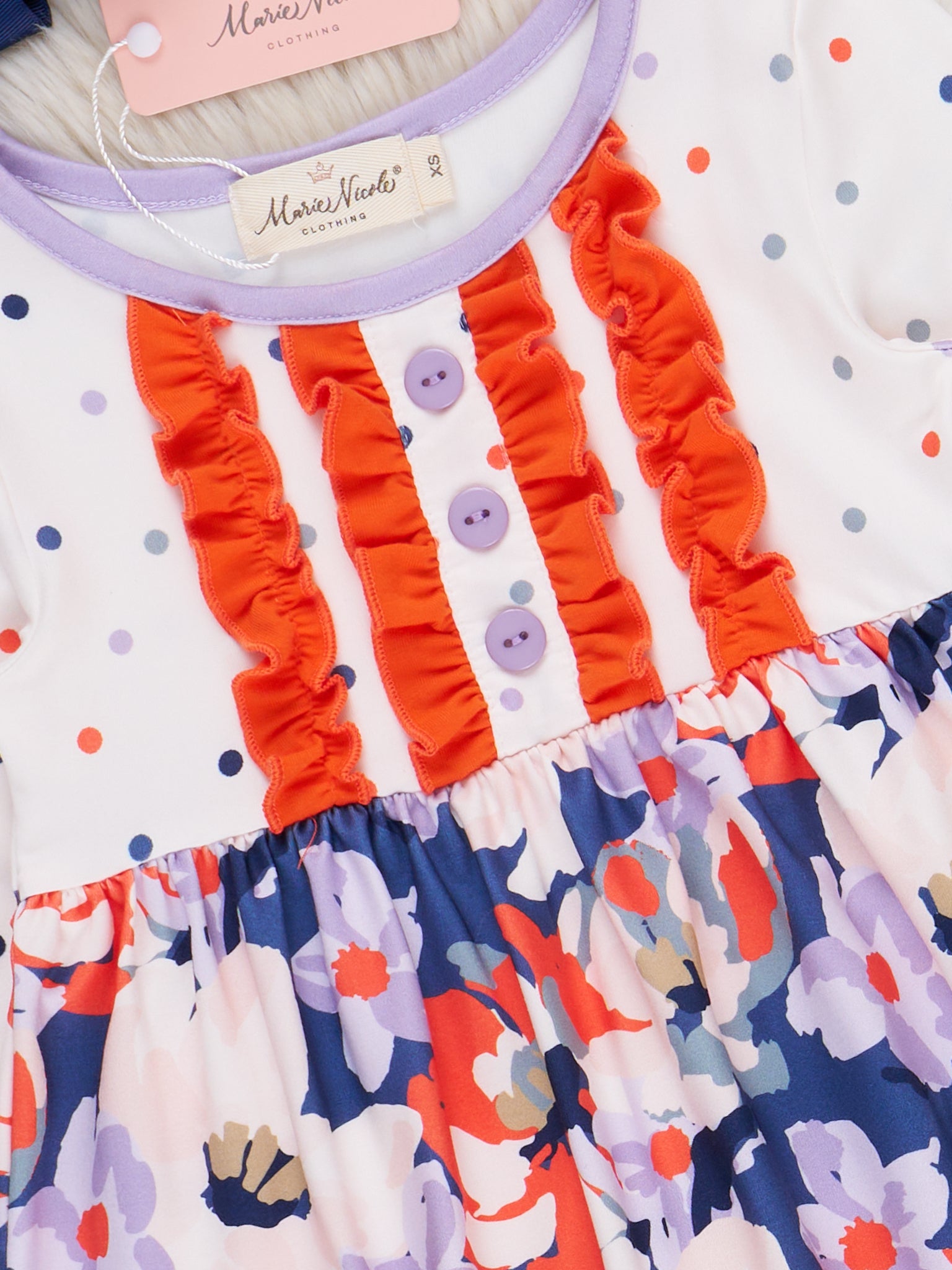The Bloom & Dots Ruffle Outfit is a sweet and playful pick for bright days and blooming adventures. Featuring a charming mix of floral blooms and classic polka dots, this outfit from Marie Nicole Clothing is finished with soft ruffle details for added sweetness. Lightweight, breathable, and full of cheerful charm, it’s perfect for twirling through playdates, parties, or any day she wants to shine.