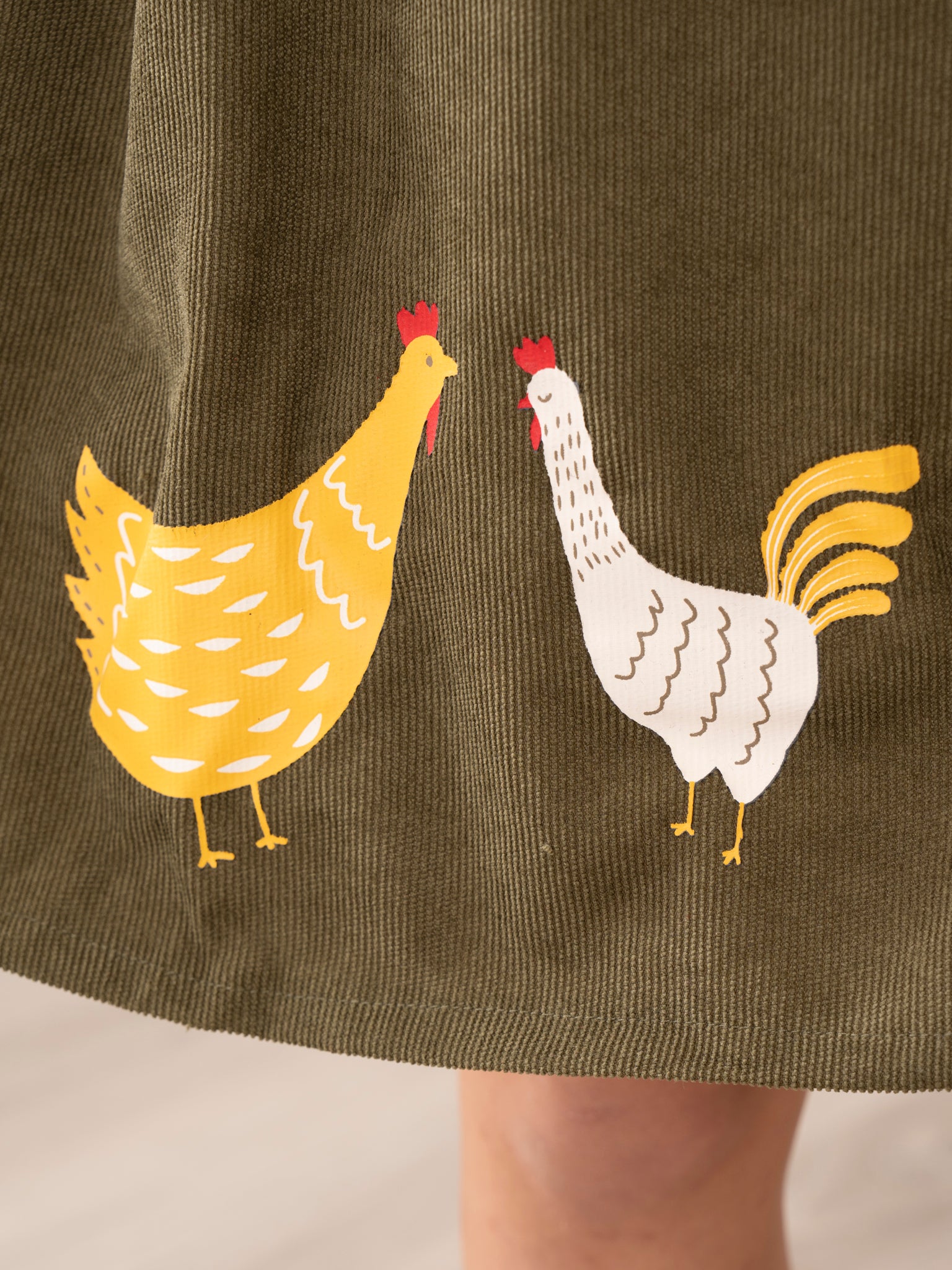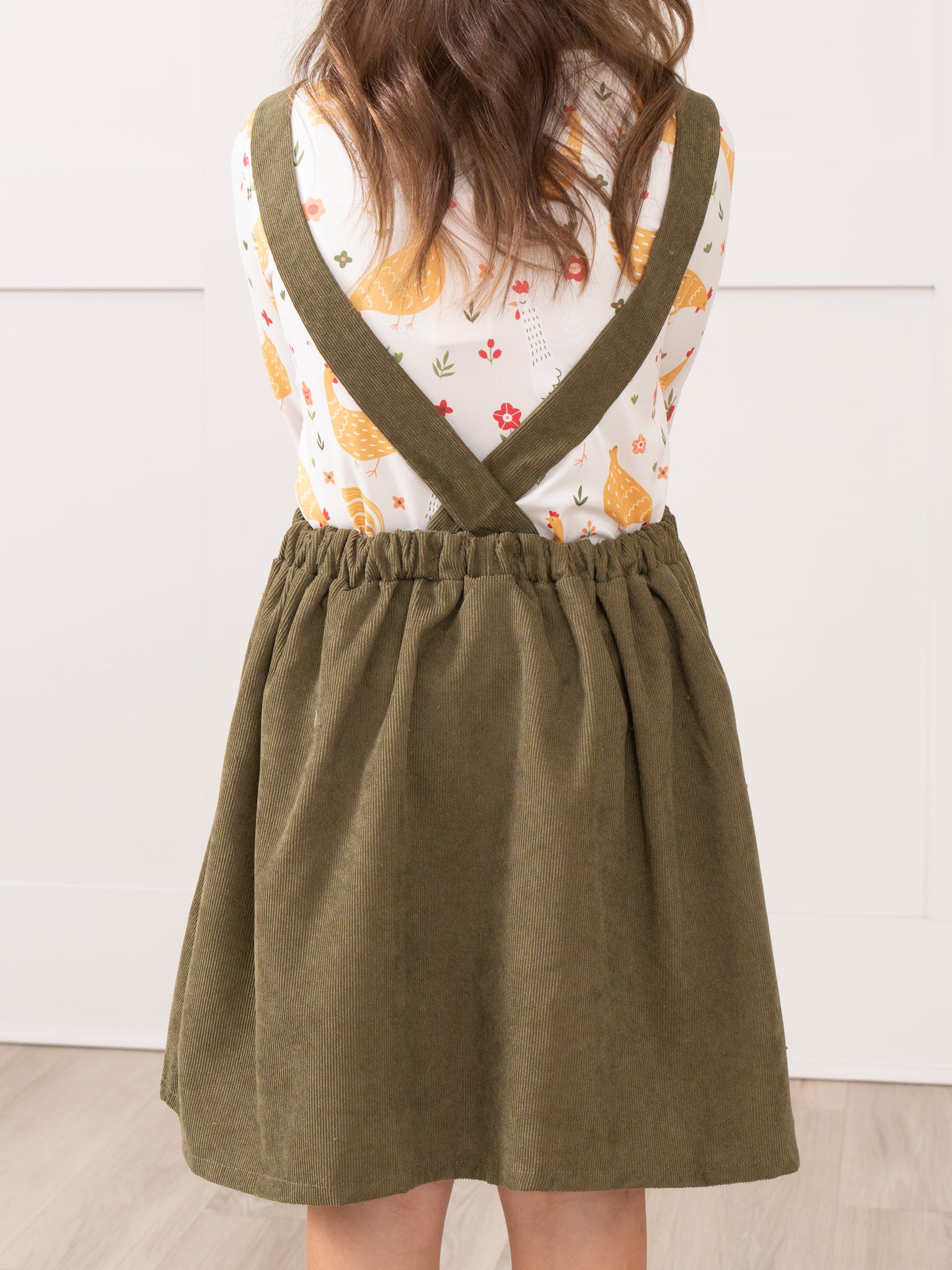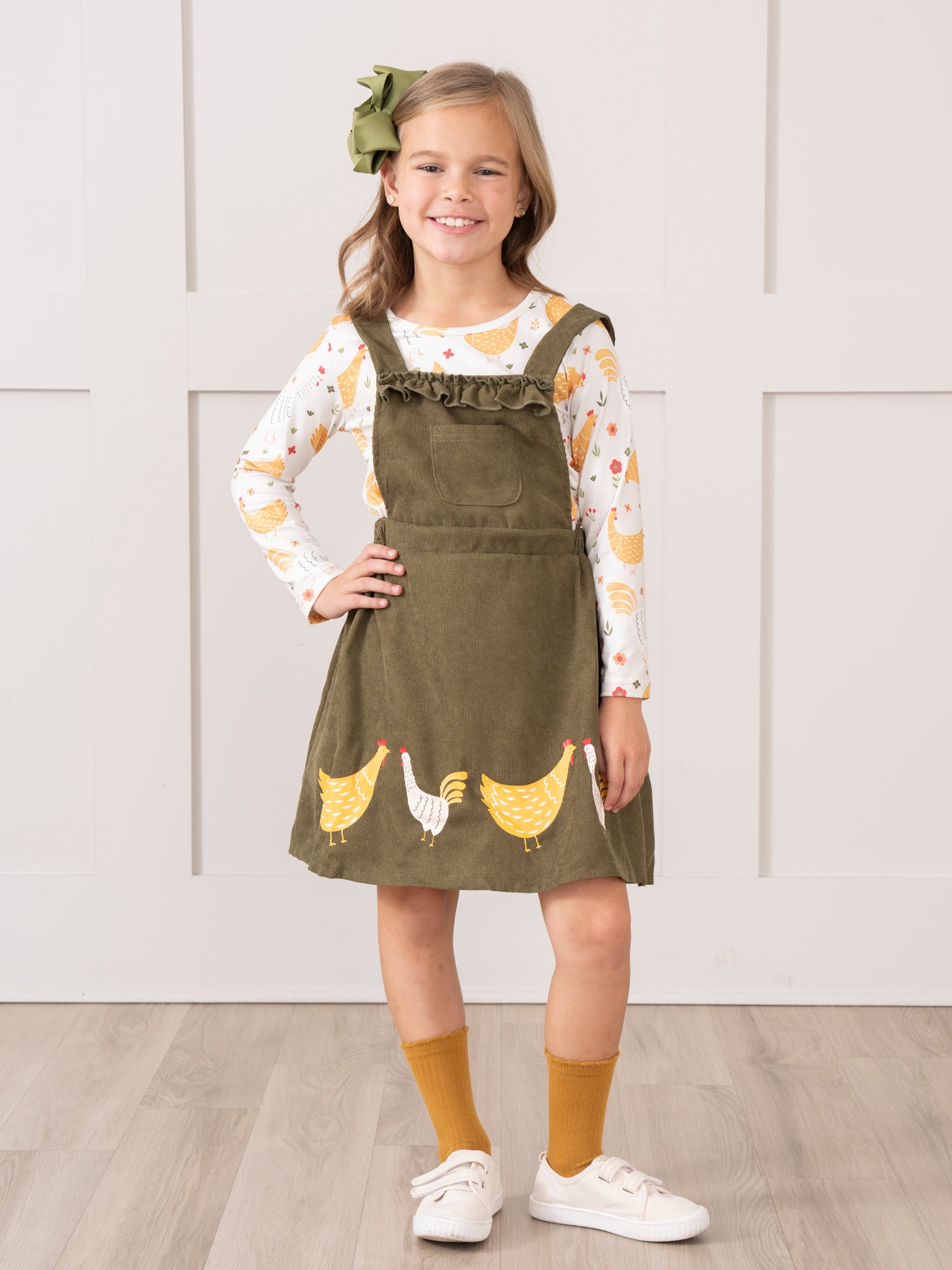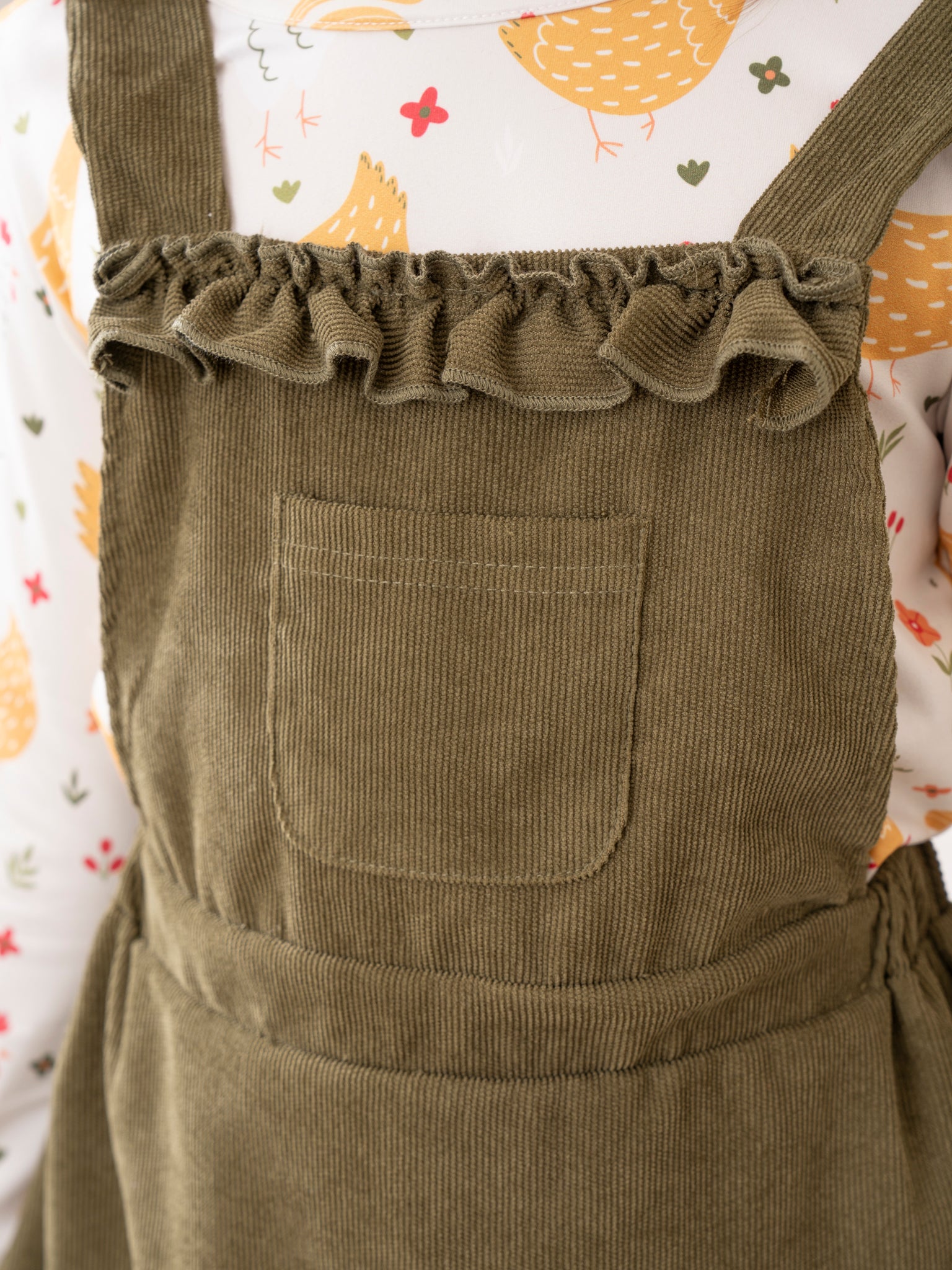 Make your little one cluck with joy in this Olive Corduroy Chickens Skirtall Set. The stylish girls outfit features a playful cross-back corduroy jumper with a charming chicken print hem. Completing the look is a sweet white chicken print top. Perfect for any fun-loving little chickadee! By Marie Nicole Clothing.