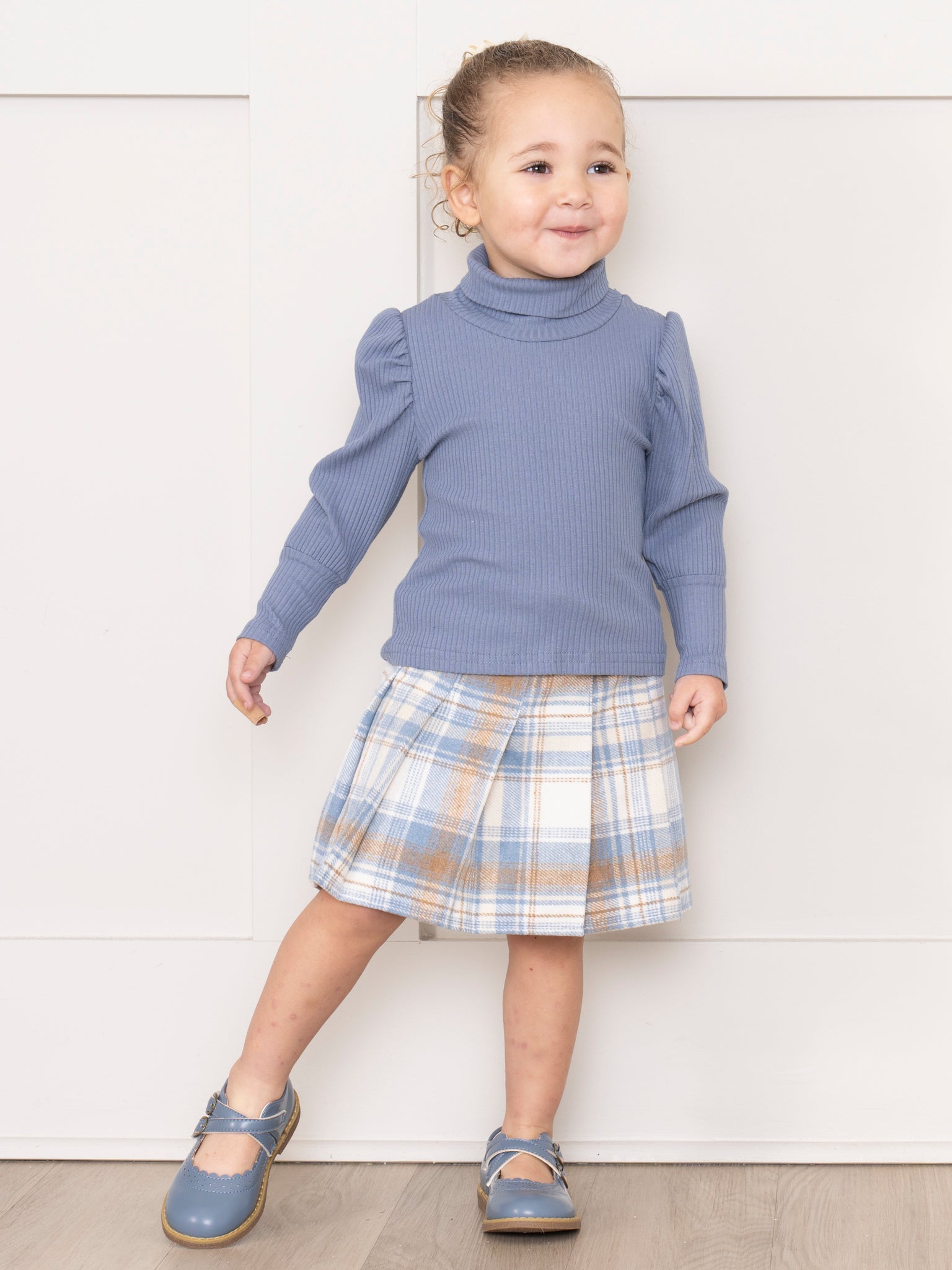 Get ready to rock the school hallways in this chic Ribbed Turtleneck & Plaid Outfit! The blue puff sleeves add a playful touch to the ribbed turtleneck, while the plaid skirt with faux belt detail will keep you looking trendy and put-together. Perfect for any fashion-forward girl.