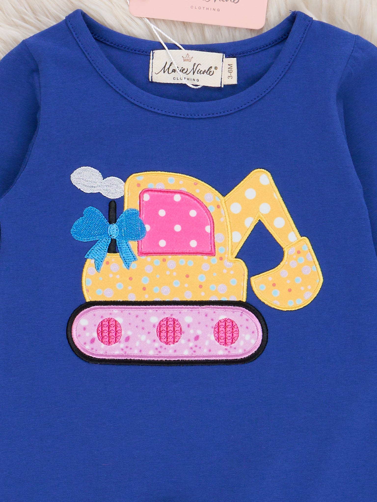 Get ready to dig in style with this sibling set. Perfect for fall, this girls romper features a blue bodice with an embroidered excavator design and a playful ruffle ankles. Let's get to work (and play)!