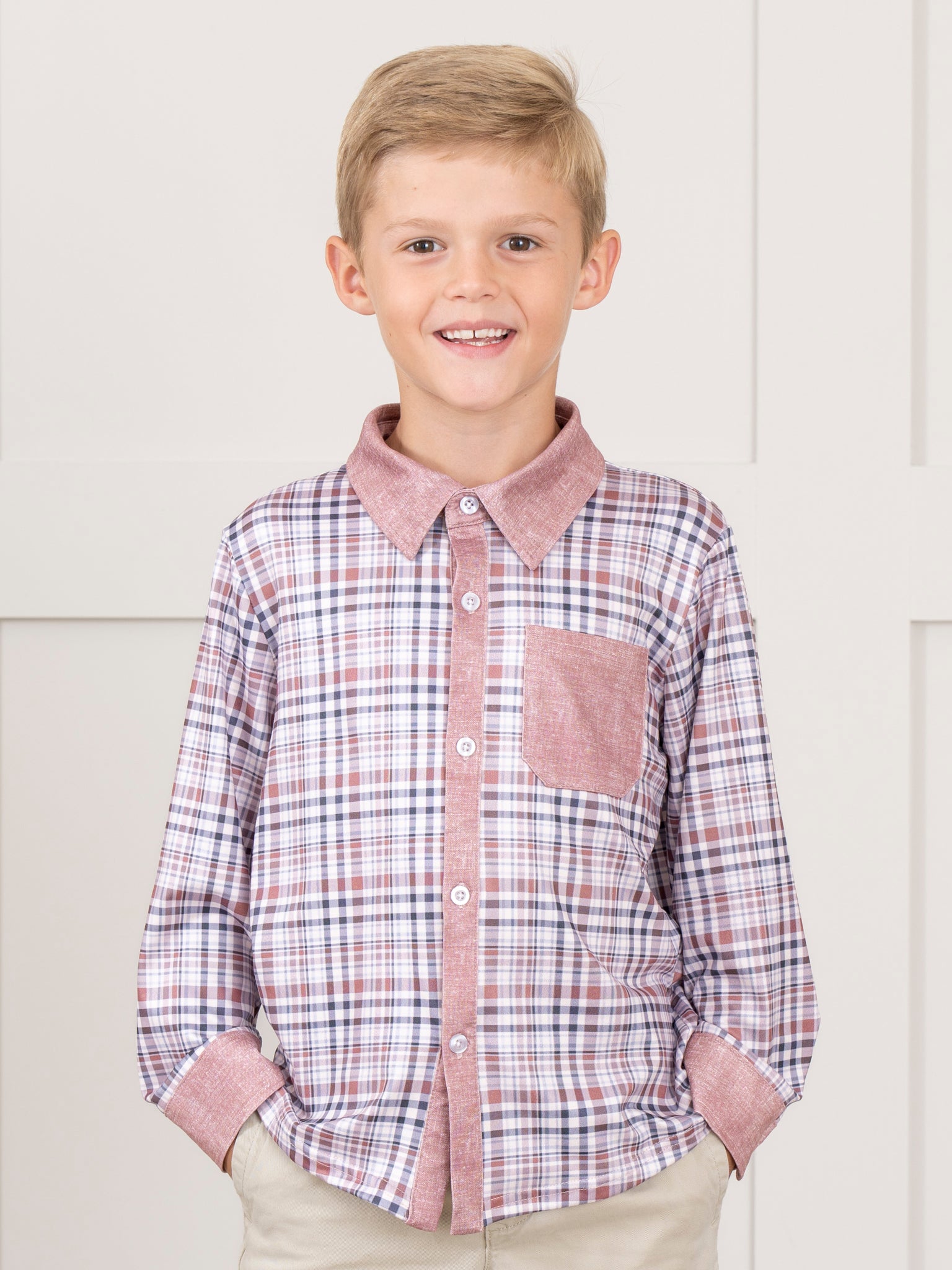 The Pocket Button Up Plaid Shirt in Tan is a classic and cozy choice that’s perfect for everyday adventures and seasonal outings. Featuring a charming plaid pattern, button-up front, and convenient chest pocket, this shirt from Marie Nicole Clothing blends timeless style with comfortable wearability. Made from soft, breathable fabric, it’s ideal for playtime, family gatherings, and picture-perfect moments.