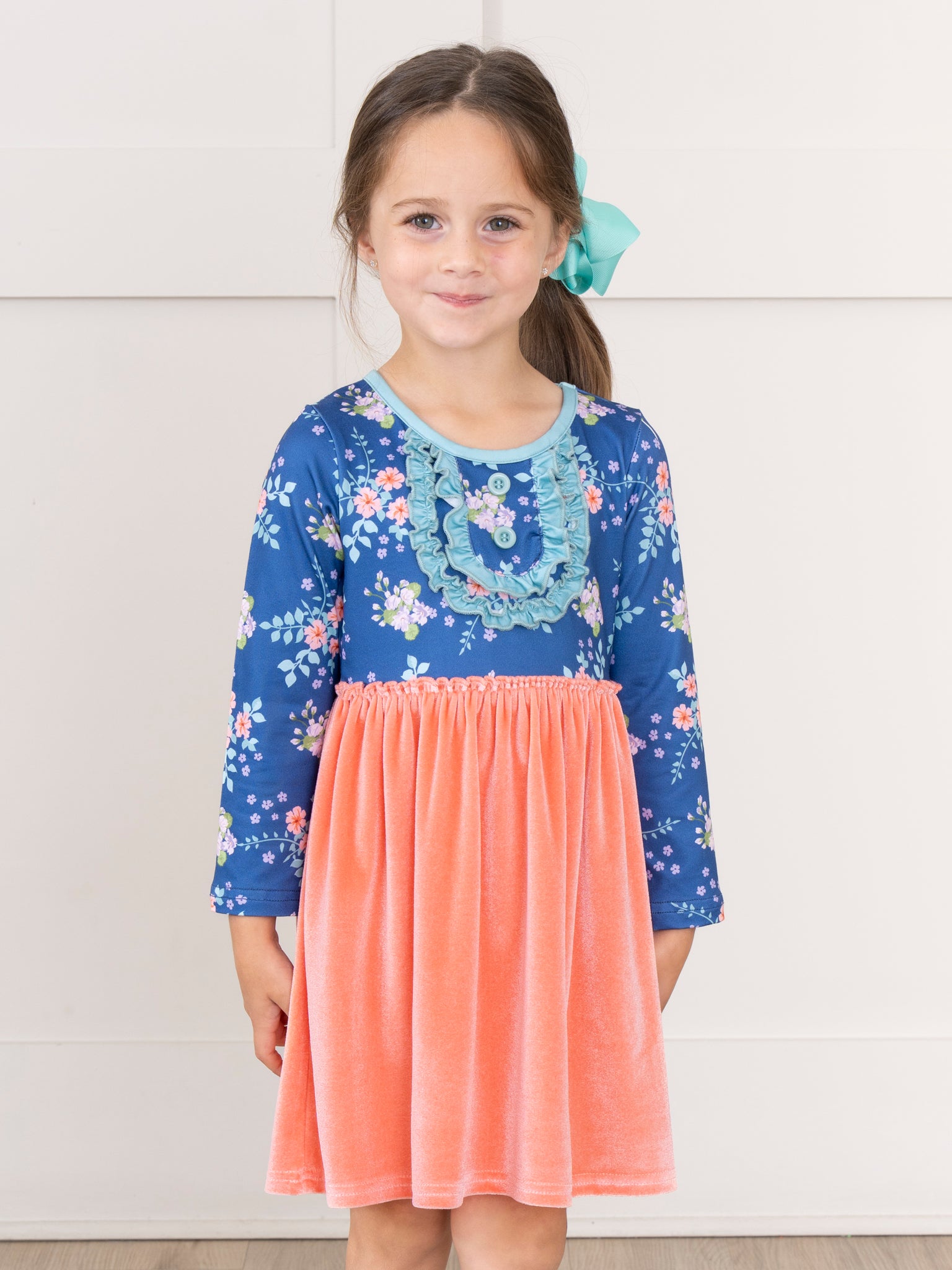 Child wearing a red dress with white floral patterns on a wooden floor.