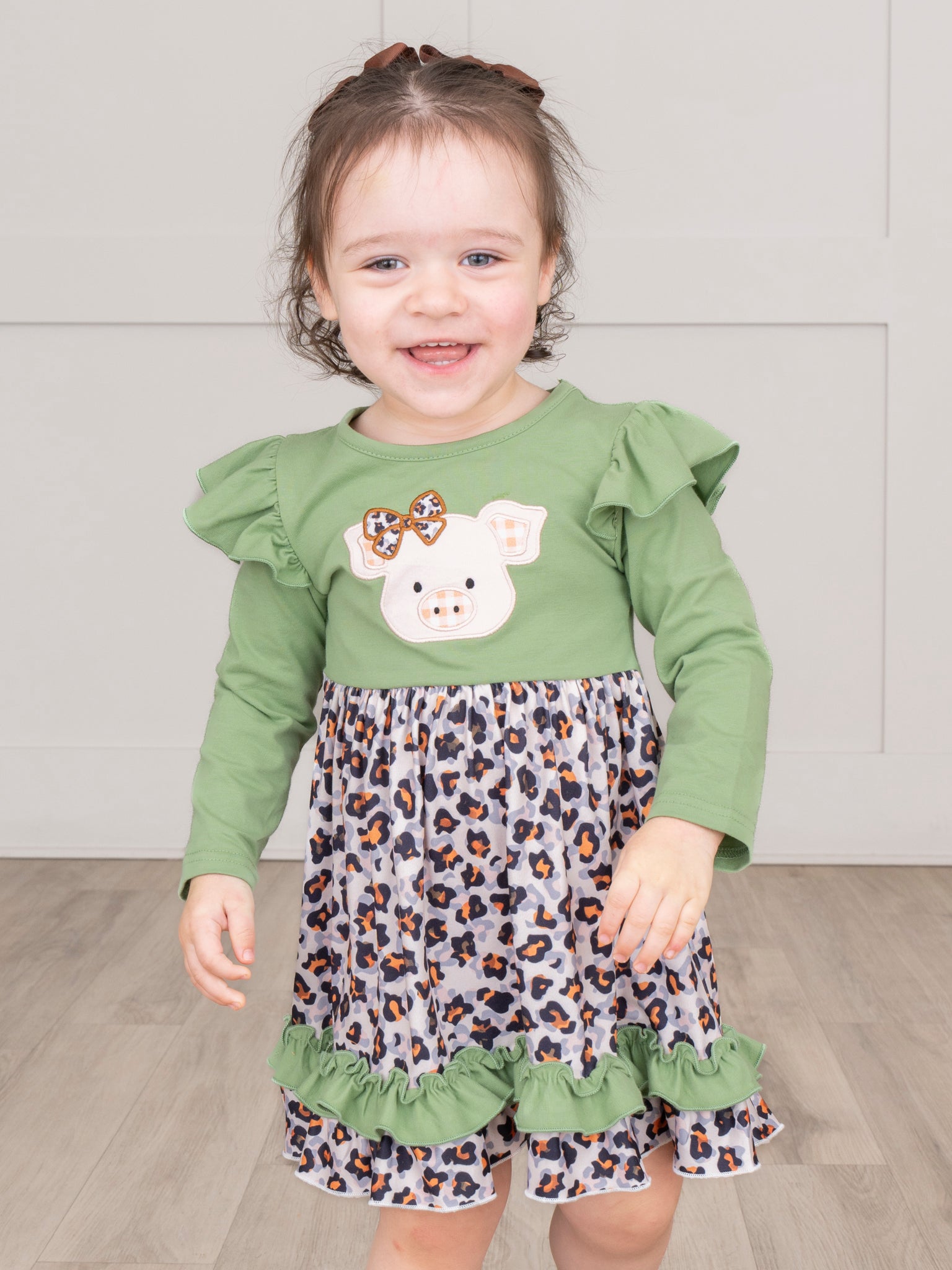 Embroidered Leopard Bow Piggy Ruffle Dress