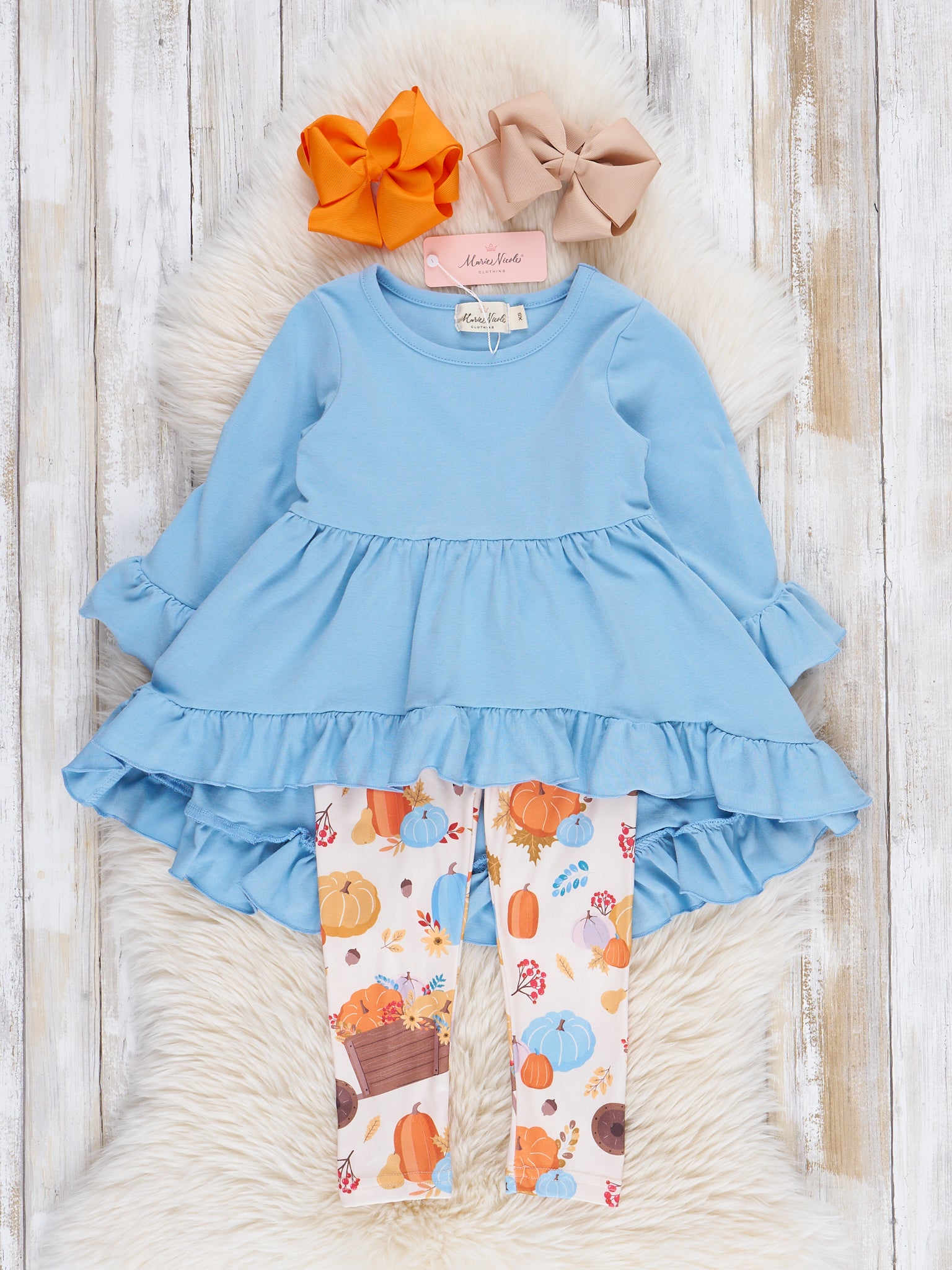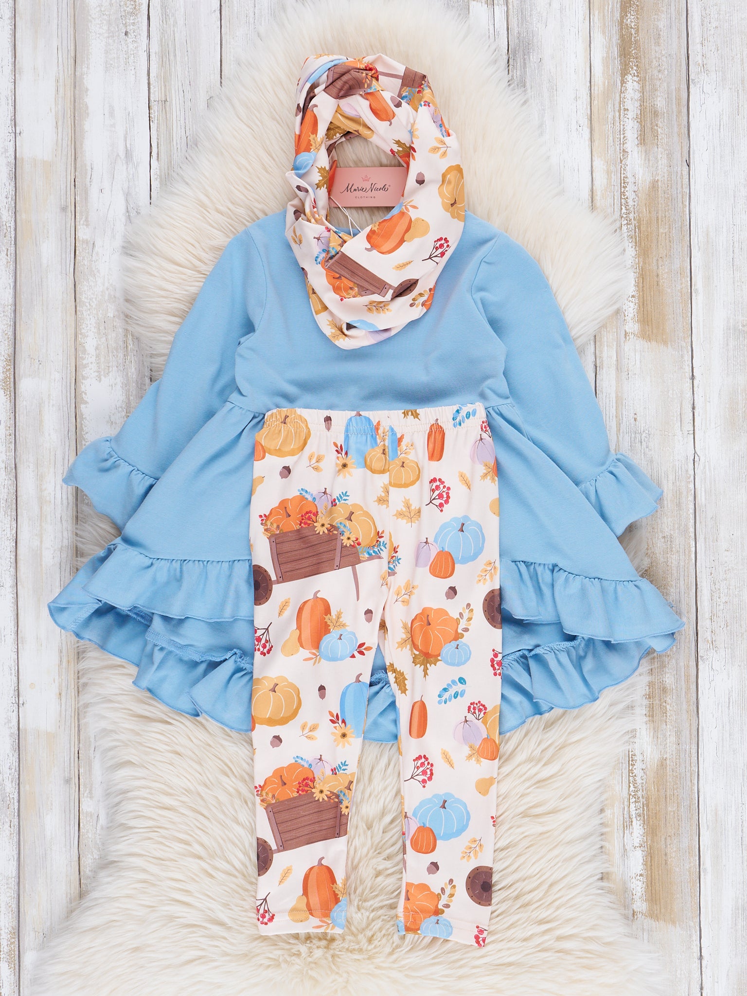 'Tis the season for pumpkins and ruffles! Get ready for the chilly autumn days with this cute sister set! The perfect combination of timeless pumpkin harvest and a chic scarf-style top will keep you fashionably warm this season! Start lighting those pumpkin candles, and get ready to turn heads in this unique and stylish scarf ensemble!