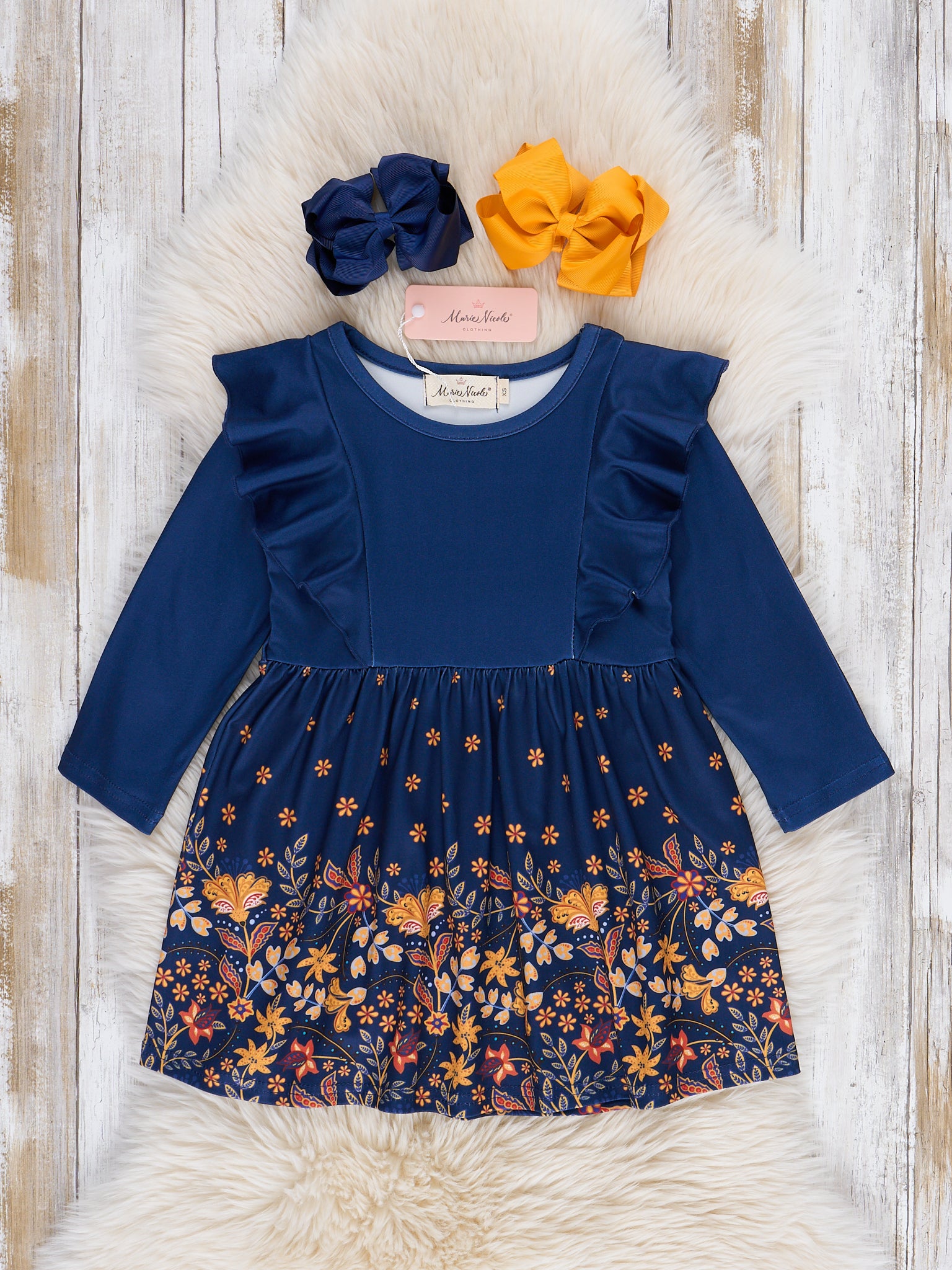 Let your little one bloom in our Navy Floral Harvest Ruffle Dress. Perfect for any occasion, this dress features a playful ruffle detail and a sunny yellow floral print. With a navy bodice, your girl will stand out in style and comfort.