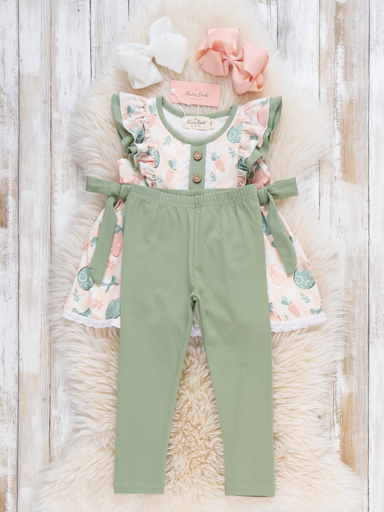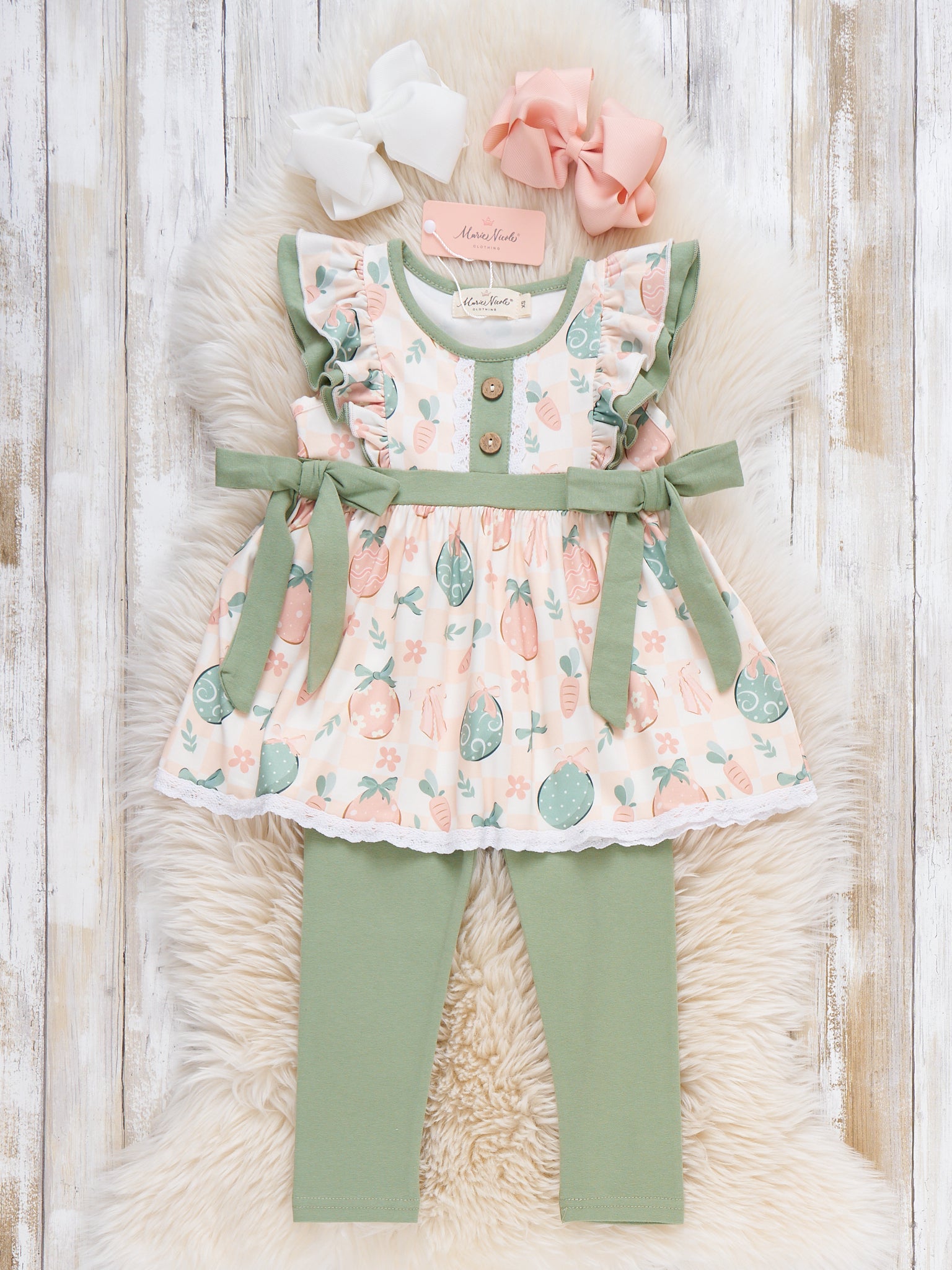 Celebrate Eggs Ruffle Outfit by Marie Nicole Clothing features a flutter-sleeve tunic top with allover Easter egg print, lace-trim hem, and side sash bows, paired with coordinating knit leggings for a comfy fit. This cheerful spring set blends playful holiday motifs with easy stretch fabric, making it perfect for egg hunts, parties, and picture-ready outings.