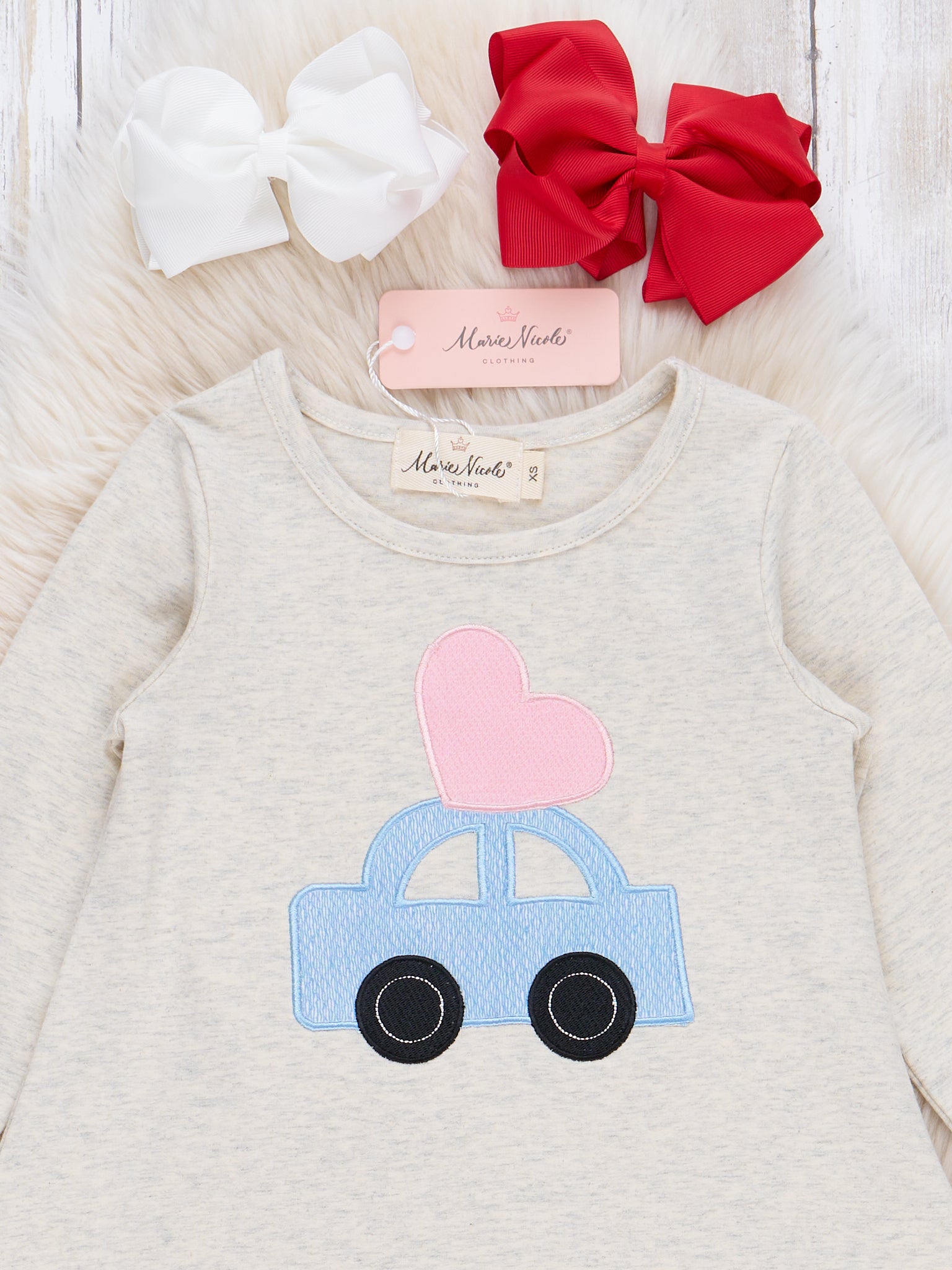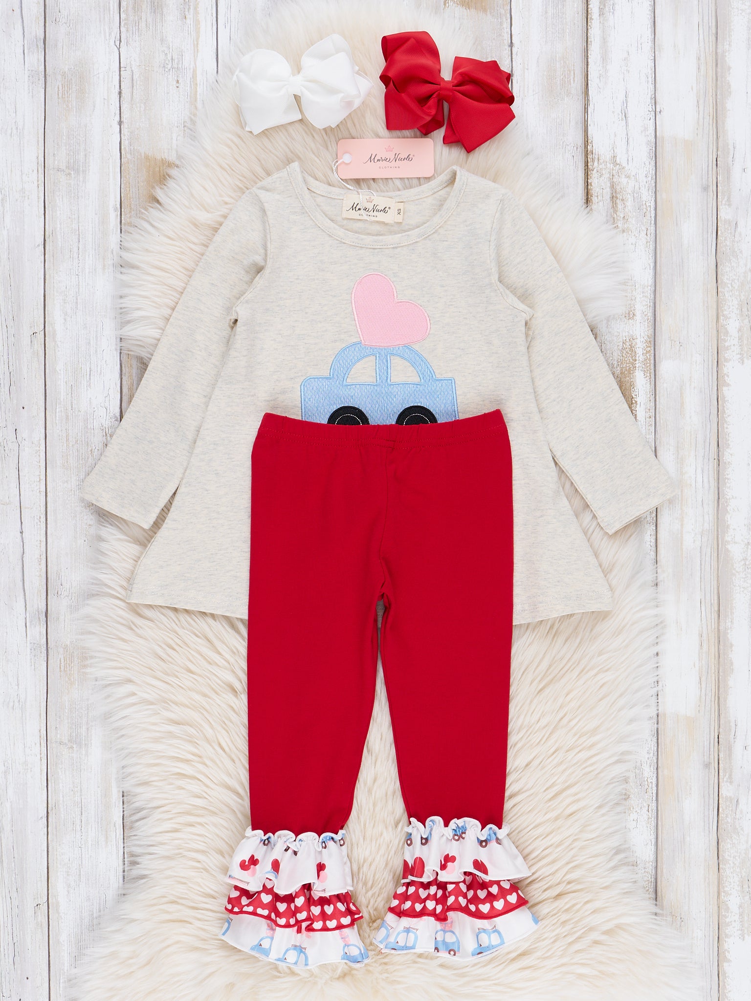 Feel the love with this playful Heart Topped Car Ruffle Romper! Perfect for Valentine's Day, this girls romper features a yellow striped bodice with an embroidered car and fun vibrant red ruffle leggings. Make a statement and show some Valentine's Day love with this stylish and unique romper by Marie Nicole Clothing!