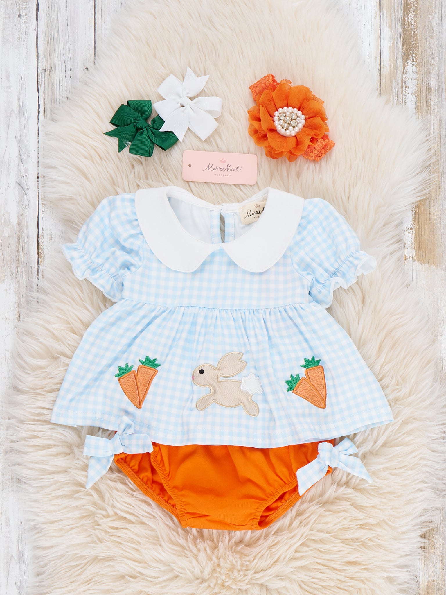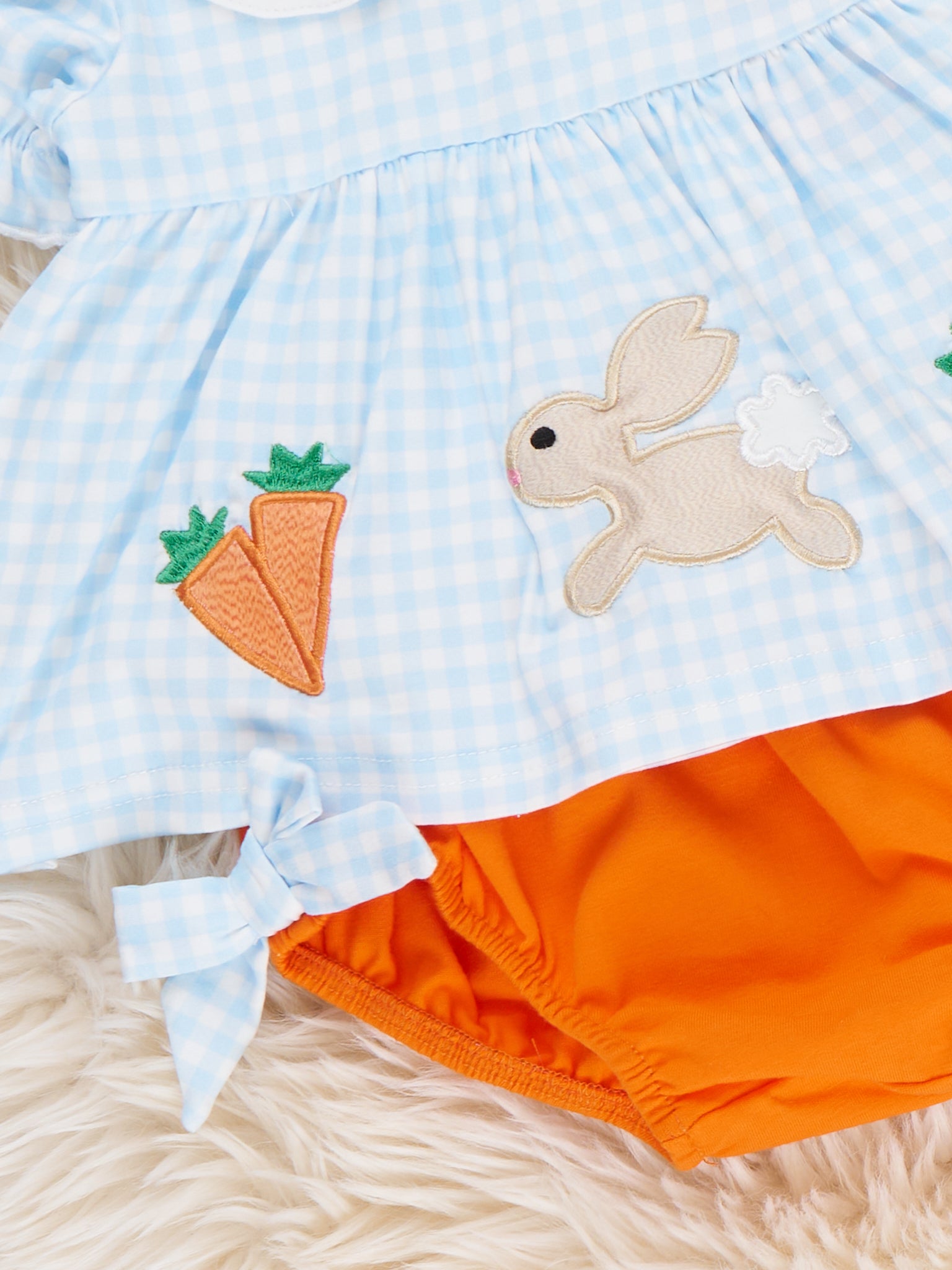 Hop & Harvest Embroidered Bloomers Outfit by Marie Nicole Clothing features an embroidered top with bunny and carrot appliques, scalloped collar, and puff sleeves, paired with coordinating bloomers finished with side bows. The playful mix of festive motifs and comfortable design makes this set ideal for spring occasions, family gatherings, or cheerful everyday wear. It offers a sweet and practical look for active little ones.