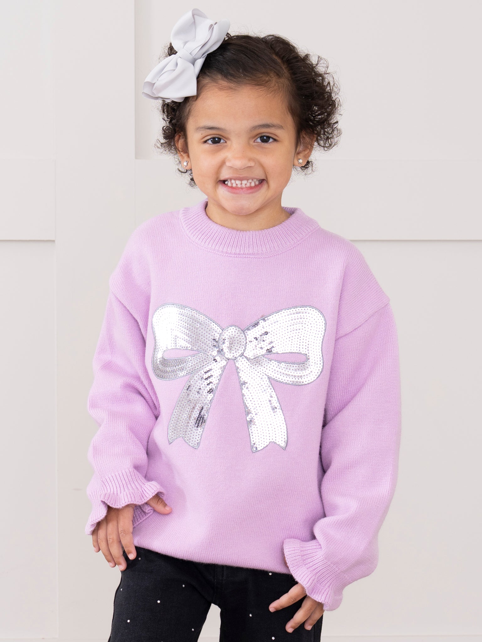 The Sequin Ribbon Sweater by Marie Nicole Clothing features a cozy knit fabric with a standout ribbon bow appliqué on the chest and softly gathered cuffs. This timeless layer adds charm and warmth to any outfit, making it perfect for both everyday wear and special occasions.