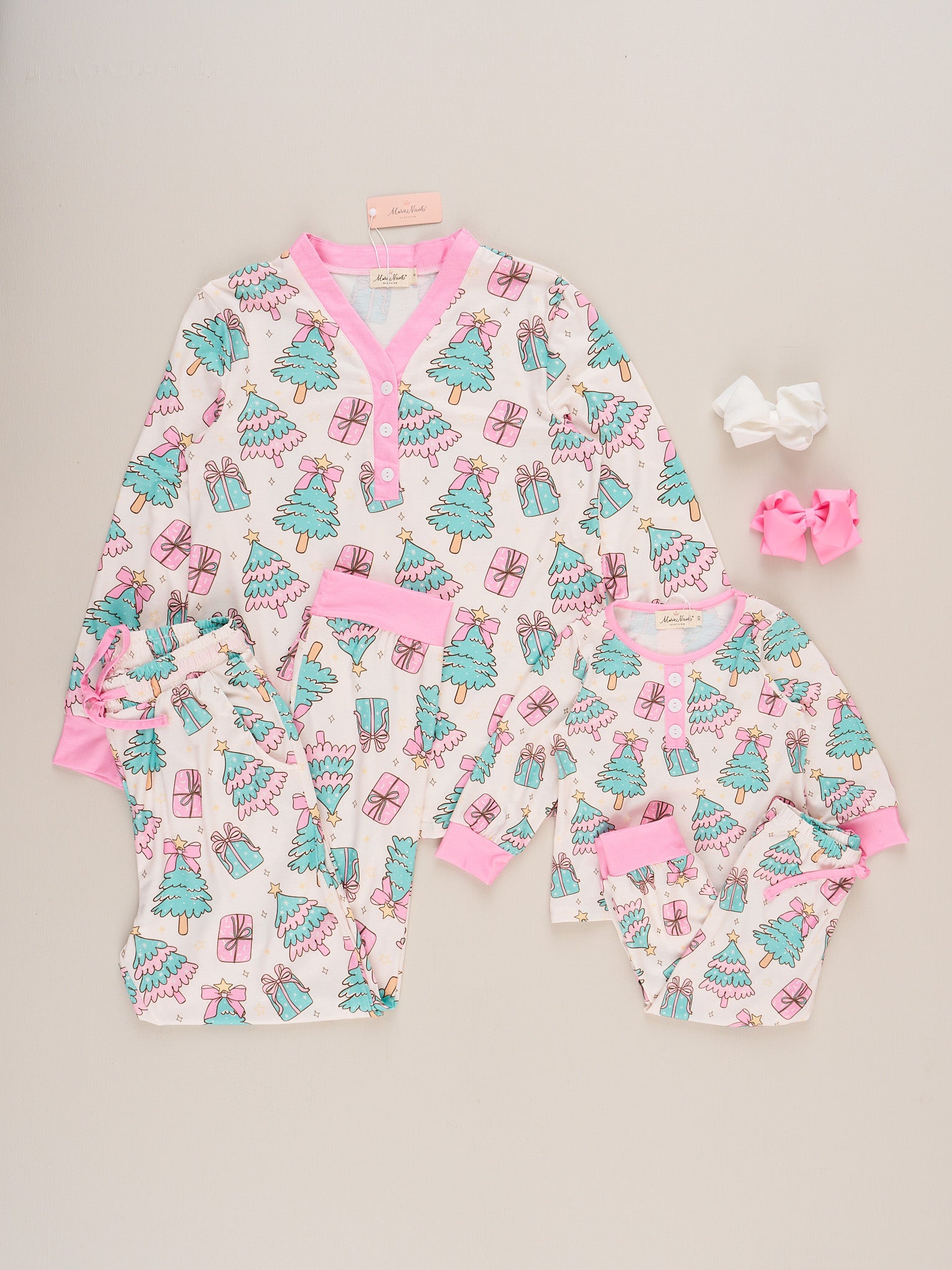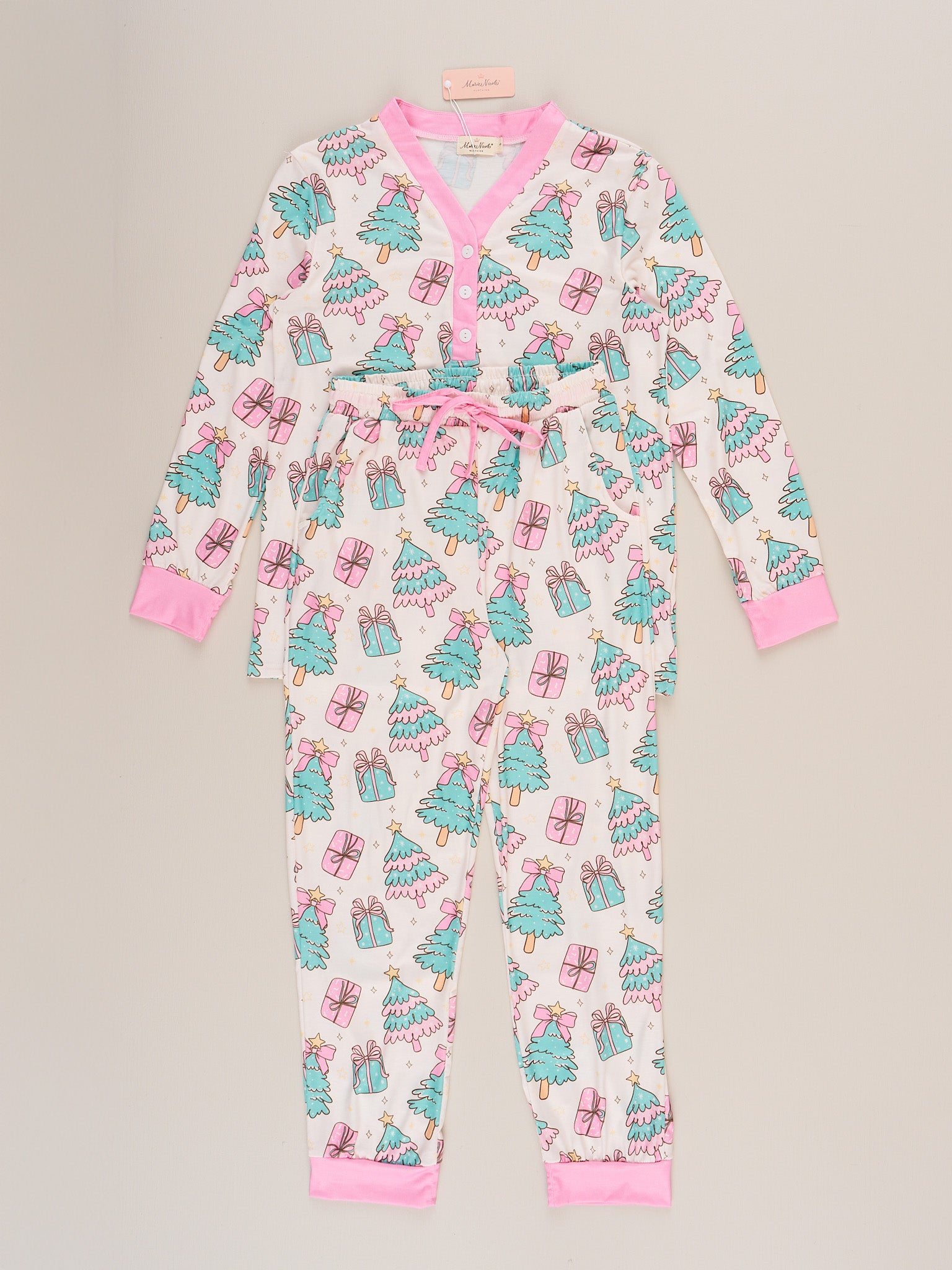 The Mom & Me Frosty Tree Gift Pajamas by Marie Nicole set features a festive long-sleeve top and matching pants covered in a playful allover print of decorated trees and wrapped gifts, finished with classic ribbed cuffs and button details. This coordinating set is designed for comfort and cheerful celebrations, perfect for creating matching moments.