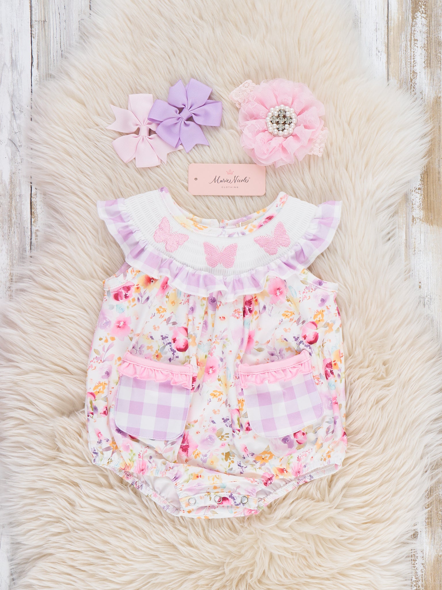 Lilac Butterfly Garden Smocked Bubble Romper
