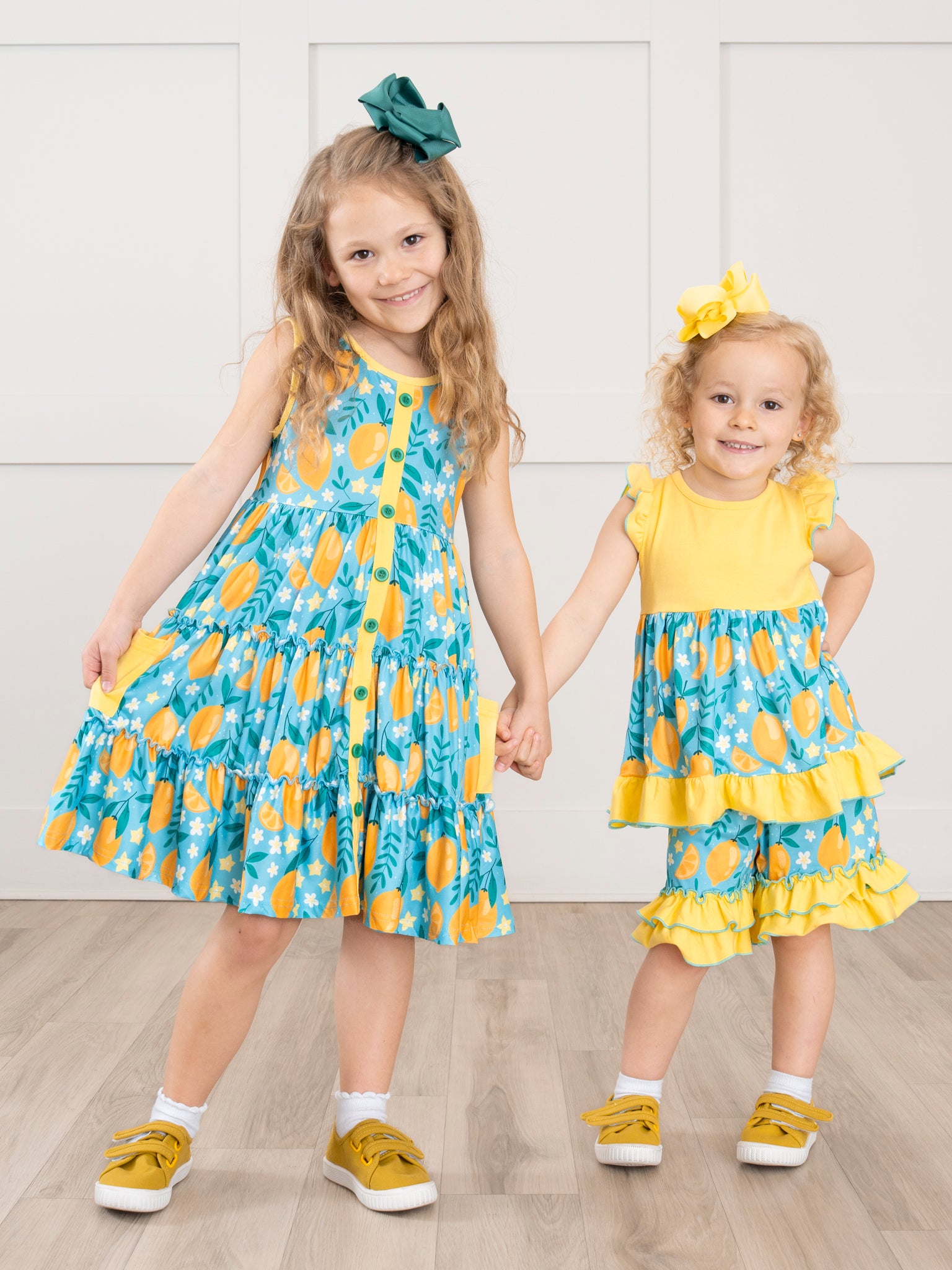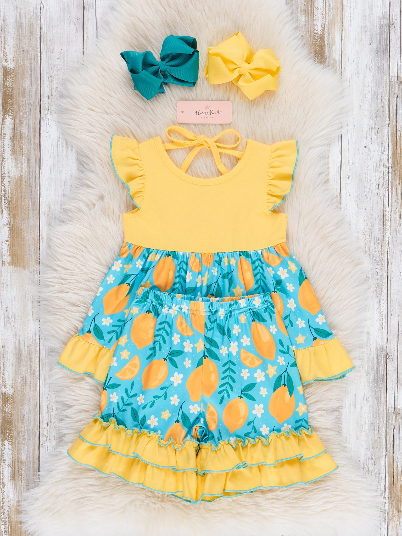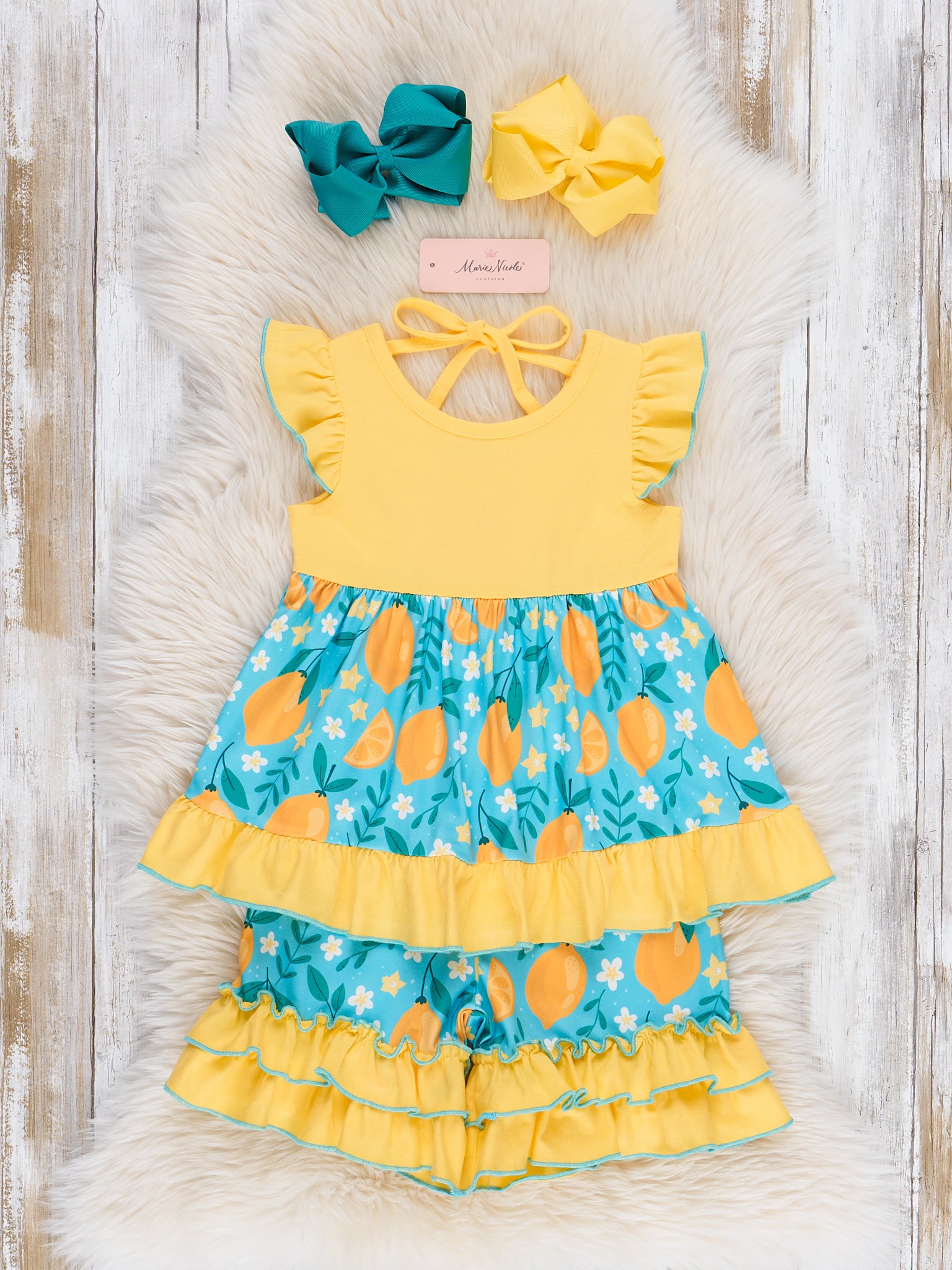 The Lemon Slices Tiered Ruffle Outfit from Marie Nicole Clothing is a fresh and fun summer outfit that brings a burst of sunshine to any wardrobe. Featuring a playful lemon print in yellow and blue, this outfit is designed with tiered ruffles for a sweet, twirl-worthy look.