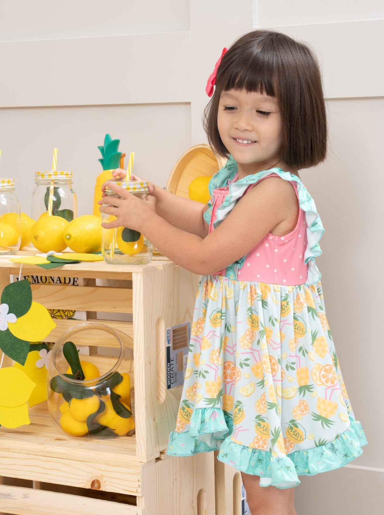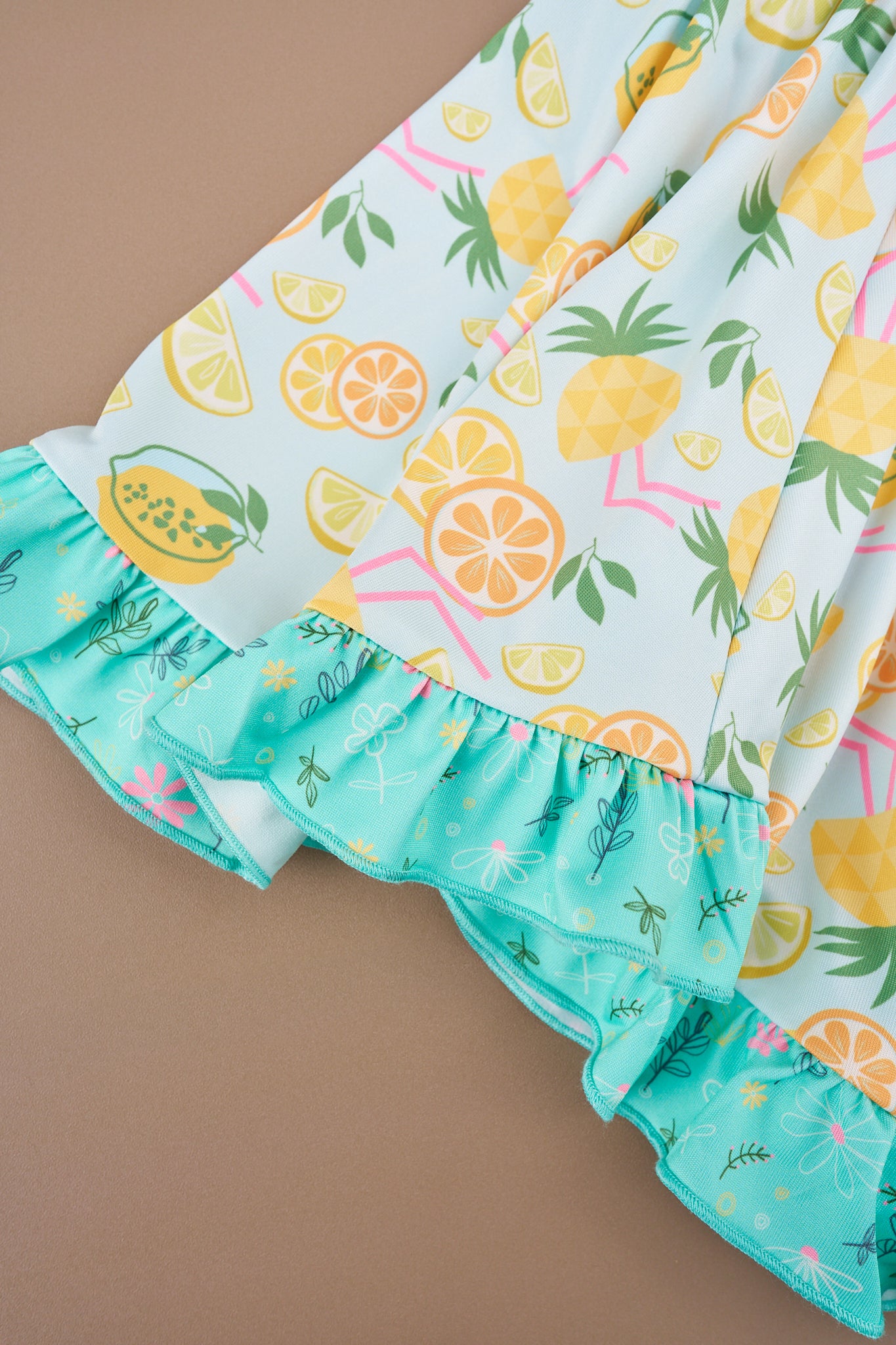 This collection features a stunning, hand-drawn print with a medley of pineapples, lemons, limes, and oranges.
