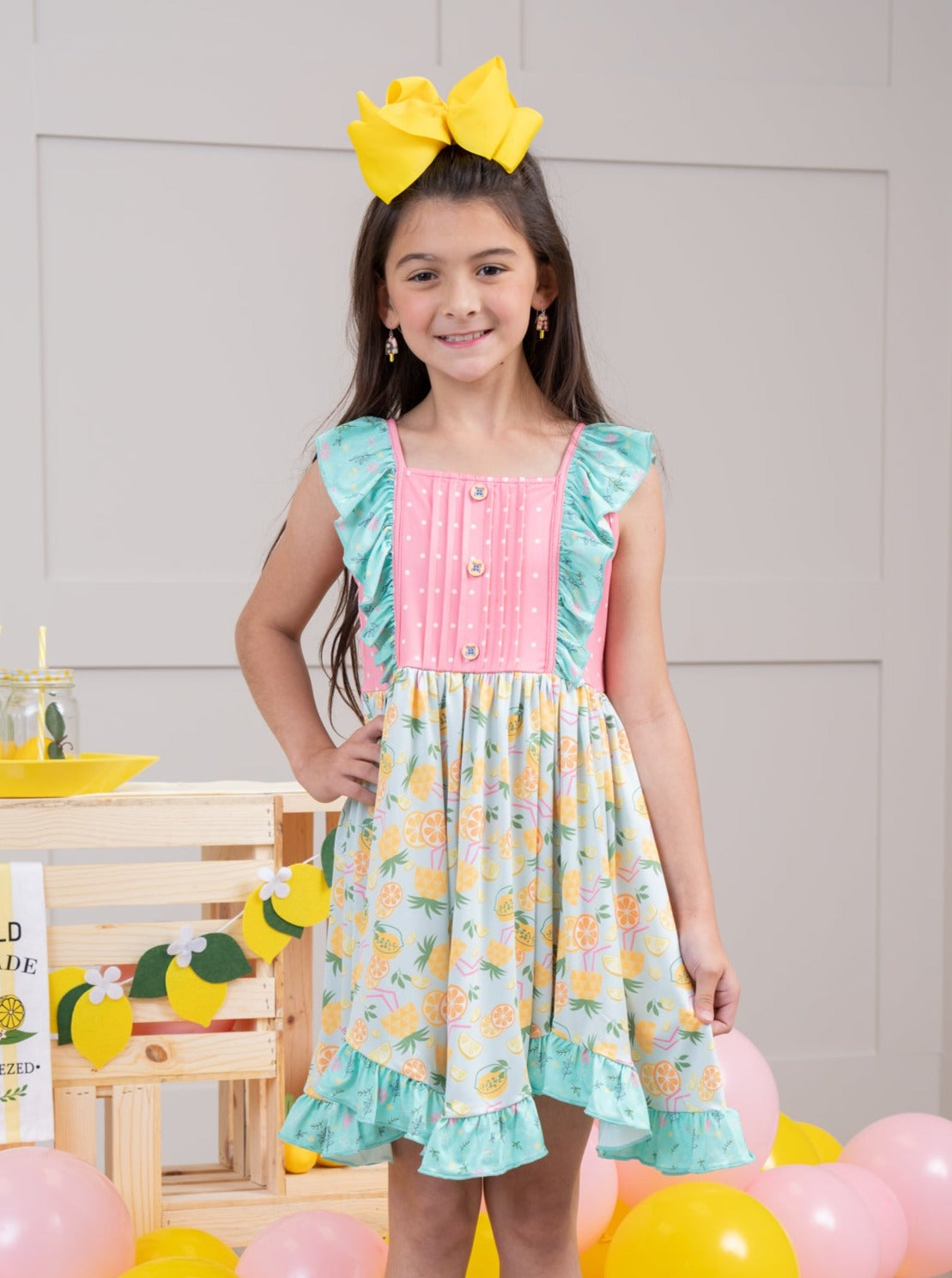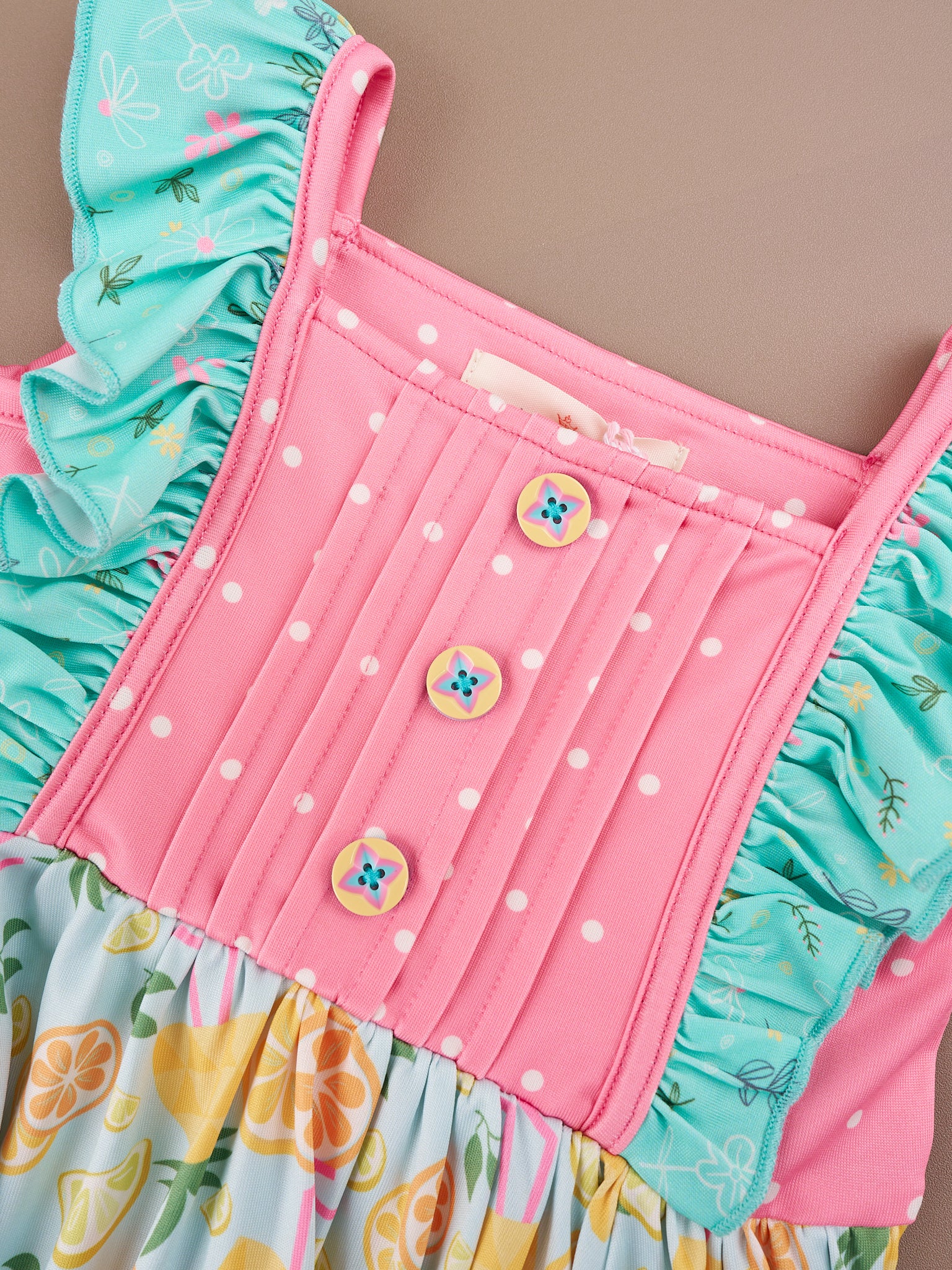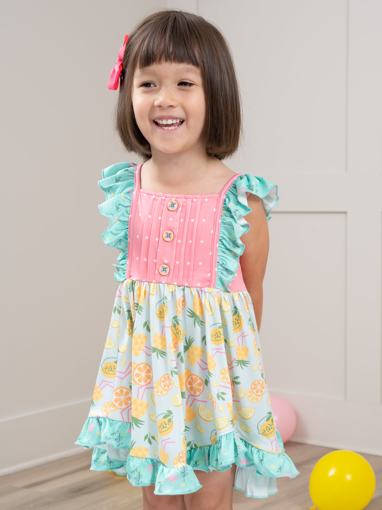 Introducing MNC x LOVE's newest collection, our Tropical Twist Collection. Each garment is made of a high-quality material that ensures comfort, durability, and longevity. This dress features our Tropical Twist print, daisy ruffles, detailed decorative buttons, polka dots, a scalloped hemline, & a keyhole at the nape of the neck.