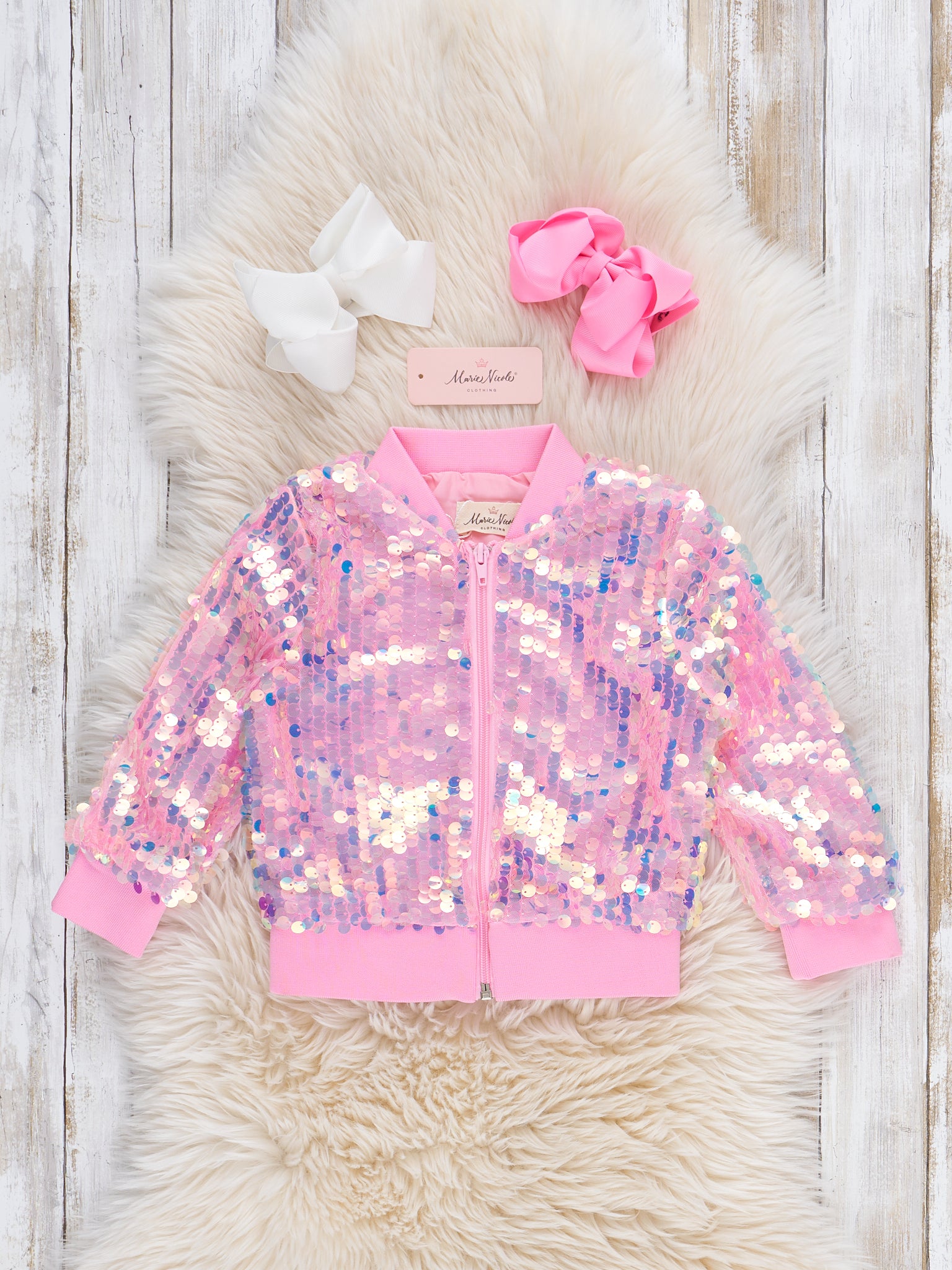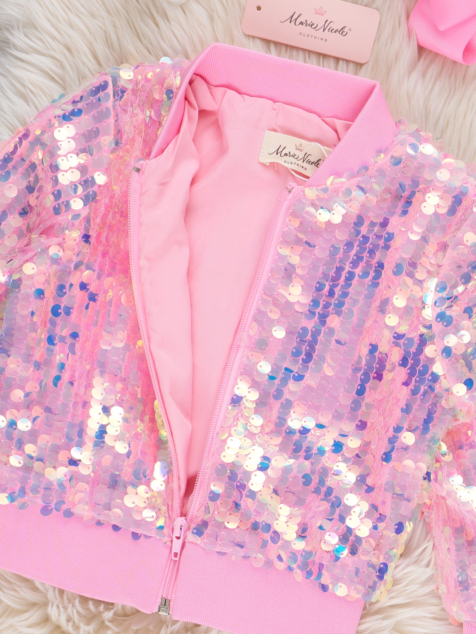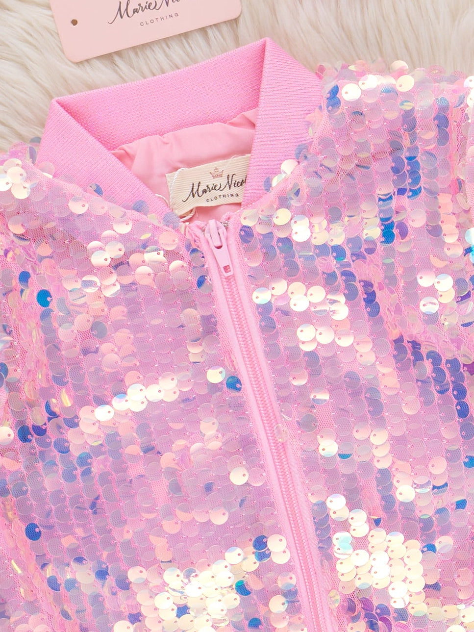 The Dazzle Bomber Jacket by Marie Nicole Clothing features an all-over sequin design for sparkling effect, complemented by a zip-up front, ribbed cuffs, and hem for comfort and style. This statement jacket is perfect for adding a playful, glamorous touch to any outfit.