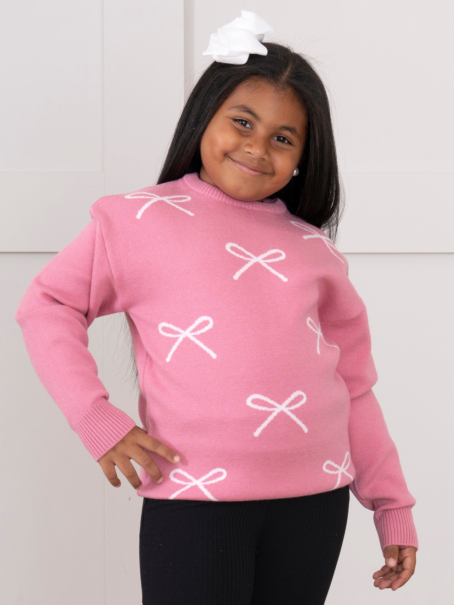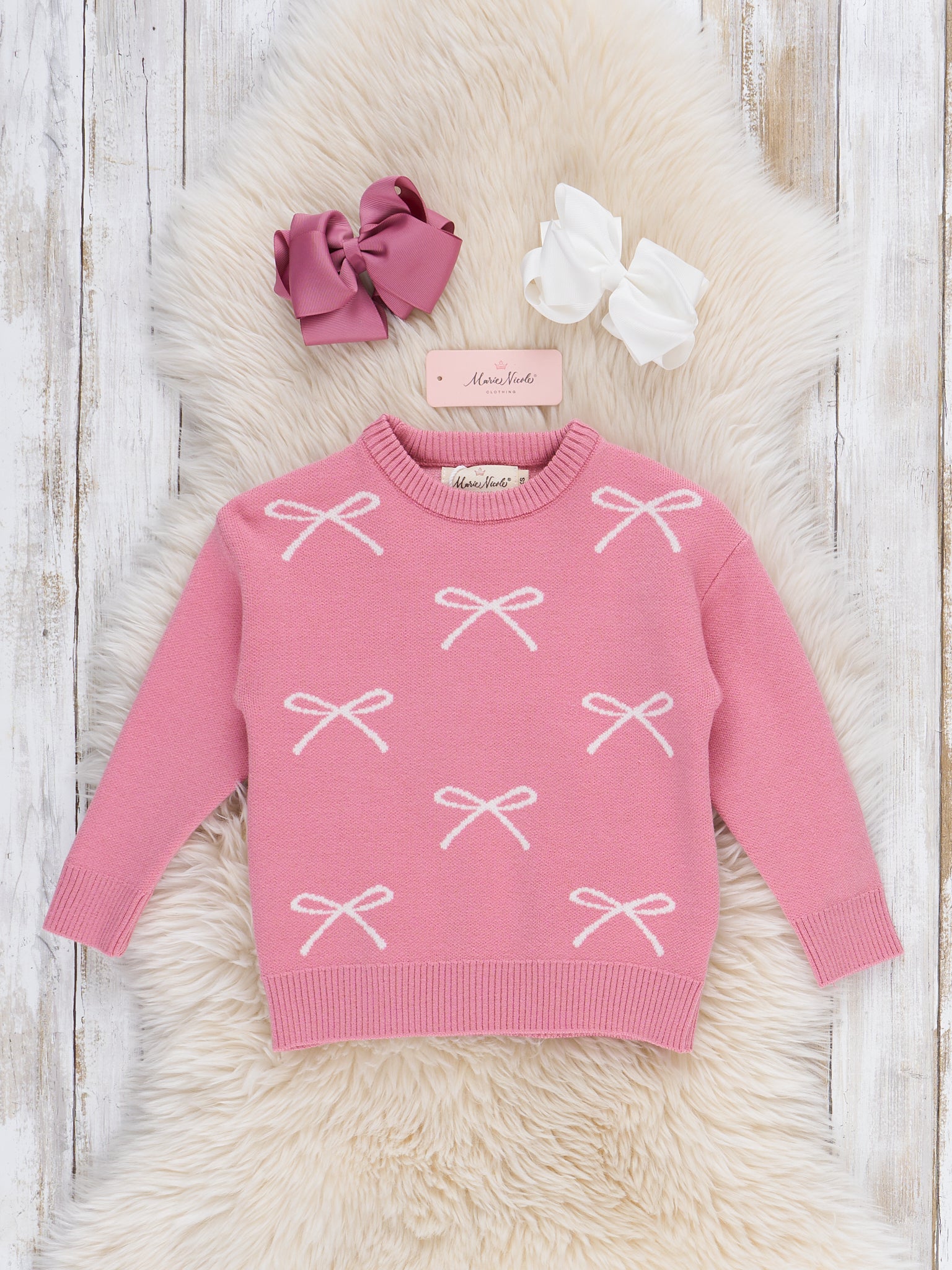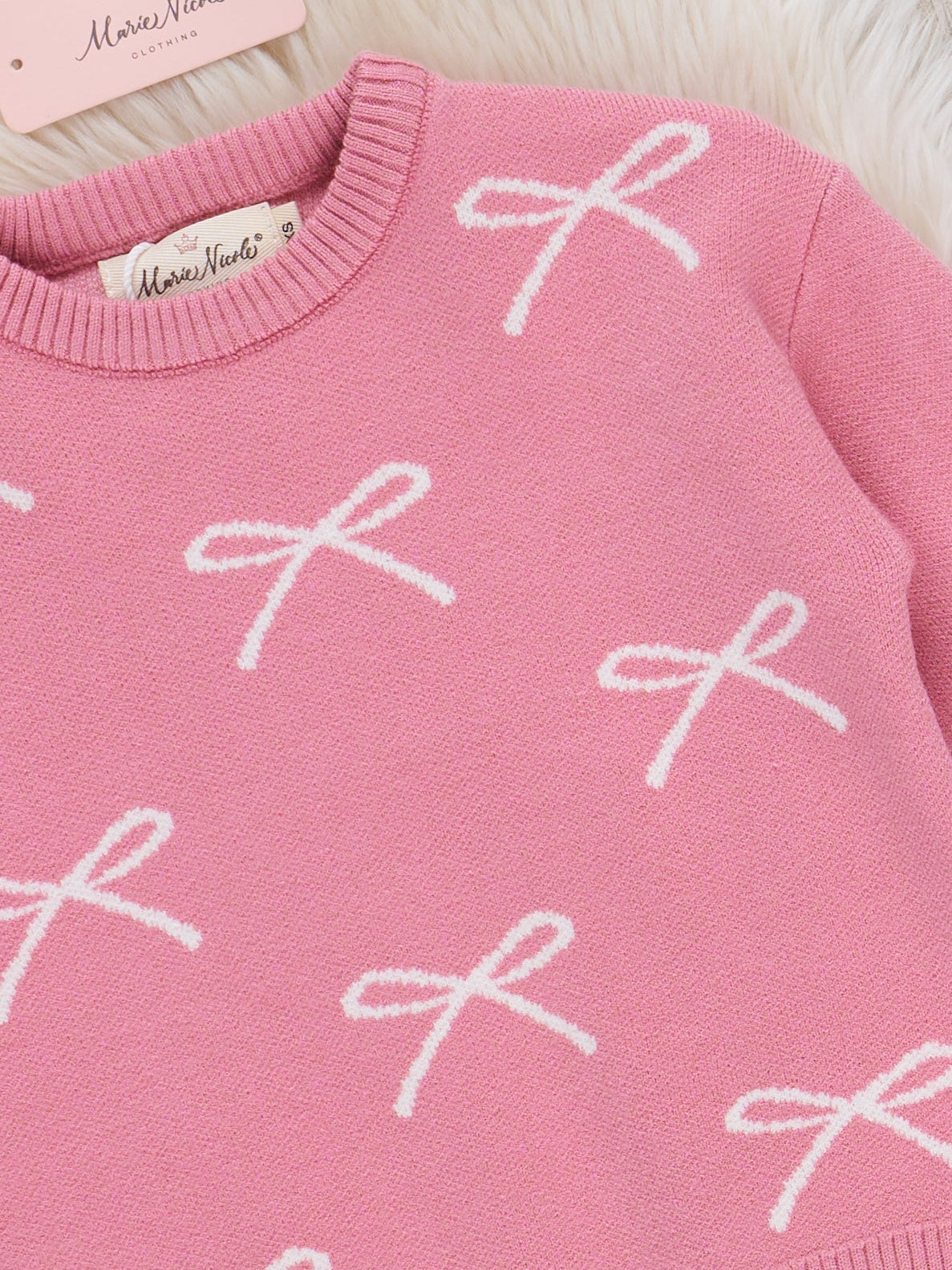 The Rose Sweet Ribbon Sweater in Rose features a cozy knit design adorned with delicate bows, knit directly into the front. With its soft finish, this pullover by Marie Nicole Clothing adds a charming touch to everyday outfits, staying warm and cute for fall or winter, Thanksgiving or Christmas!