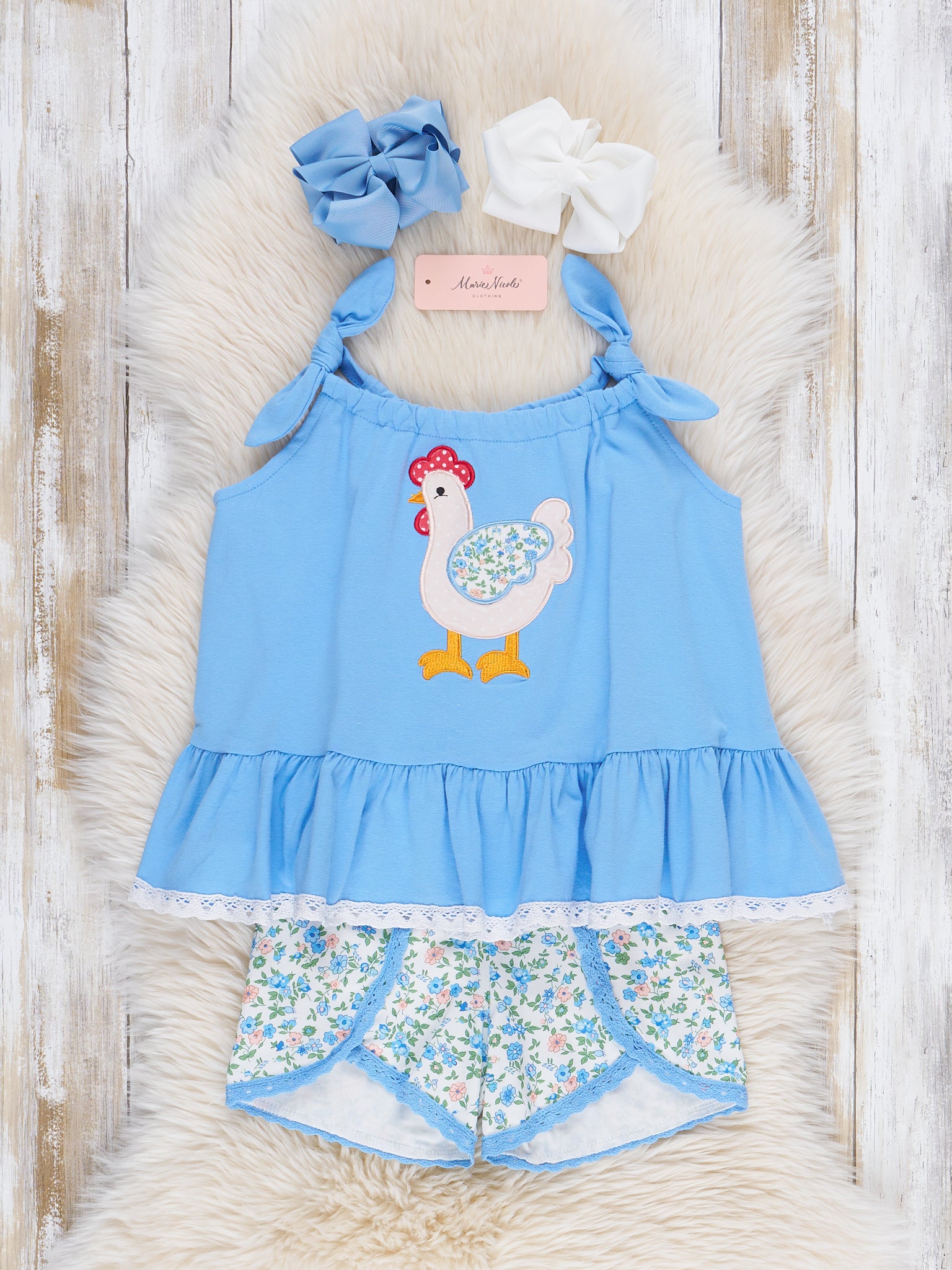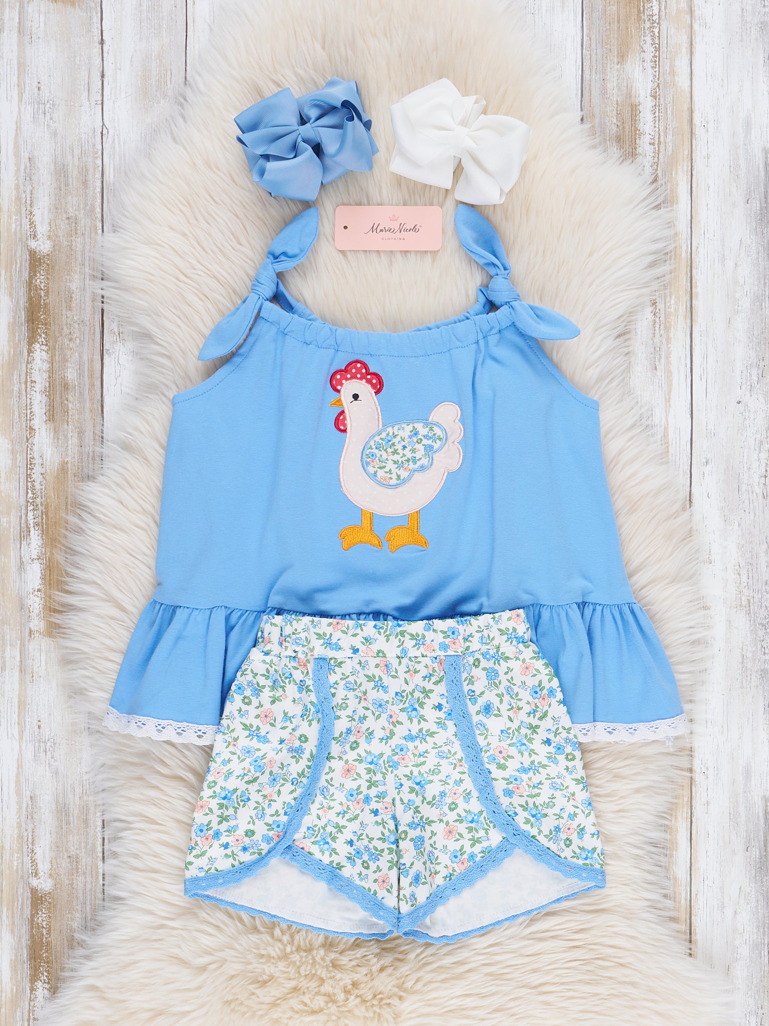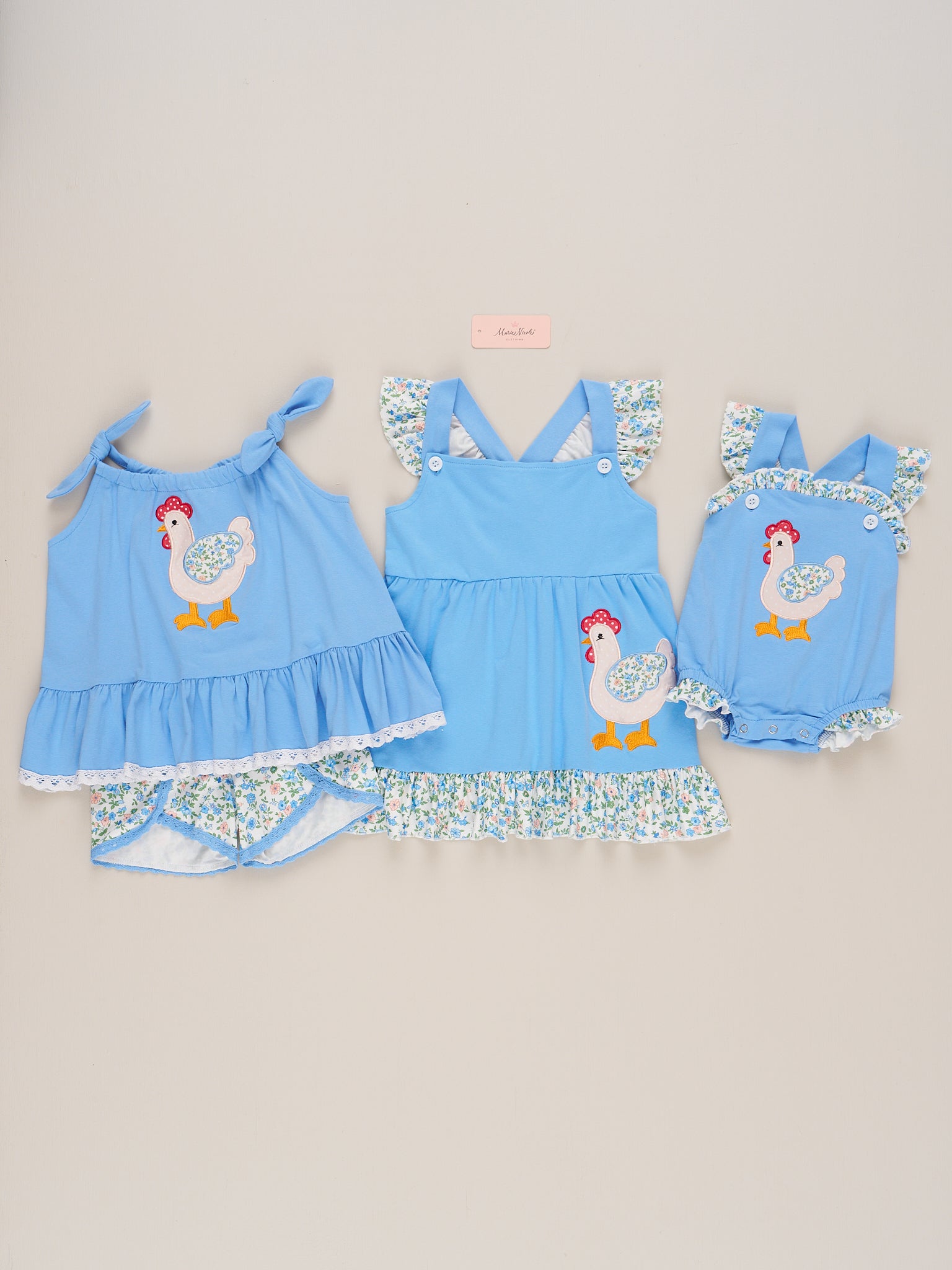 Bring a touch of farmhouse charm to her wardrobe with the Country Chicken Floral Ruffle Outfit! Featuring a serene cornflower blue background and large chicken detail, this outfit from Marie Nicole Clothing is perfect for summer days, farm visits, or backyard twirls. The delicate ruffle accents on the sleeves and hem add a sweet, girly touch, while the lightweight fabric ensures all-day comfort.