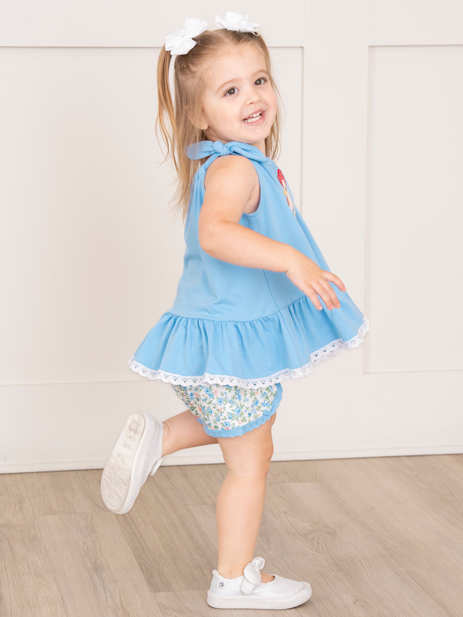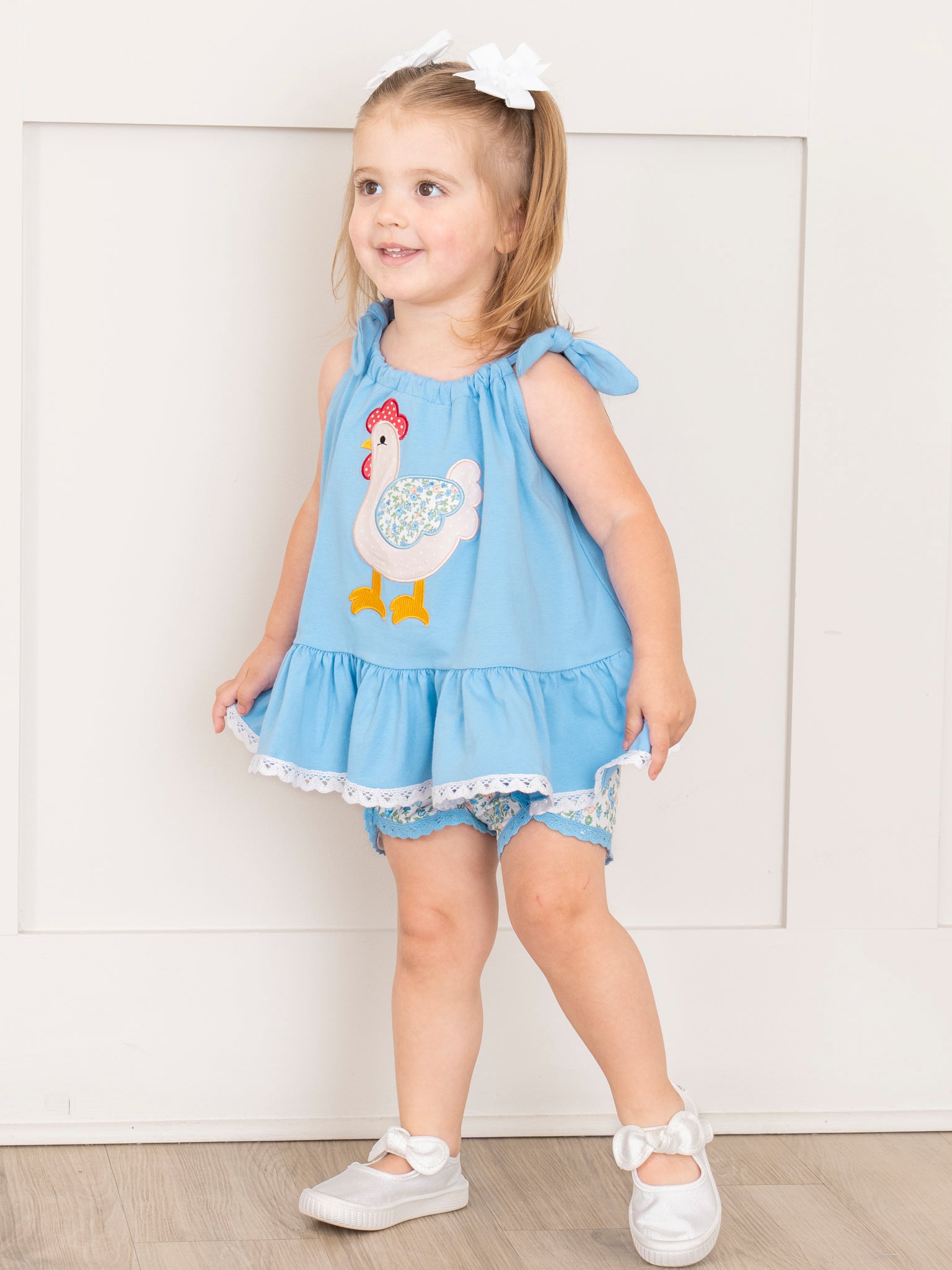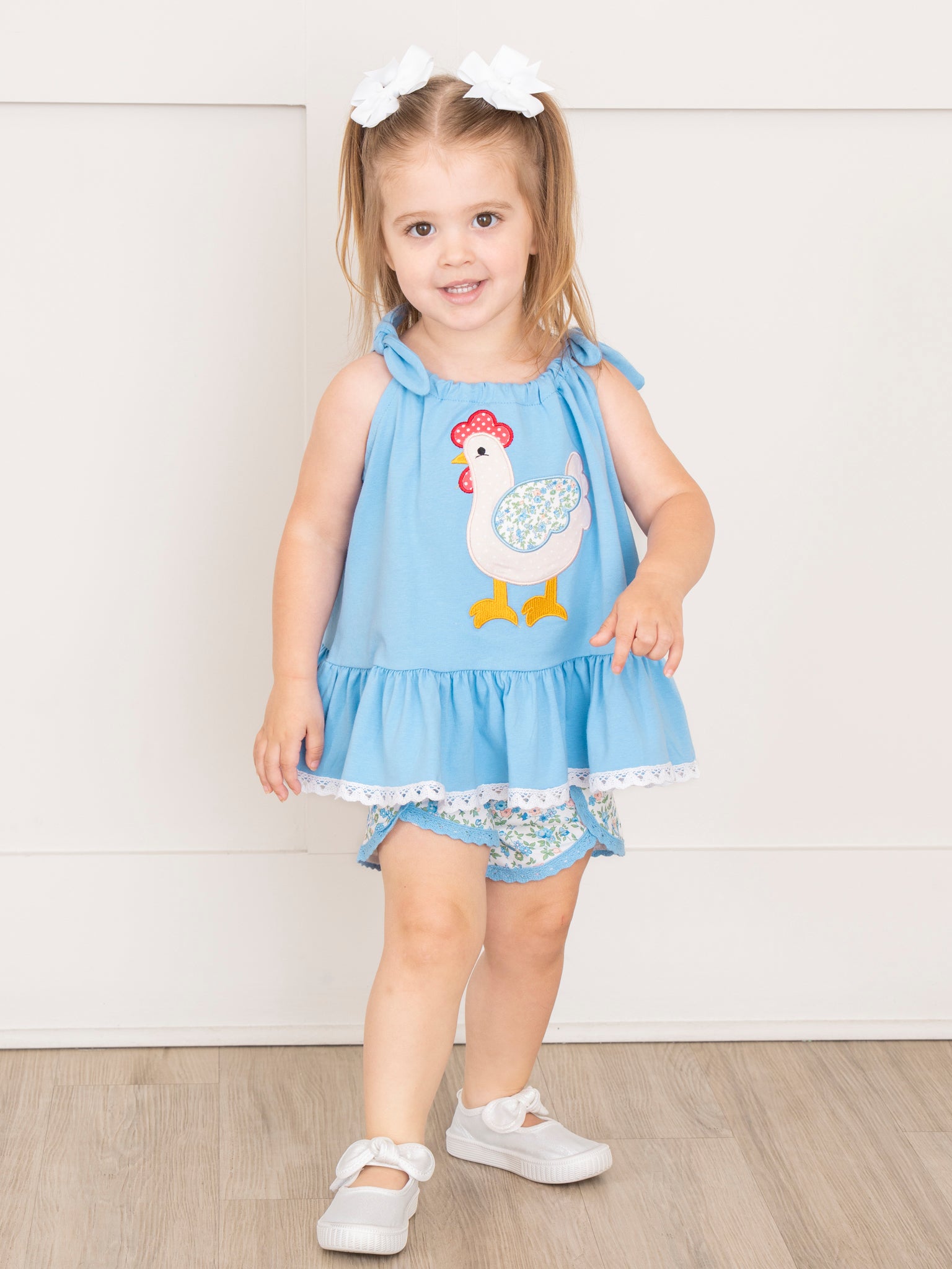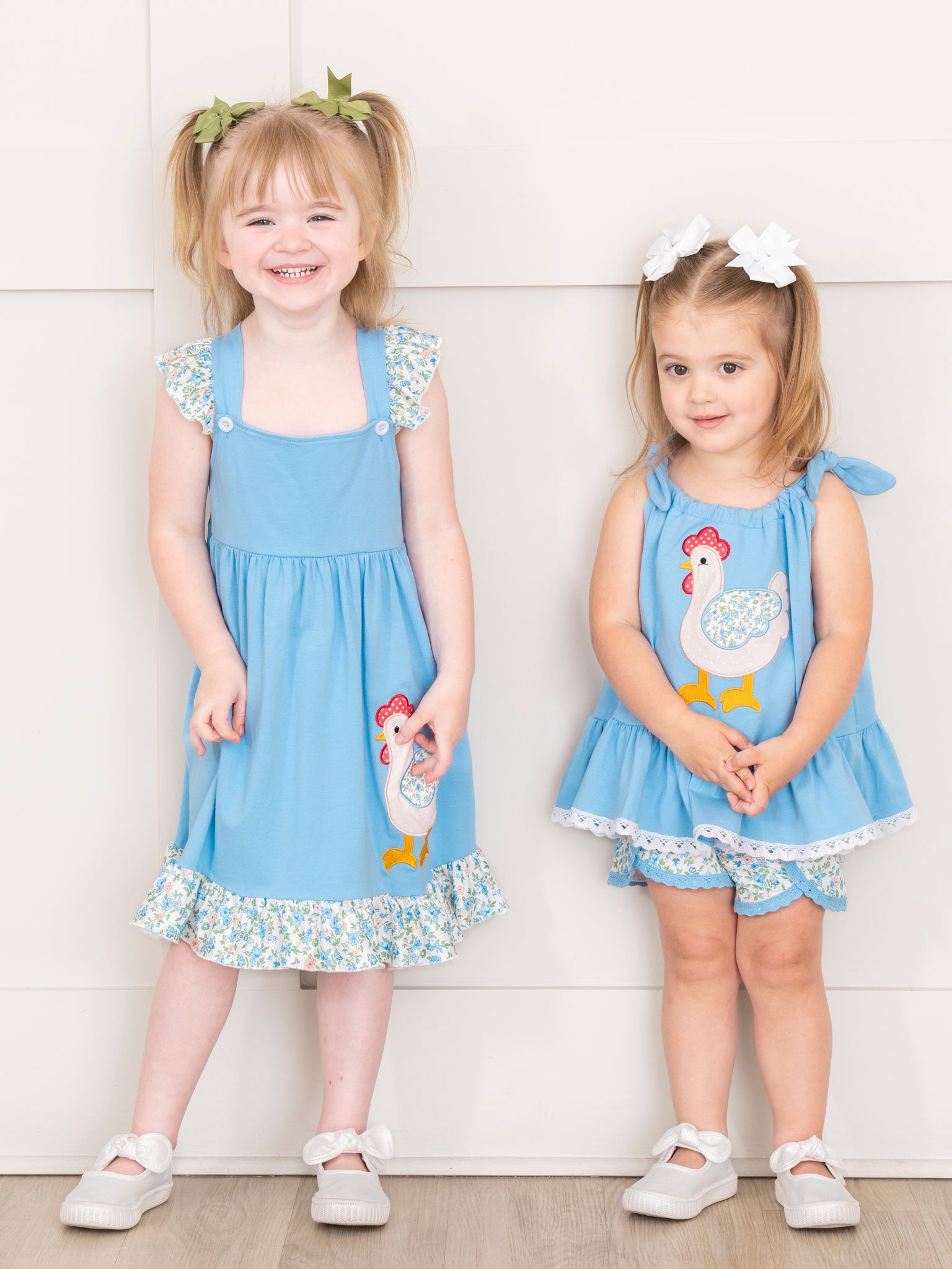 Bring a touch of farmhouse charm to her wardrobe with the Country Chicken Floral Ruffle Outfit! Featuring a serene cornflower blue background and large chicken detail, this outfit from Marie Nicole Clothing is perfect for summer days, farm visits, or backyard twirls. The delicate ruffle accents on the sleeves and hem add a sweet, girly touch, while the lightweight fabric ensures all-day comfort.
