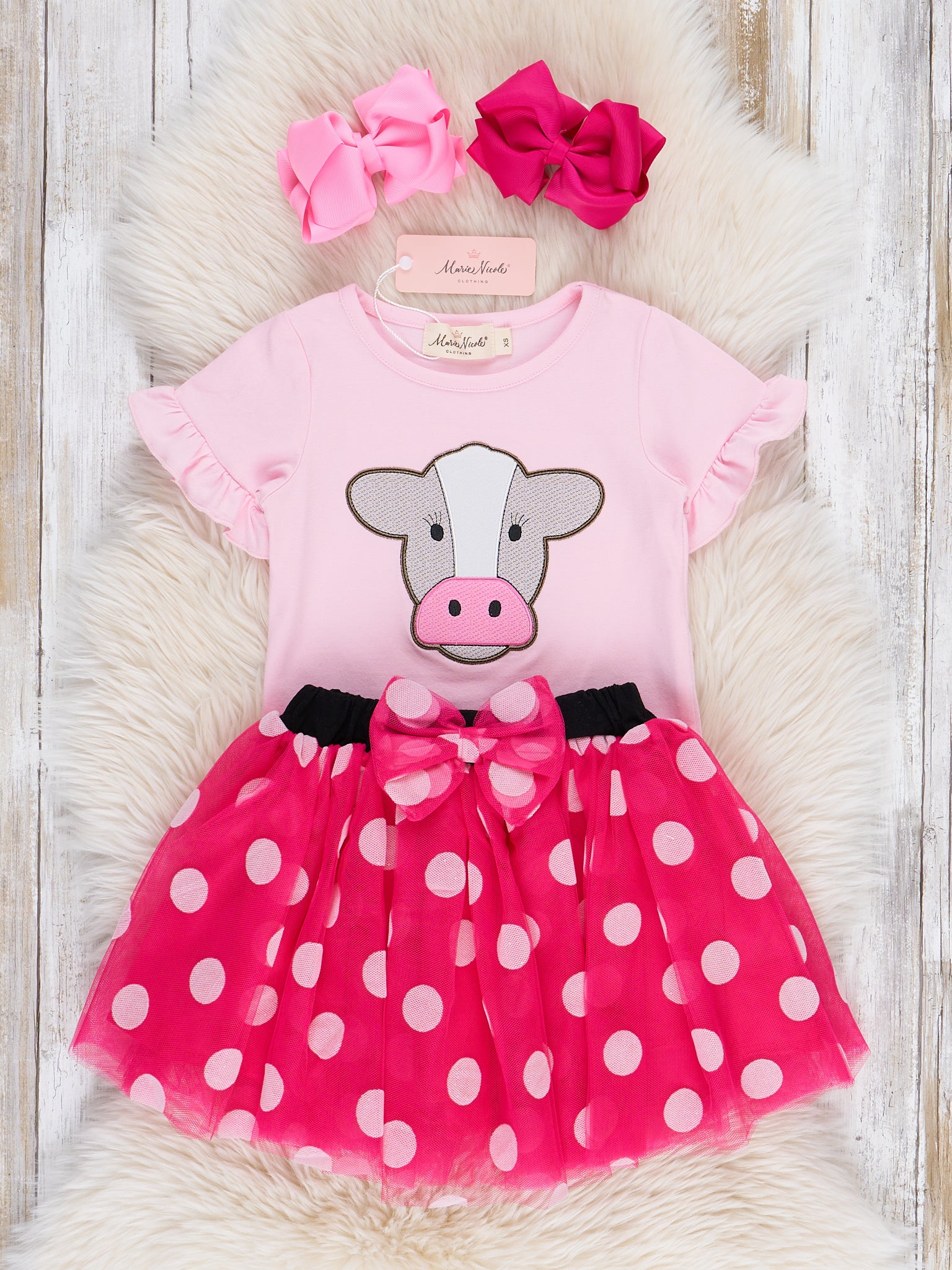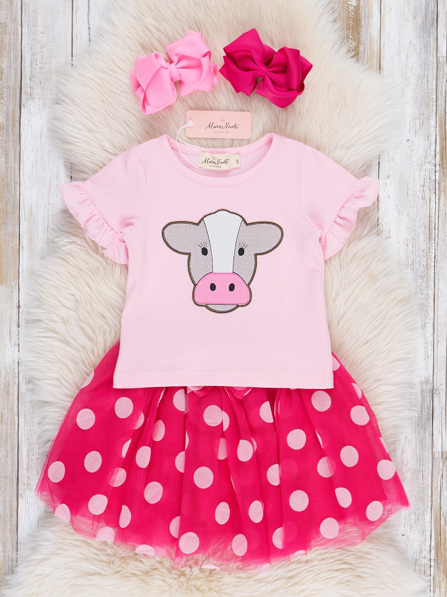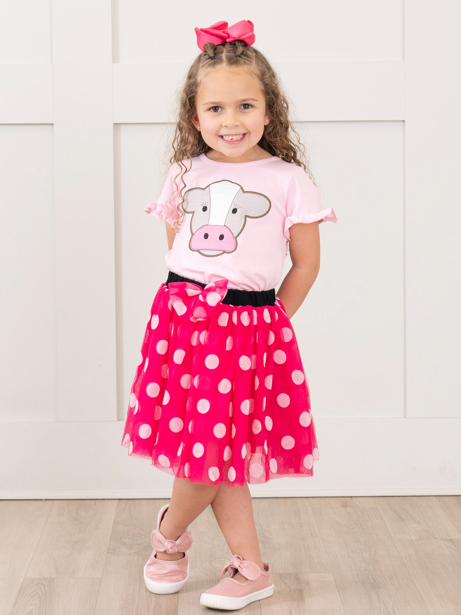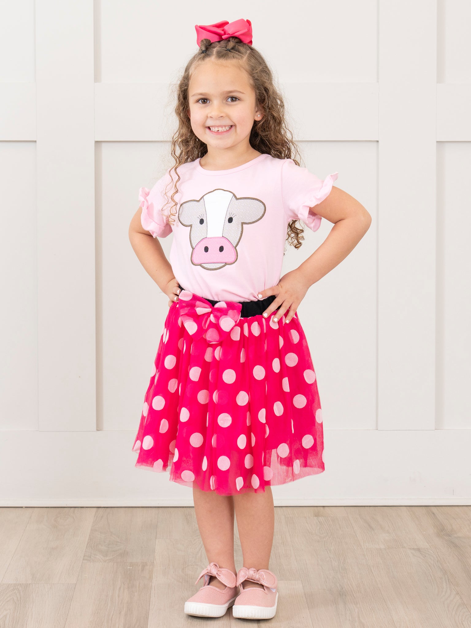 Moo-ve over boring outfits, the Embroidered Cow Tulle Outfit is here! Featuring a pink ruffle sleeve top with an adorable embroidered cow, paired with a fun and flouncy pink polka dot tulle skirt. Perfect for farm fun and available exclusively from Marie Nicole Clothing. Moo-vellous!