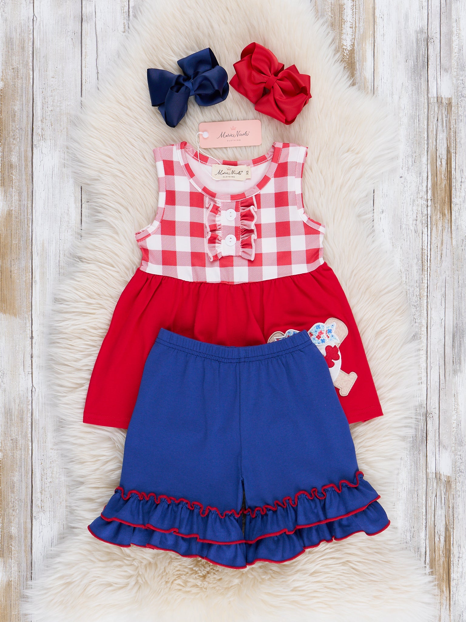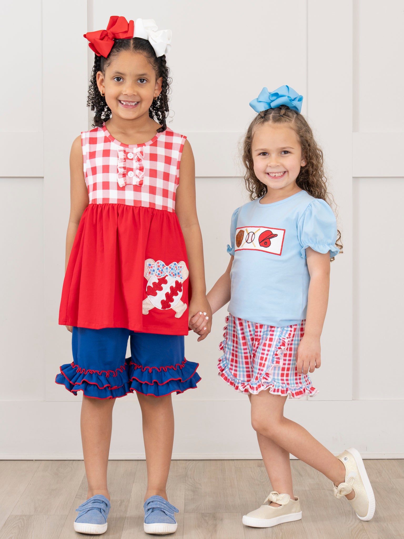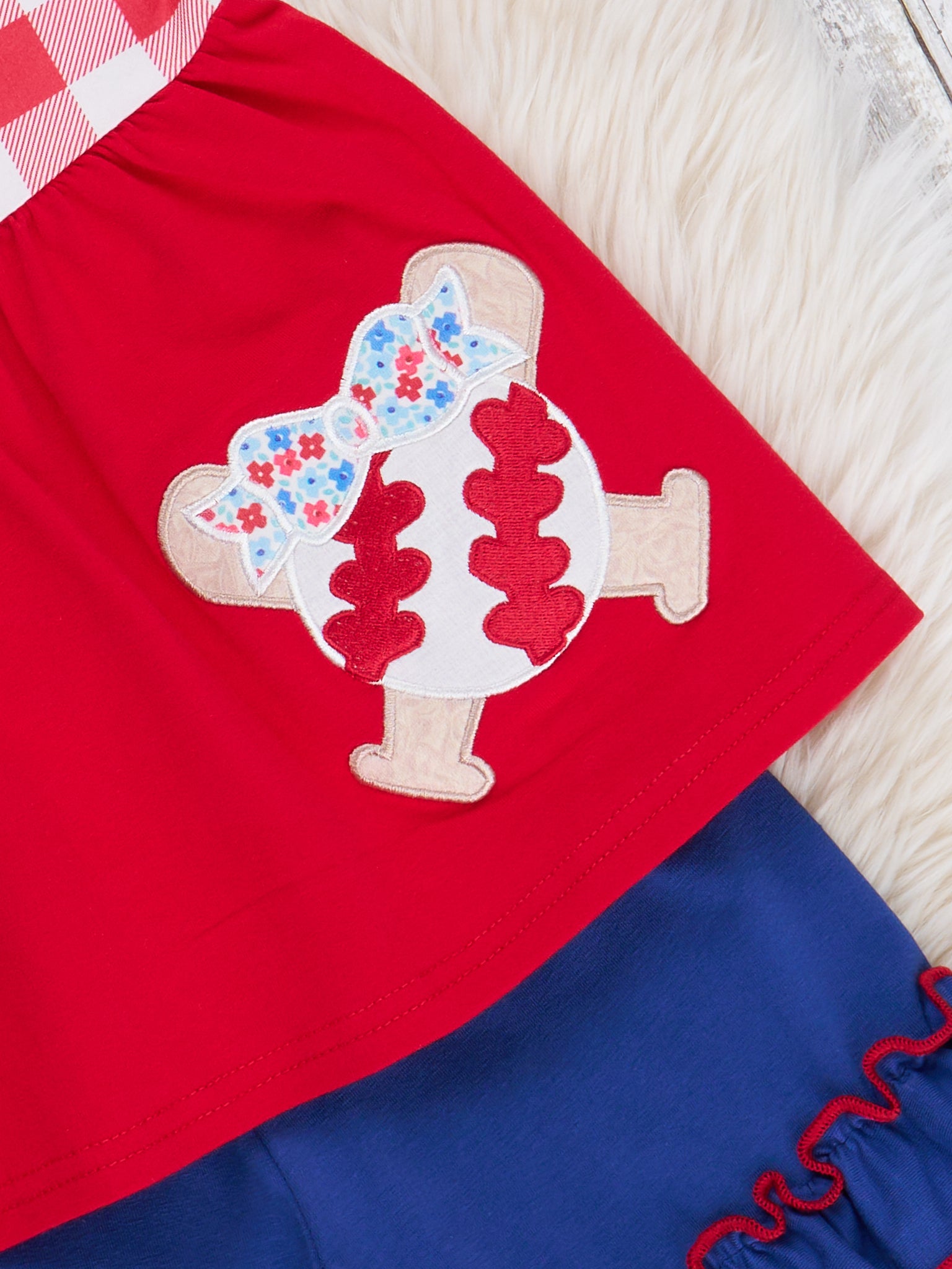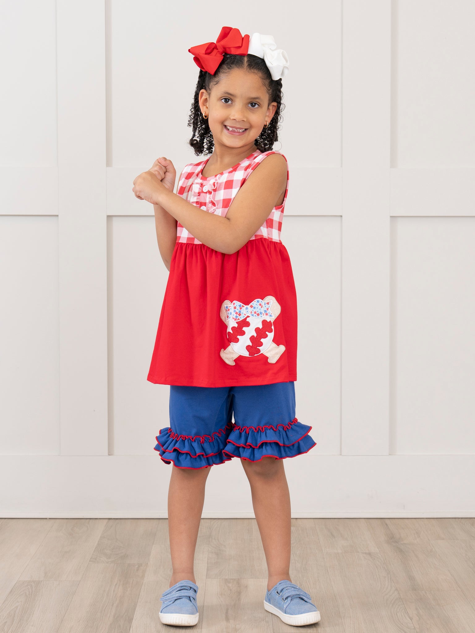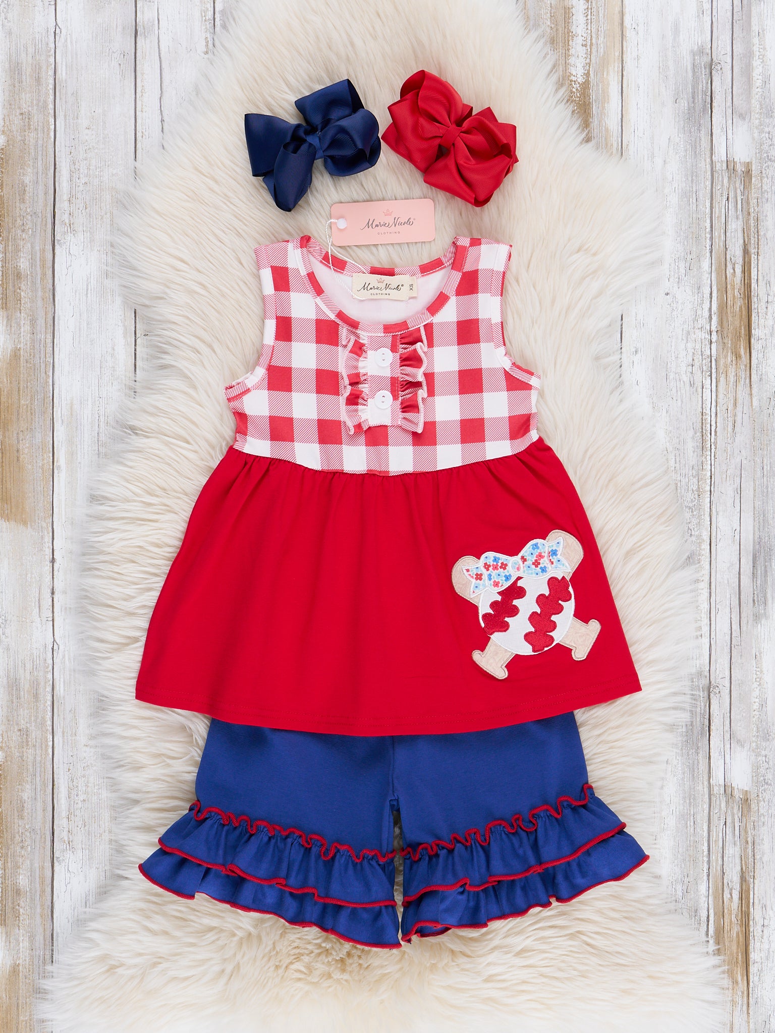 Get ready for a home run in this Marie Nicole Clothing girls outfit. The red top with gingham bodice and embroidered baseball details pairs perfectly with the blue ruffle hem shorts for a grand slam look. Don't forget to check out the sibling set!