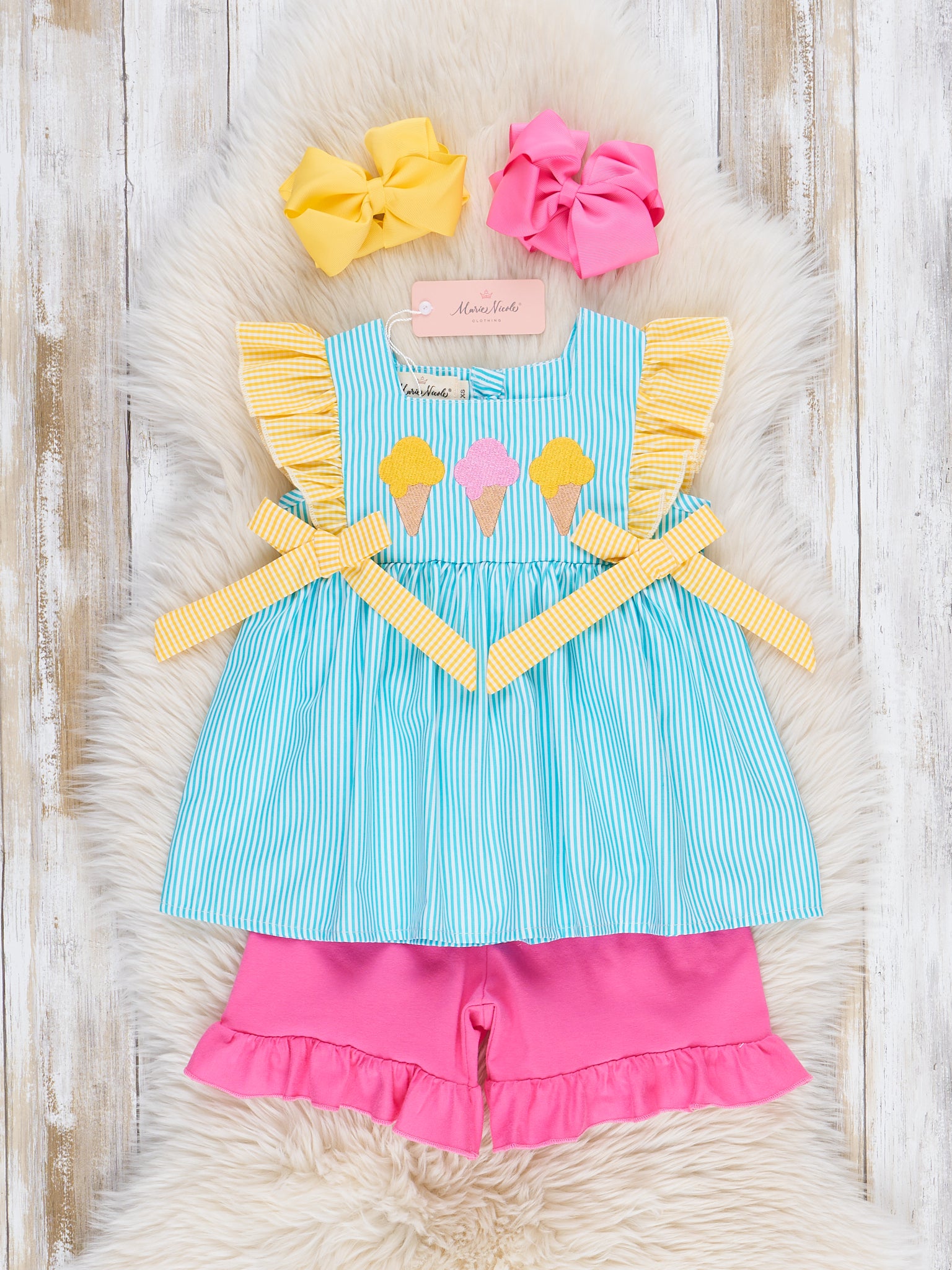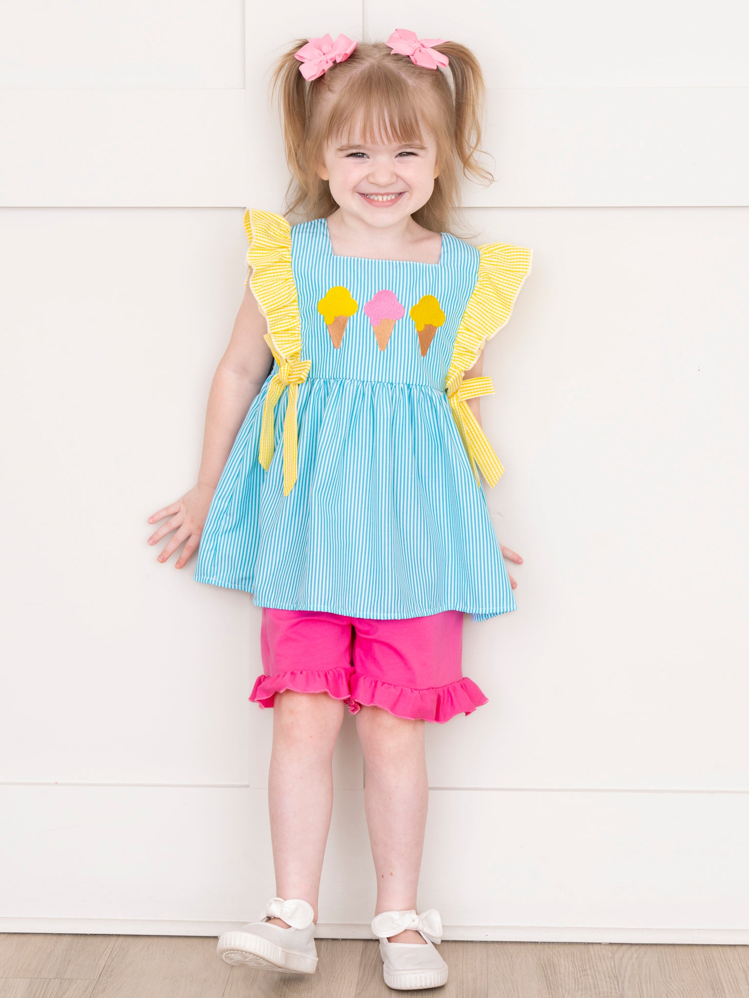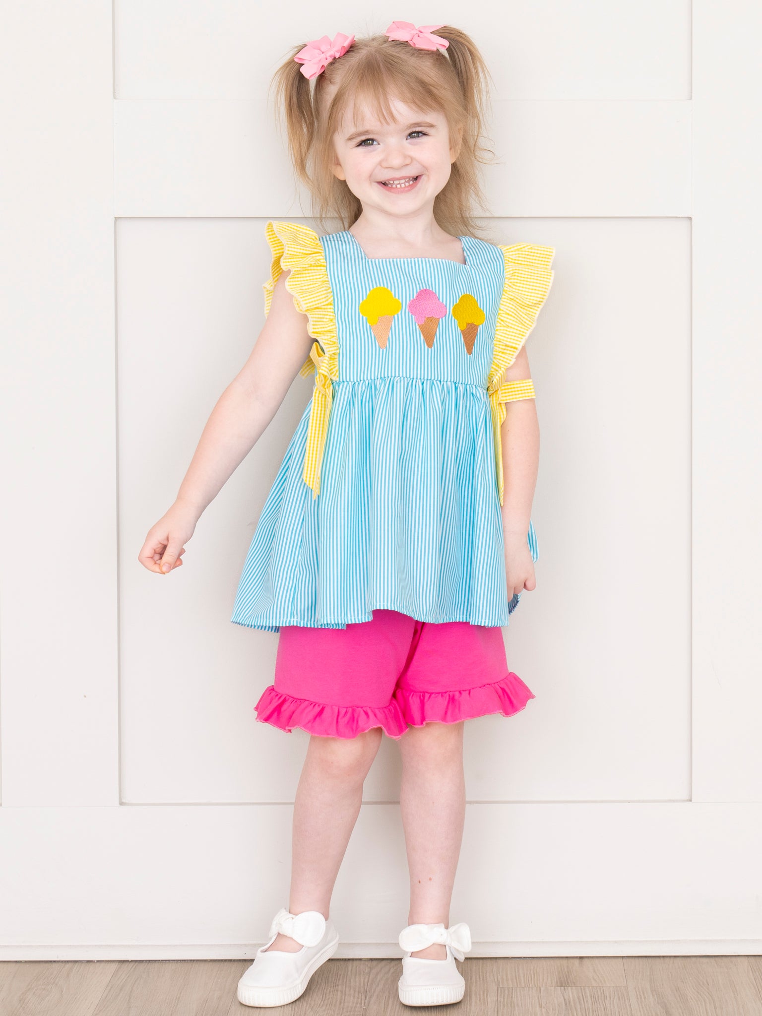 Brighten up summer days with the Neon Ice Cream Cones Ruffle Outfit from Marie Nicole Clothing! This playful set features fun ruffle detailing with embroidered ice cream cones that scream sweet summer fun. Made from soft, breathable cotton, it’s perfect for keeping little ones cool and comfy on sunny adventures.