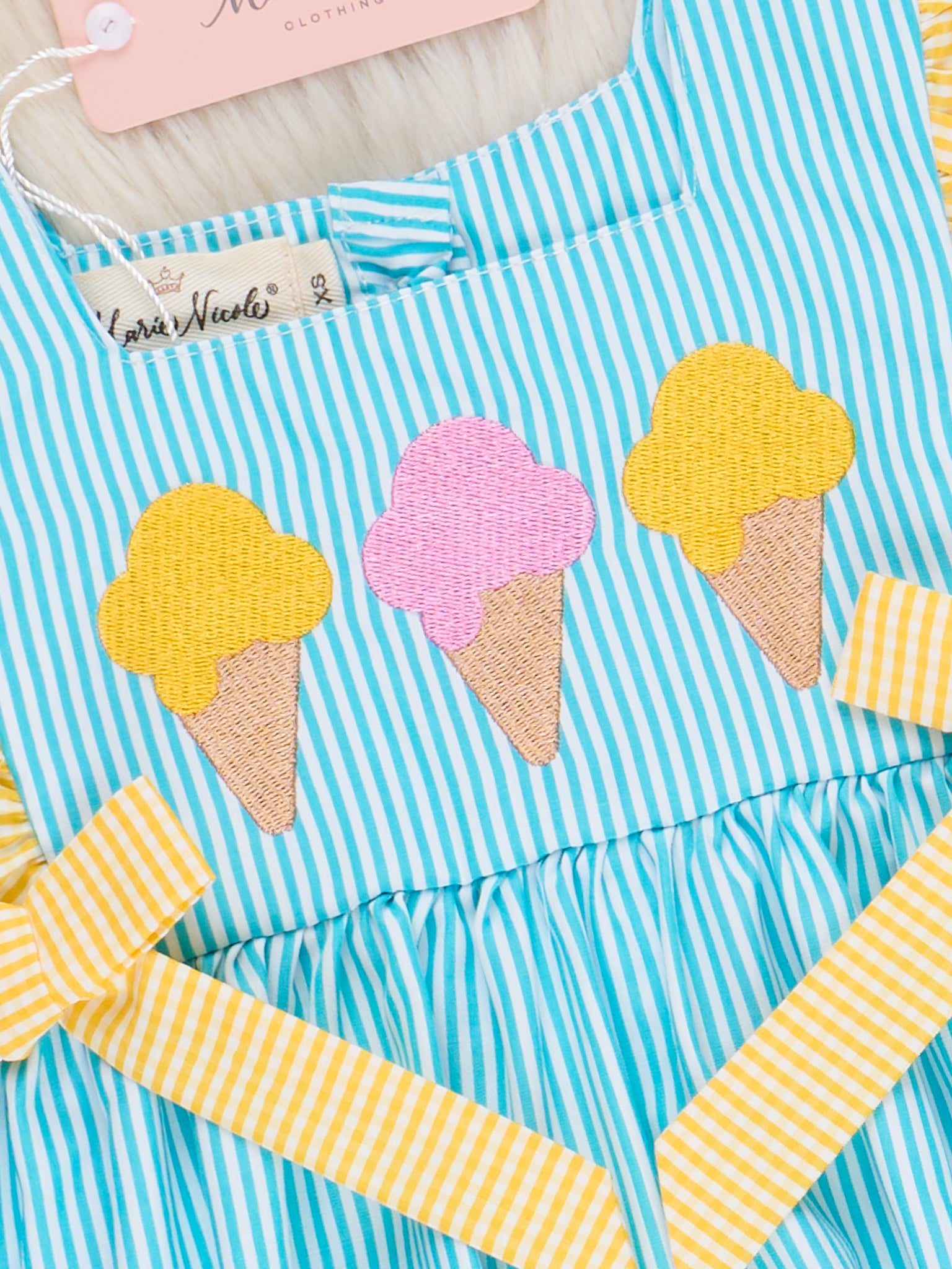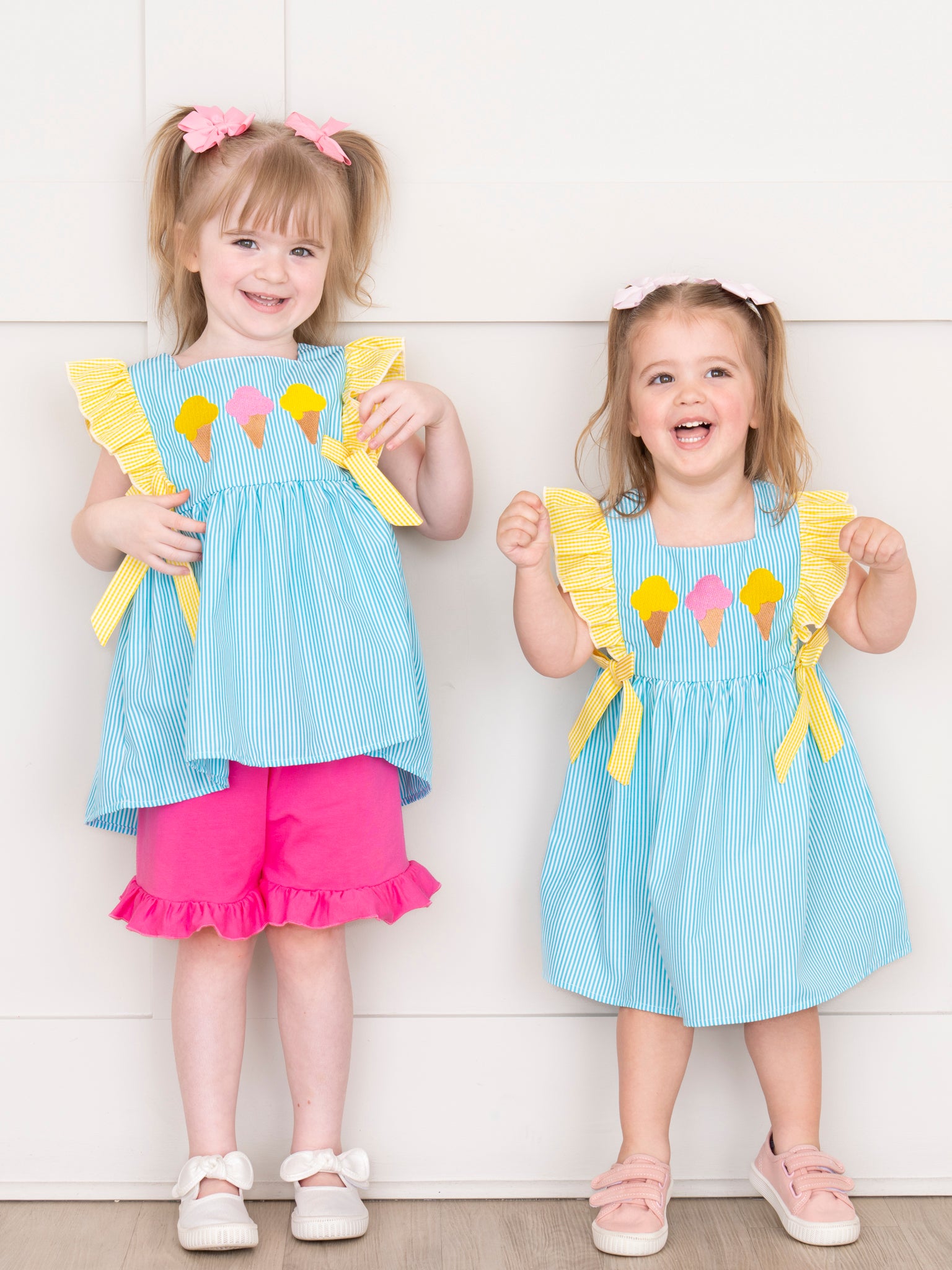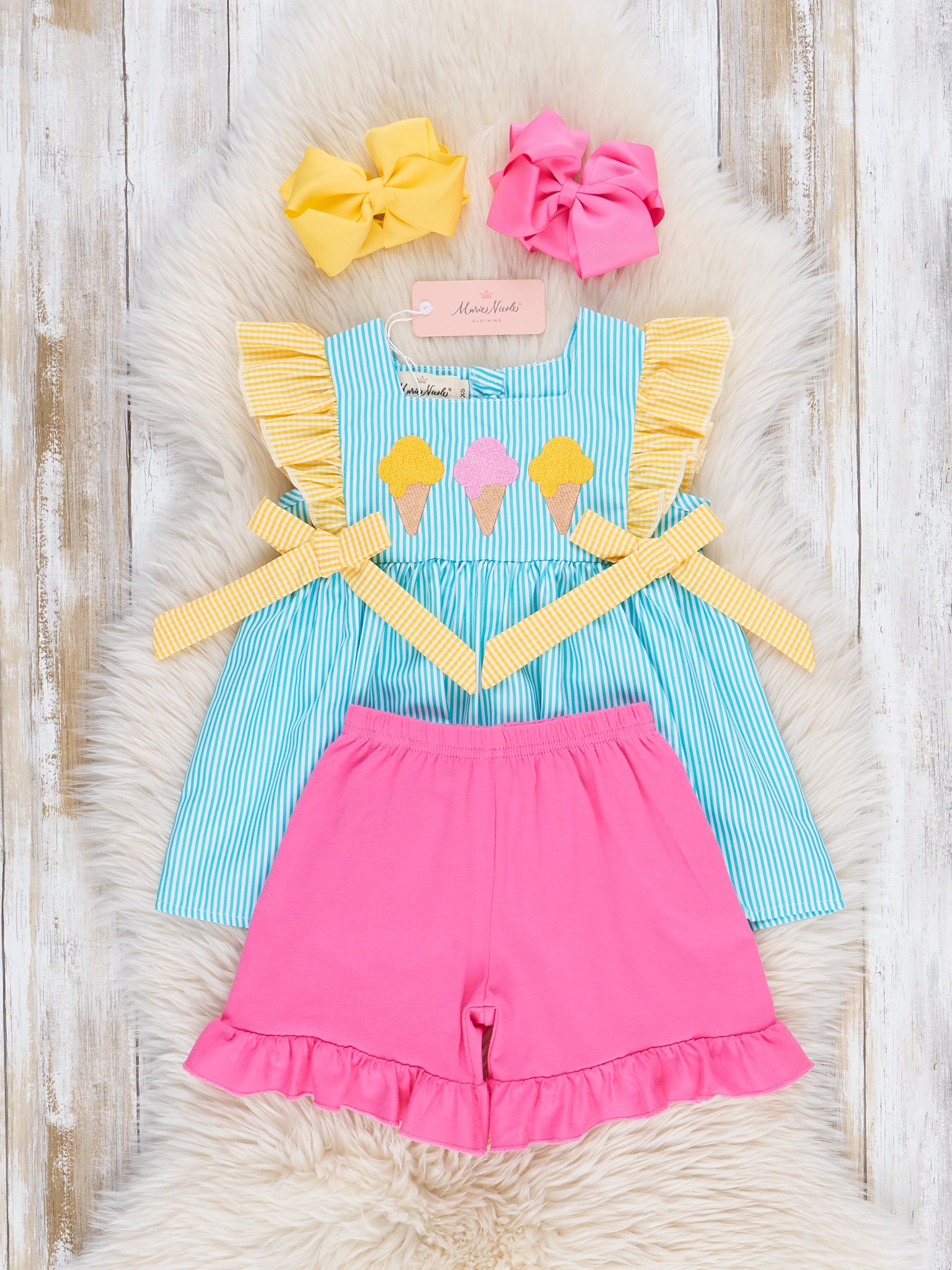 Brighten up summer days with the Neon Ice Cream Cones Ruffle Outfit from Marie Nicole Clothing! This playful set features fun ruffle detailing with embroidered ice cream cones that scream sweet summer fun. Made from soft, breathable cotton, it’s perfect for keeping little ones cool and comfy on sunny adventures.