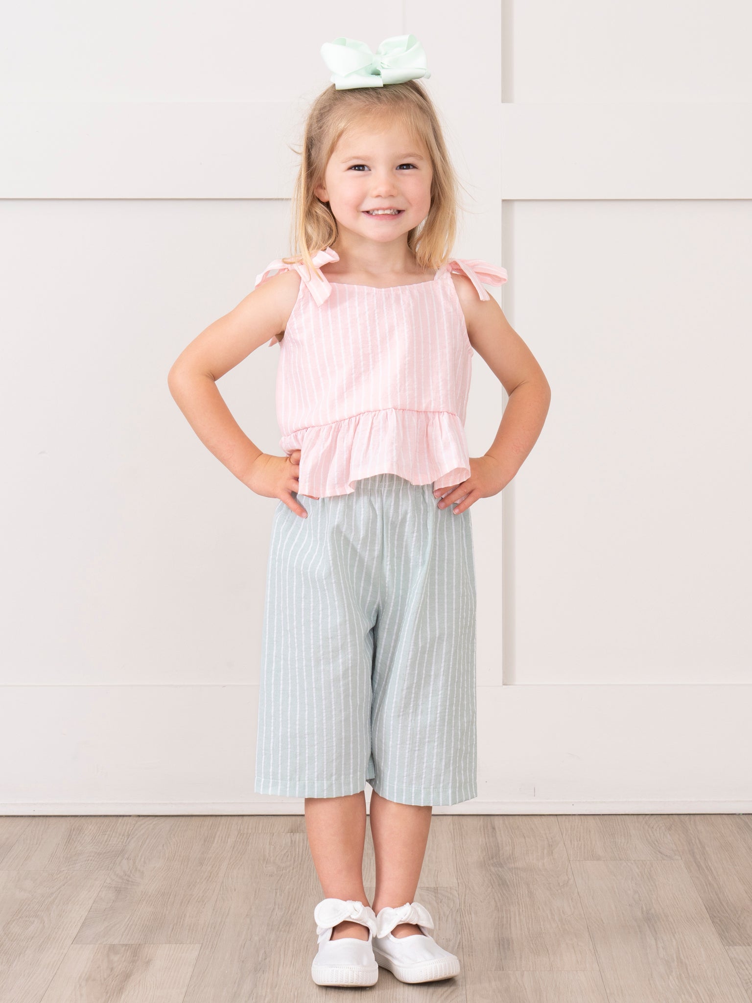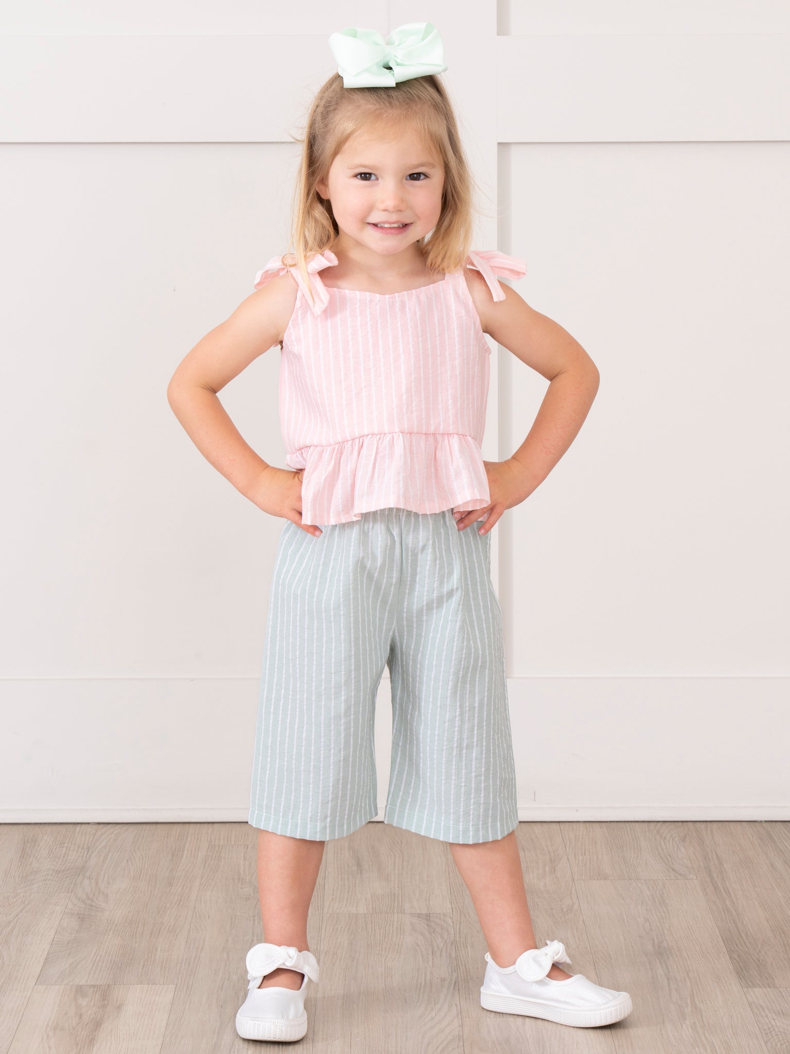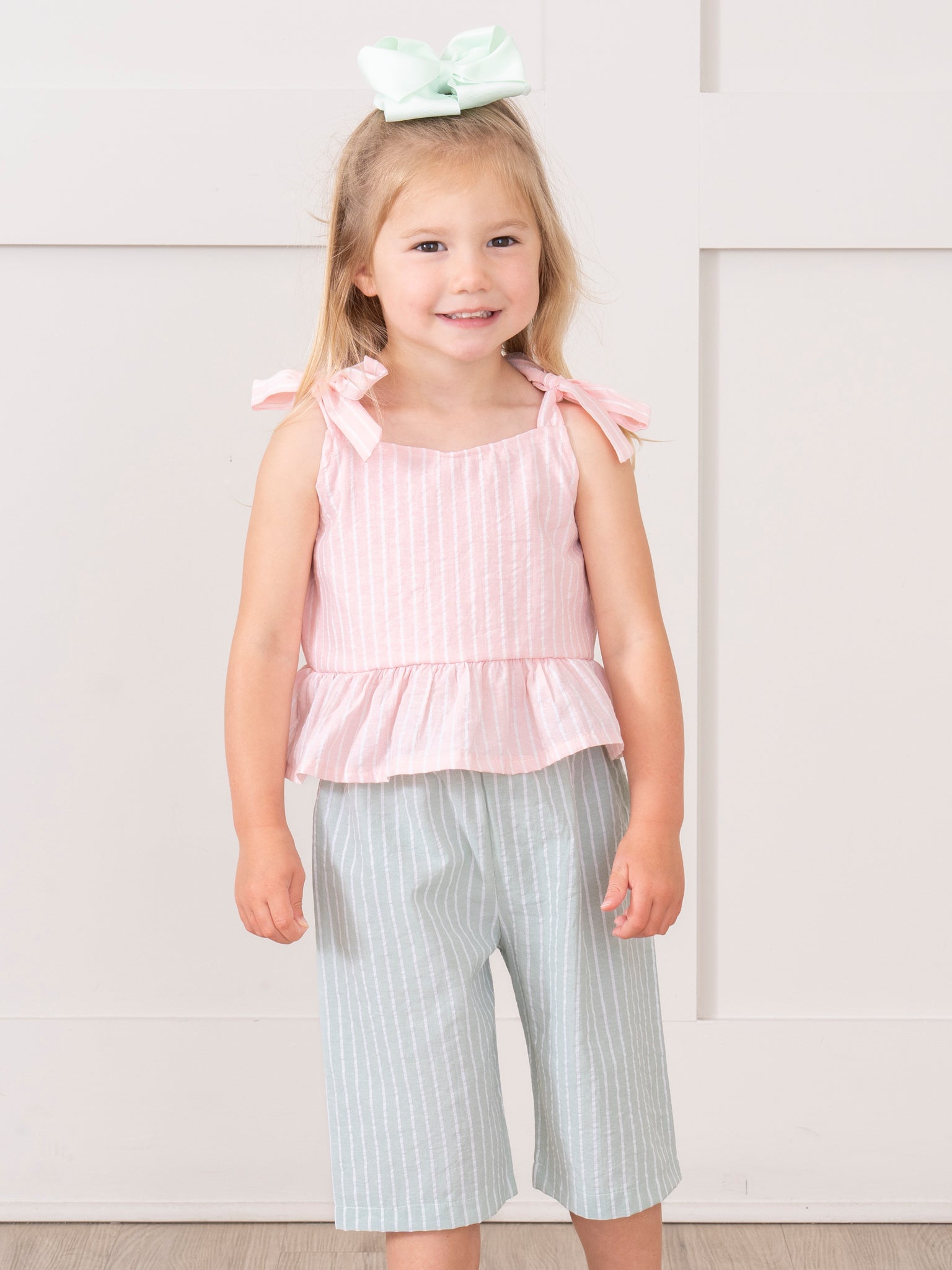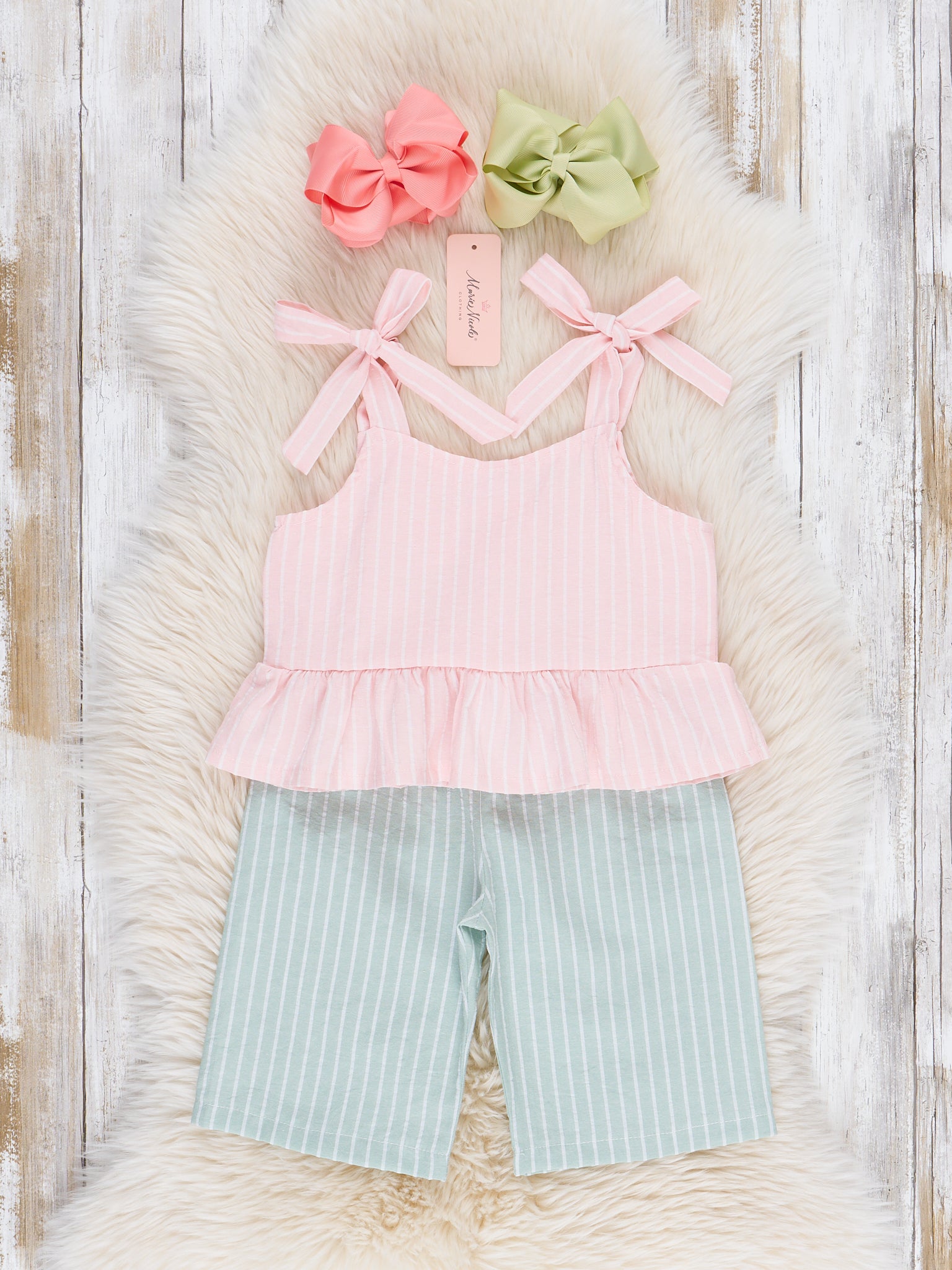 Soft hues and sweet details come together in the Striped Pastels Peplum Ruffle Outfit. This charming set features a pastel-striped top with a playful peplum hem and delicate ruffle accent, paired with coordinating bottoms for an effortlessly cute look. This outfit from Marie Nicole Clothing is perfect for warm days or special outings.