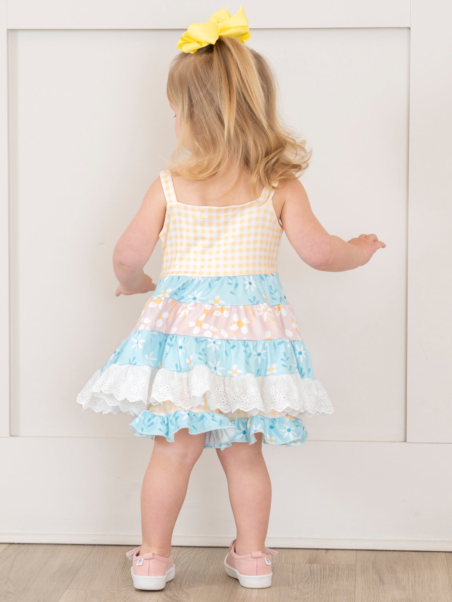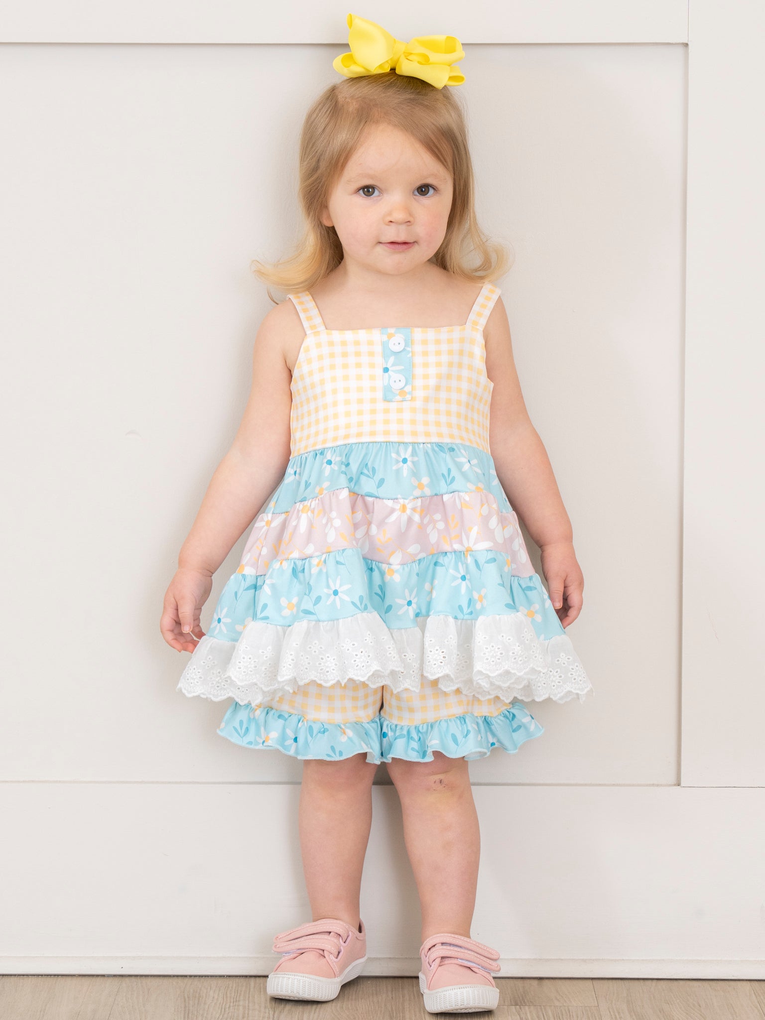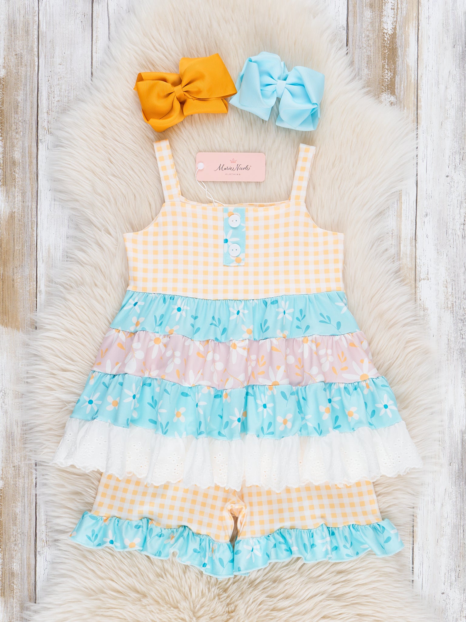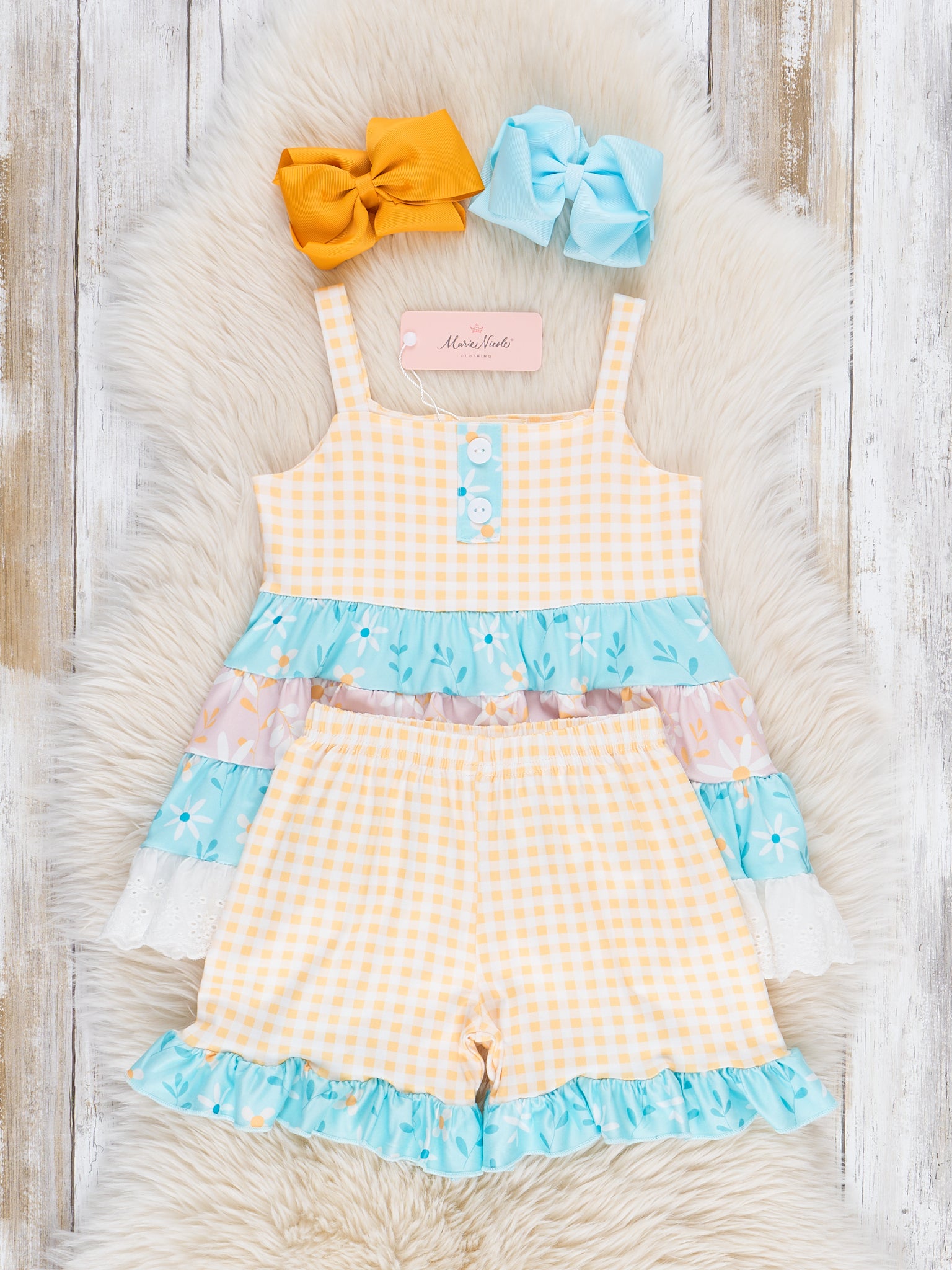 Get ready for some sweet summer fun with our Sweet Gingham Floral Ruffle Outfit! This girls' outfit features a playful yellow gingham bodice top boasting a tiered pink and blue floral swing hem. The matching yellow shorts have a fun blue floral ruffle hem for added flair. Perfect for sisters, this set is from Marie Nicole Clothing.